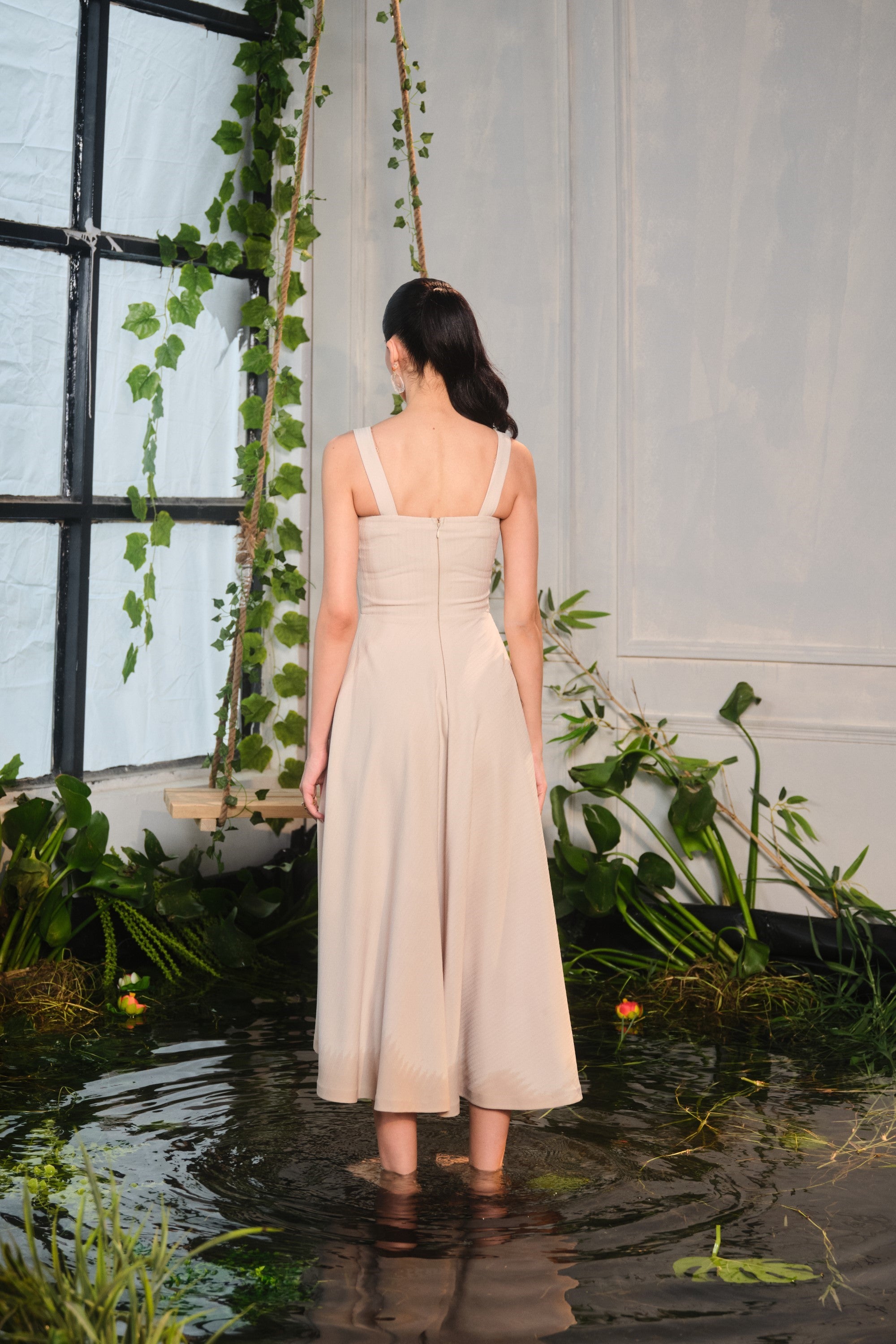 A soft creme beige dress with delicate floral appliqué work, designed in an A-line calf-length silhouette. Crafted from exclusive jersey crepe for a smooth, flattering fit.