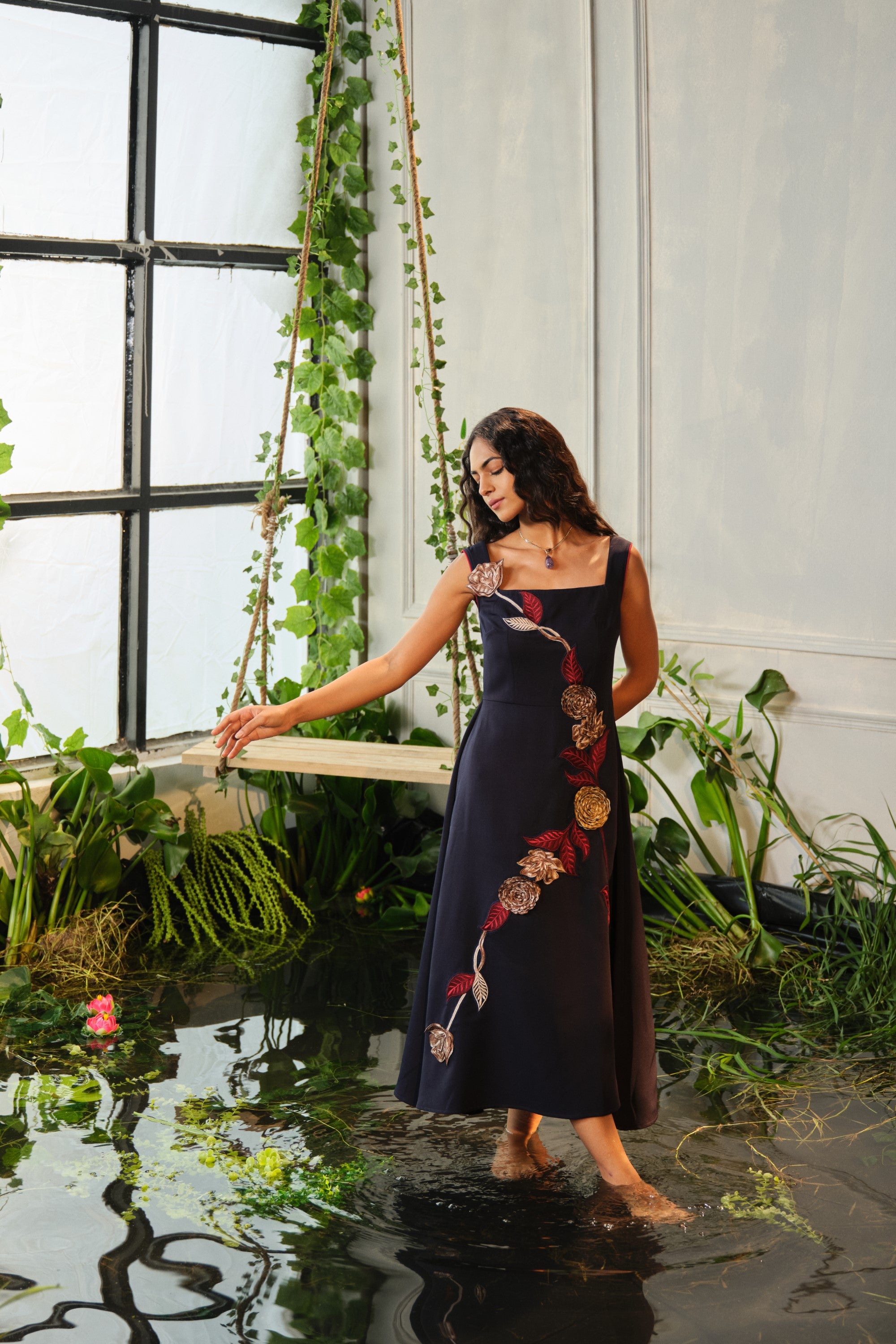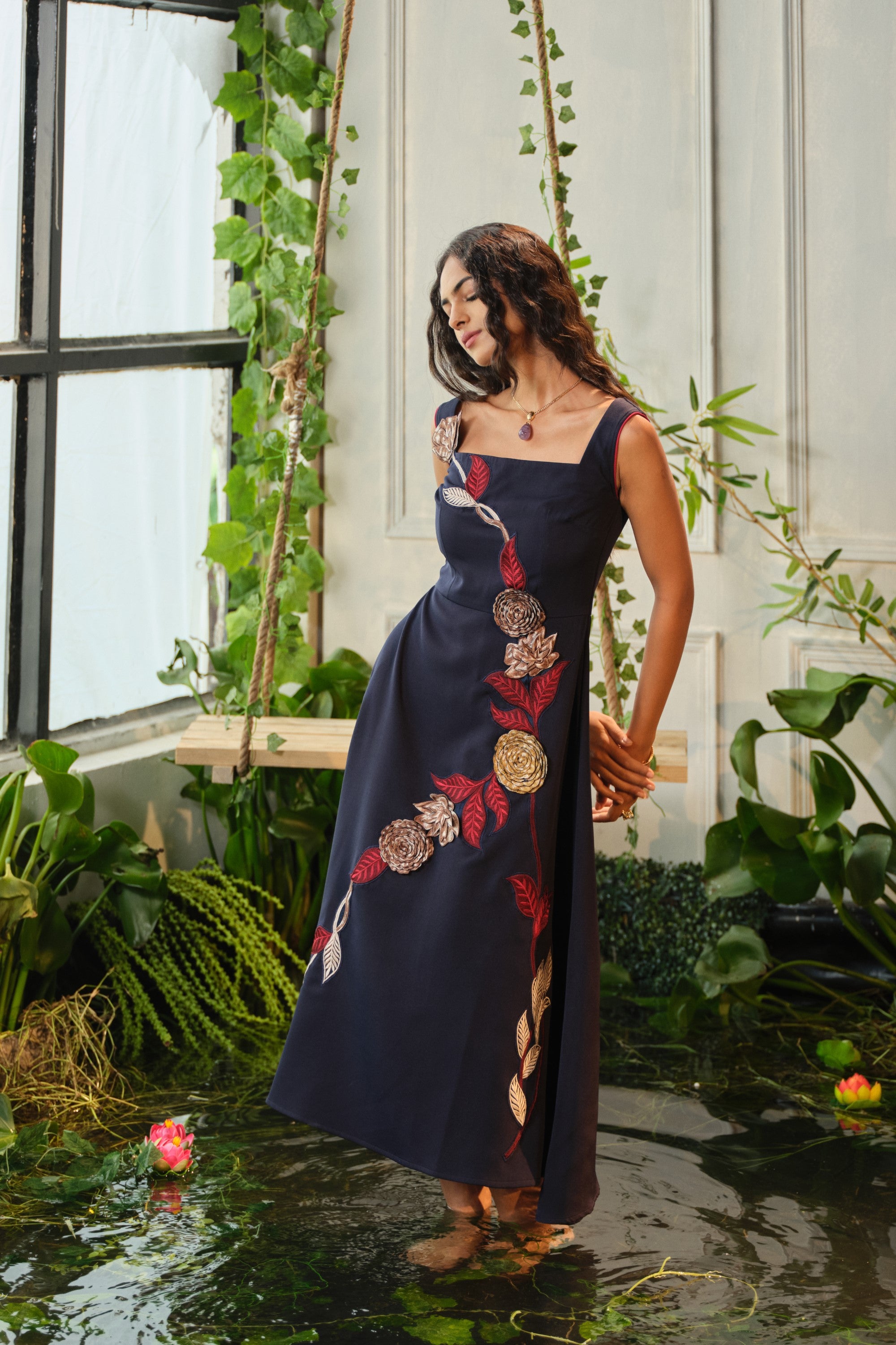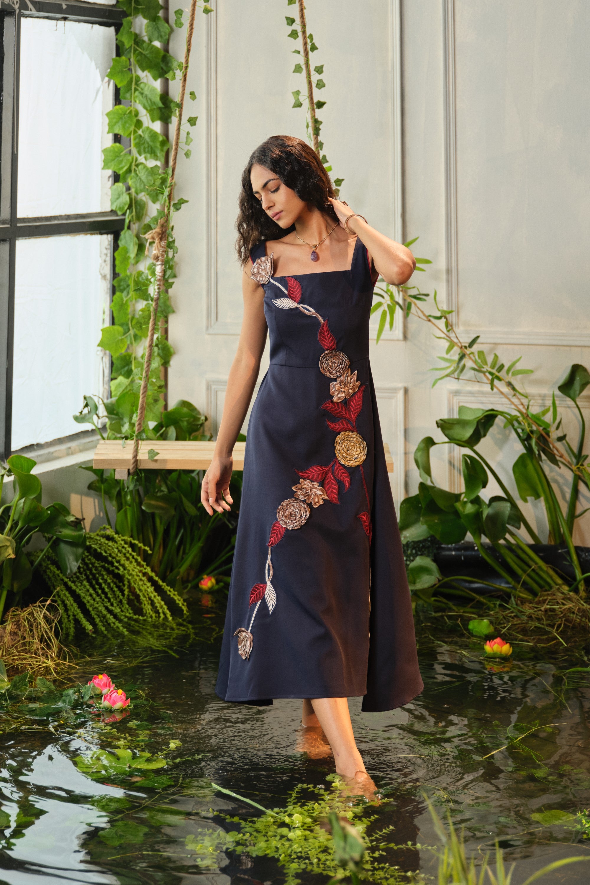 This Caia blue embroidered dress is crafted in premium crepe fabric and finished with fine floral appliqué. A flattering A-line cut that sits at calf-length—ideal for both casual and special days.