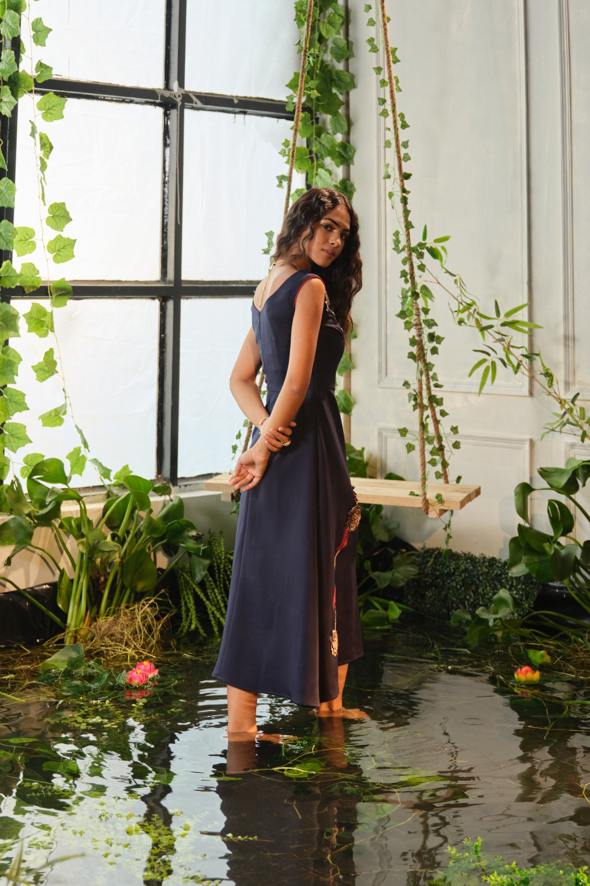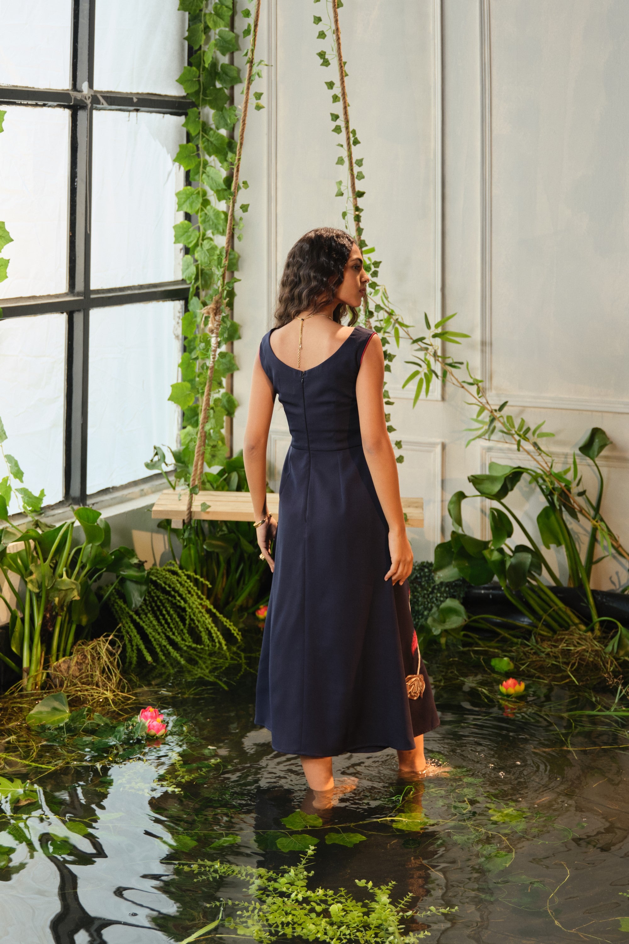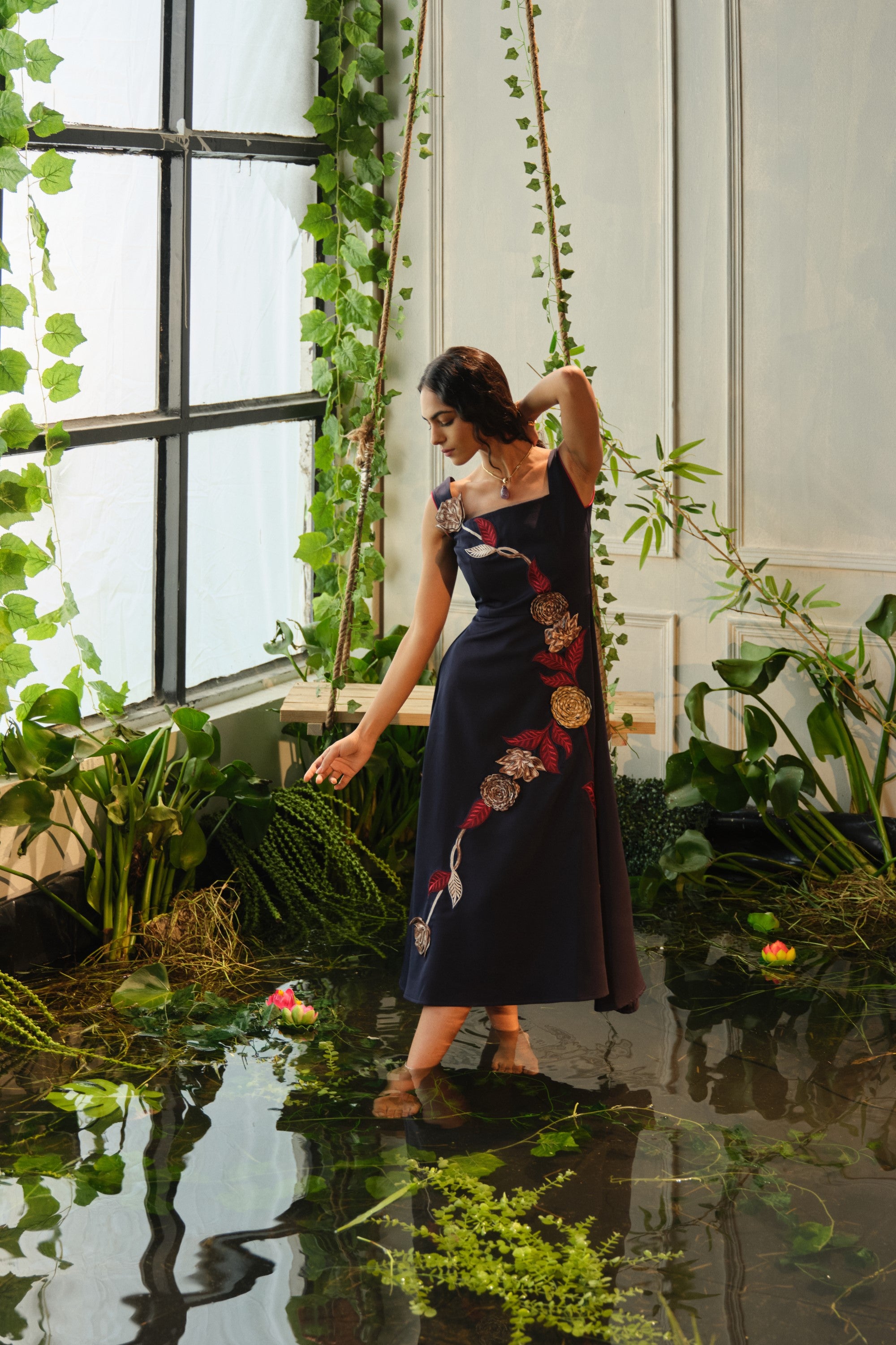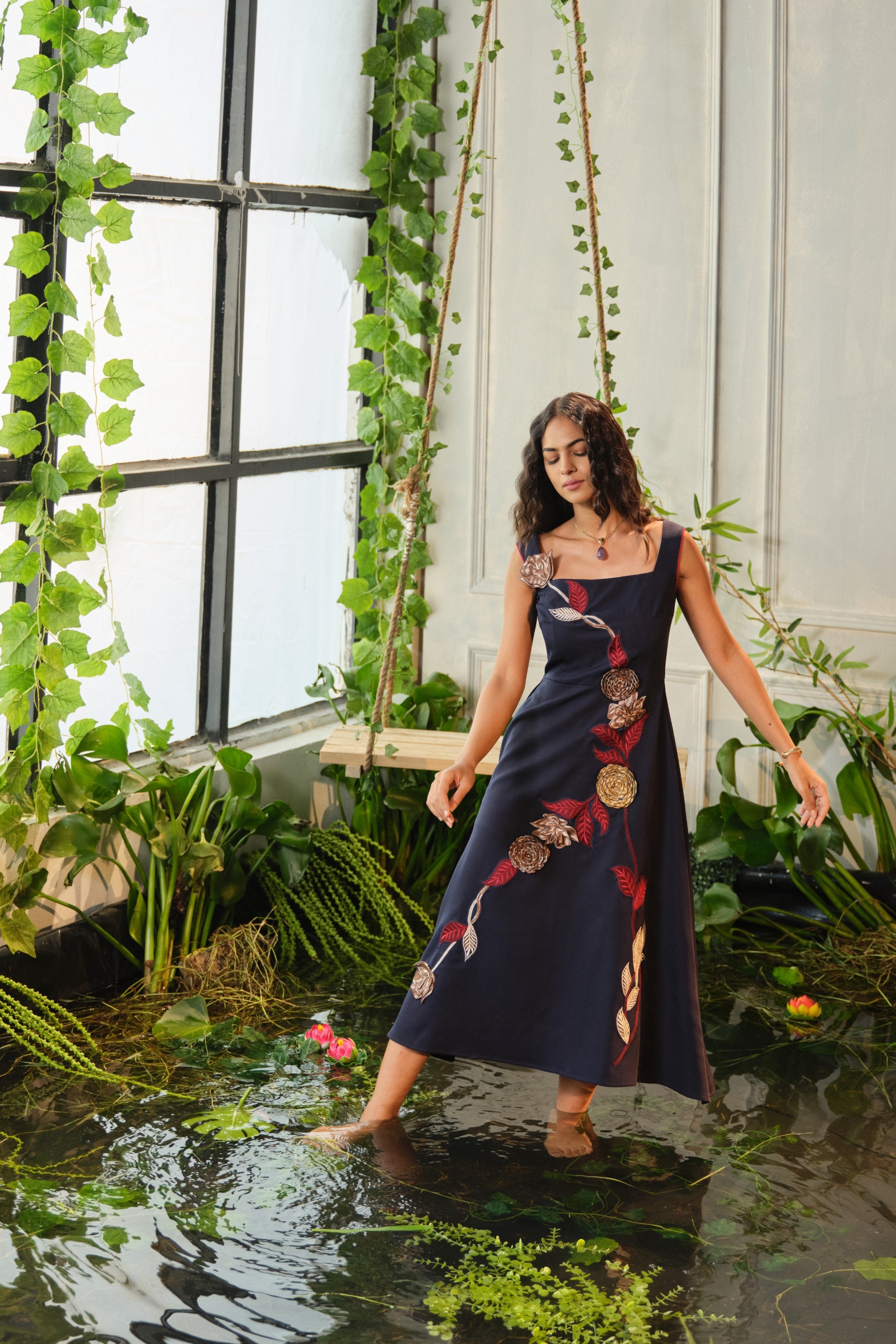 This Caia blue embroidered dress is crafted in premium crepe fabric and finished with fine floral appliqué. A flattering A-line cut that sits at calf-length—ideal for both casual and special days.