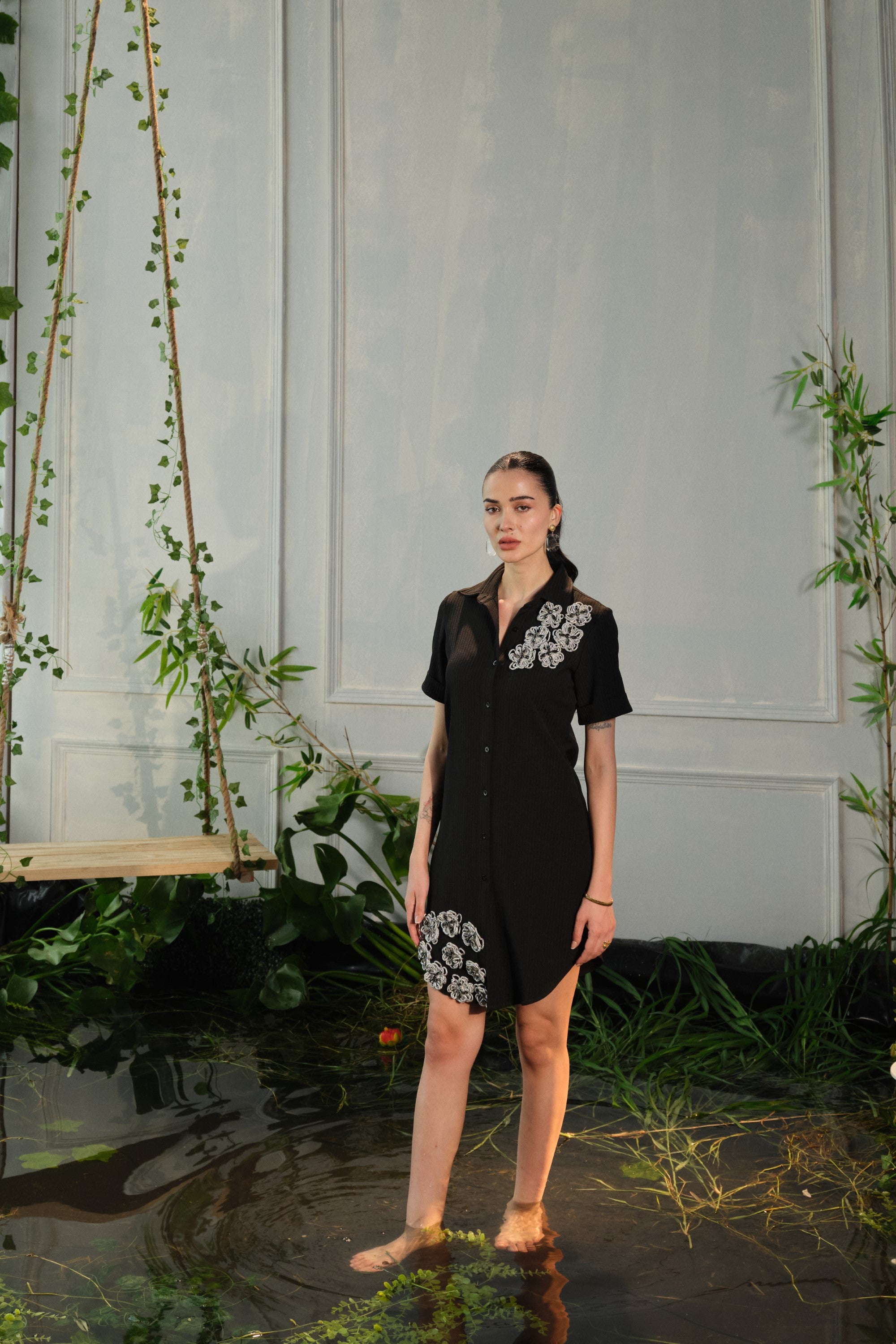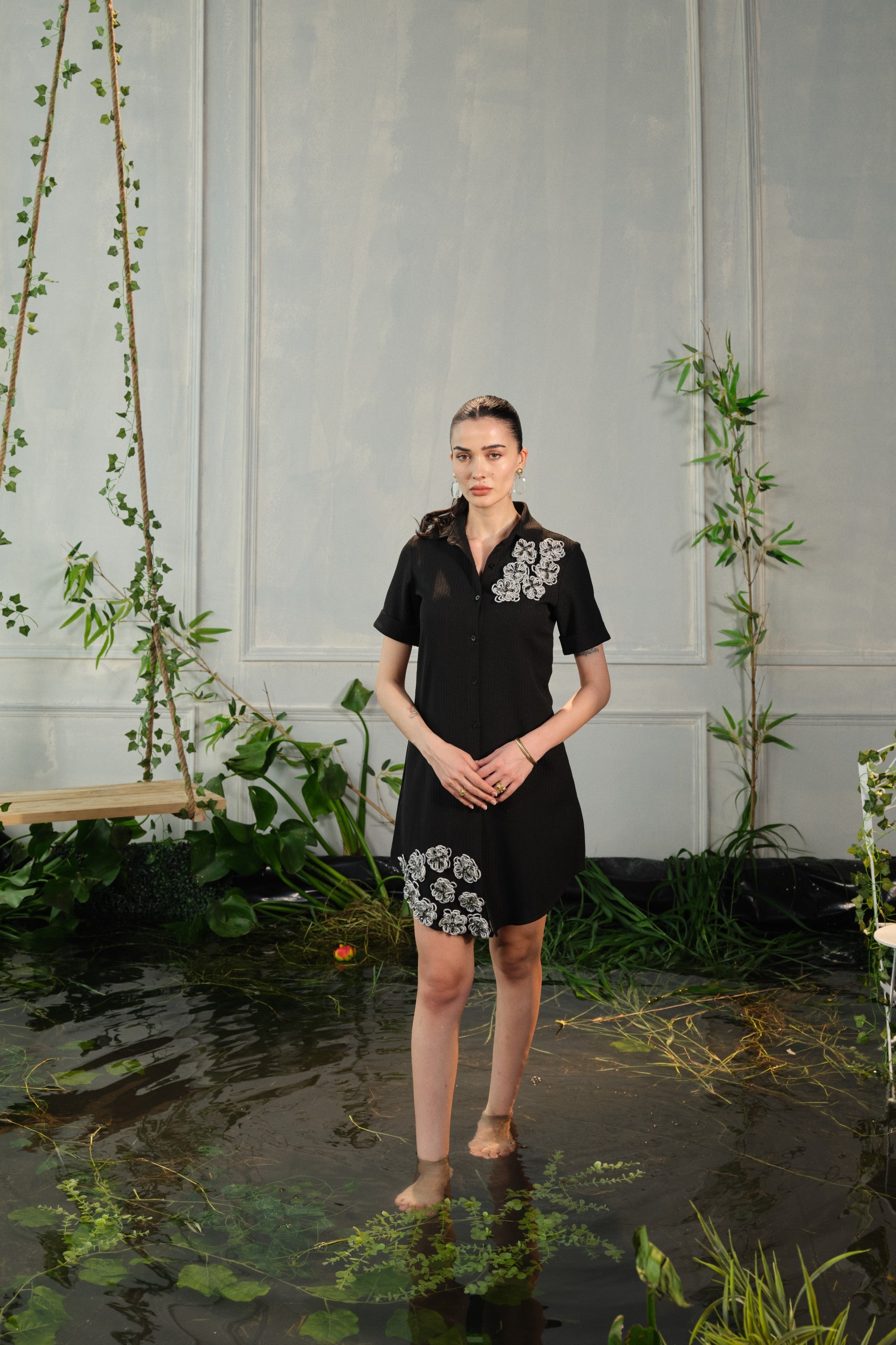 Made in breathable jersey crepe, this buttoned shirt dress features a relaxed fit and eye-catching 3D dori floral embroidery—effortless charm for any day.