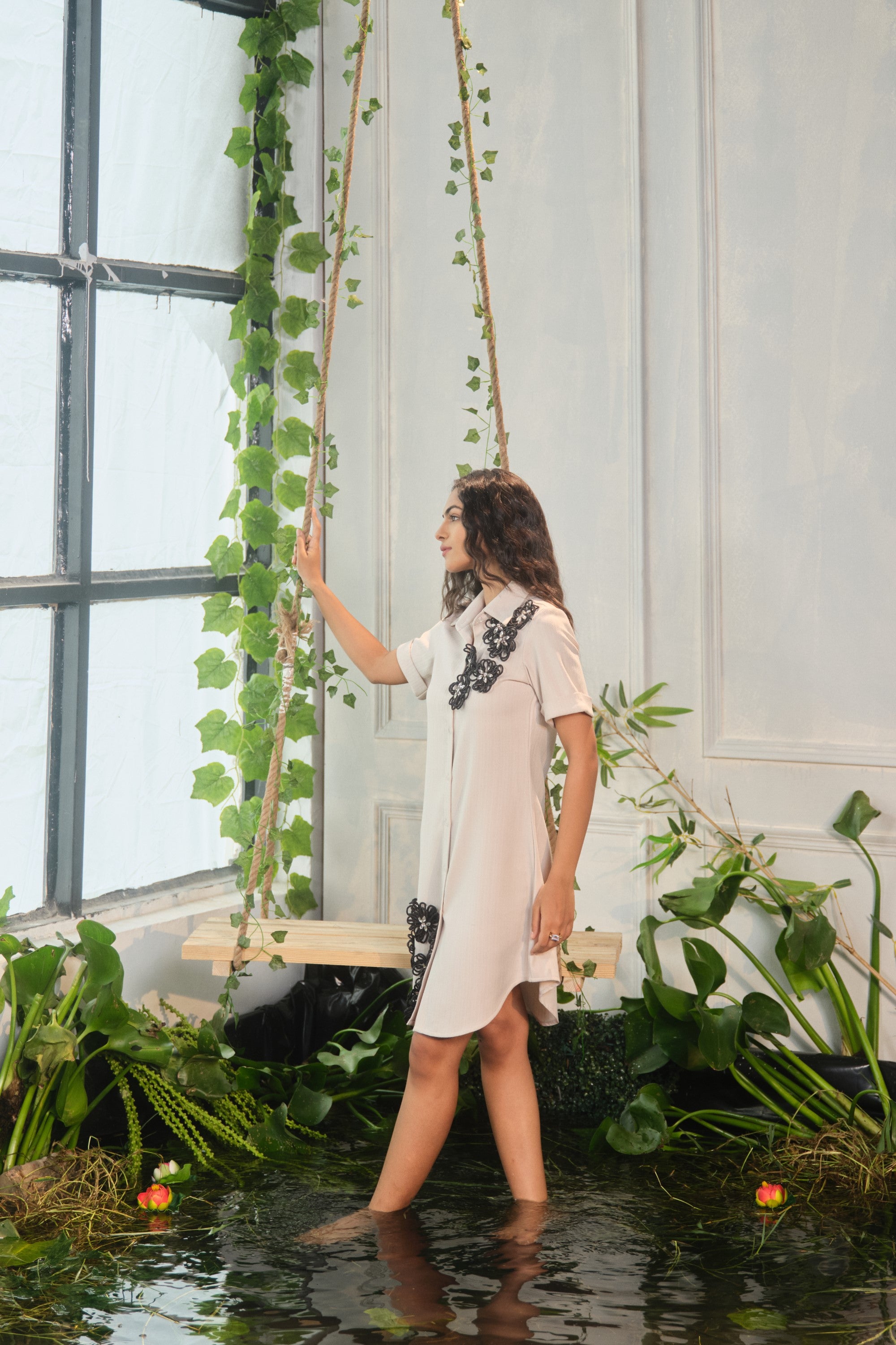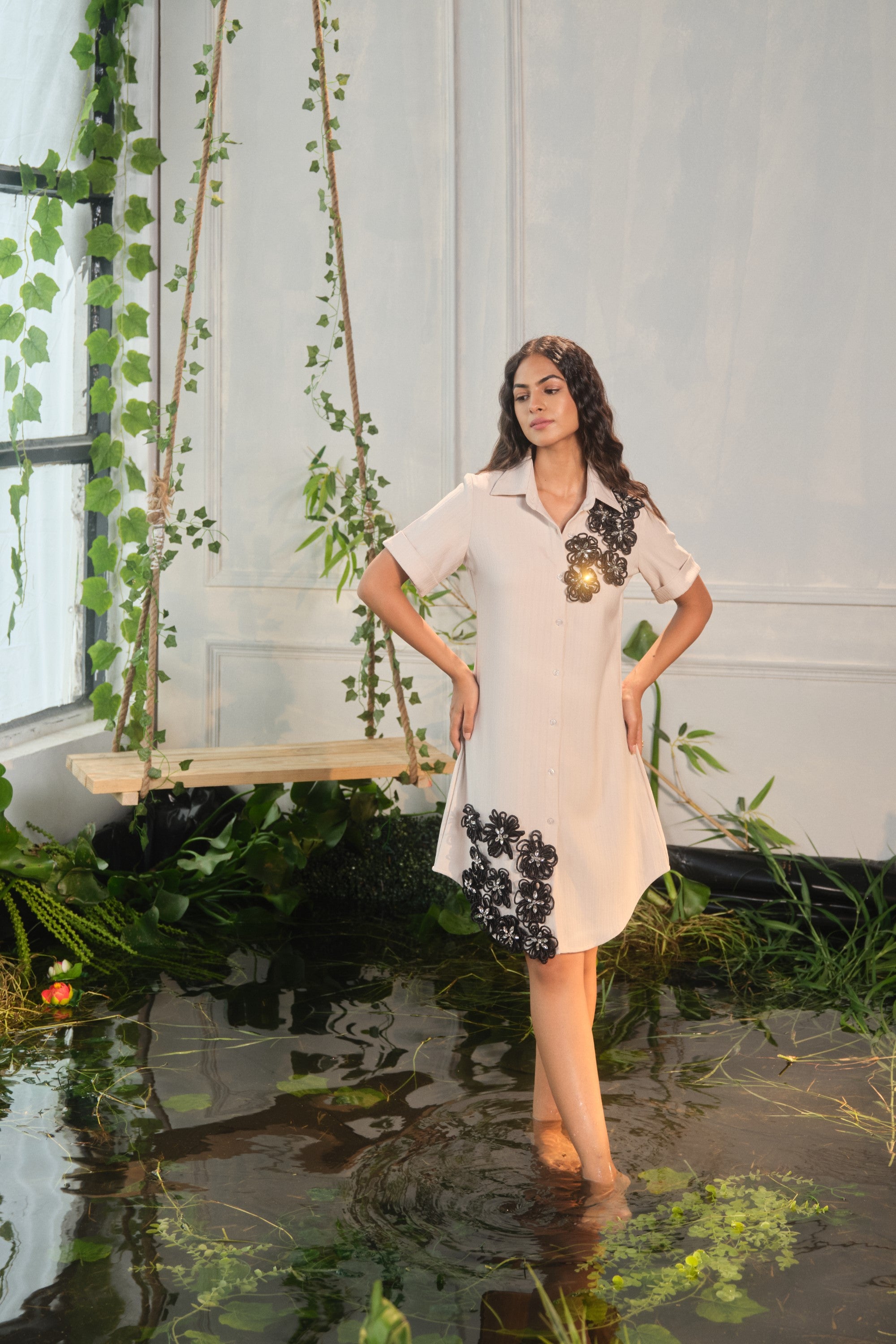 A comfort-fit button-down shirt dress crafted in jersey crepe, adorned with delicate 3D dori floral embroidery for a soft, feminine touch.