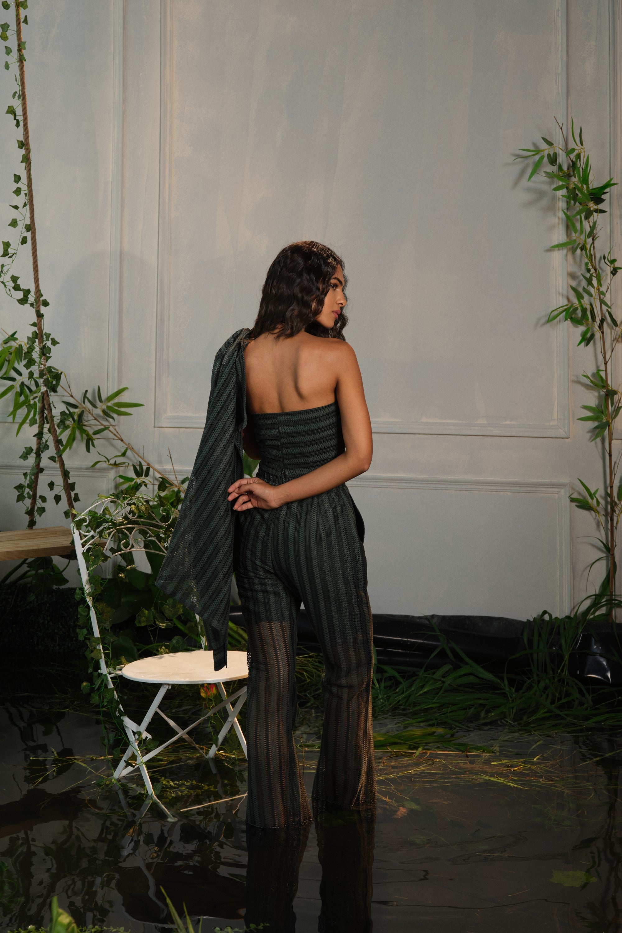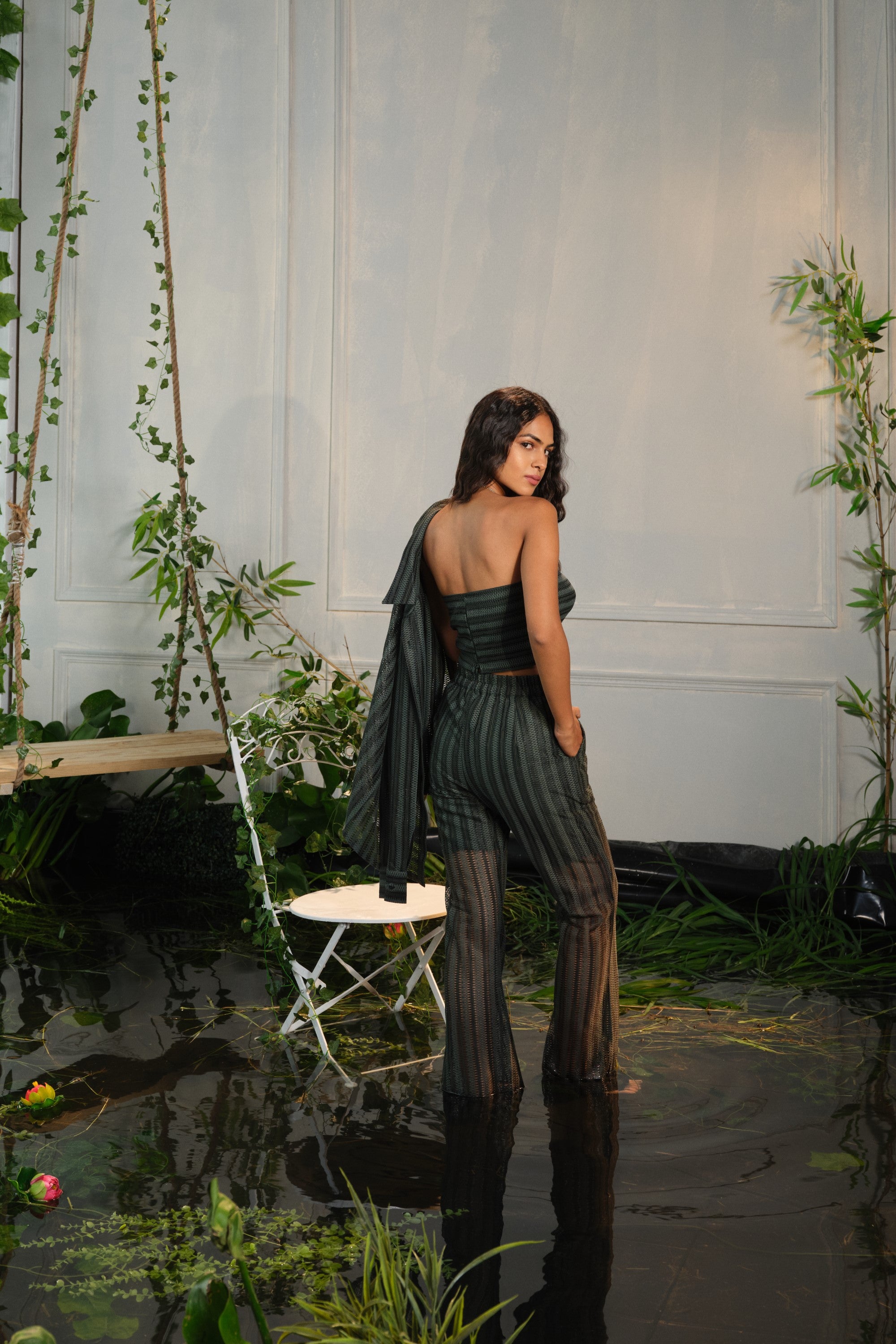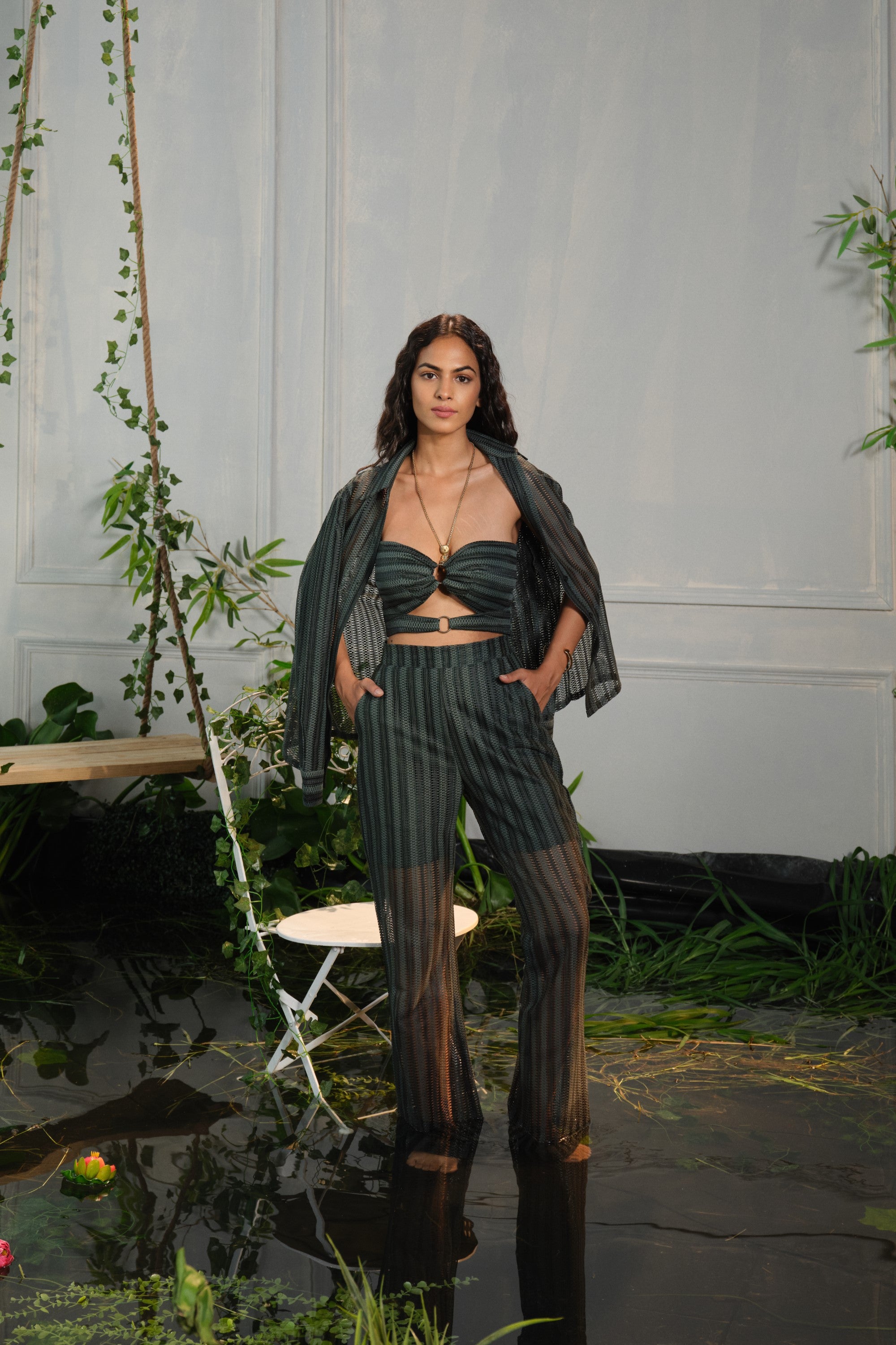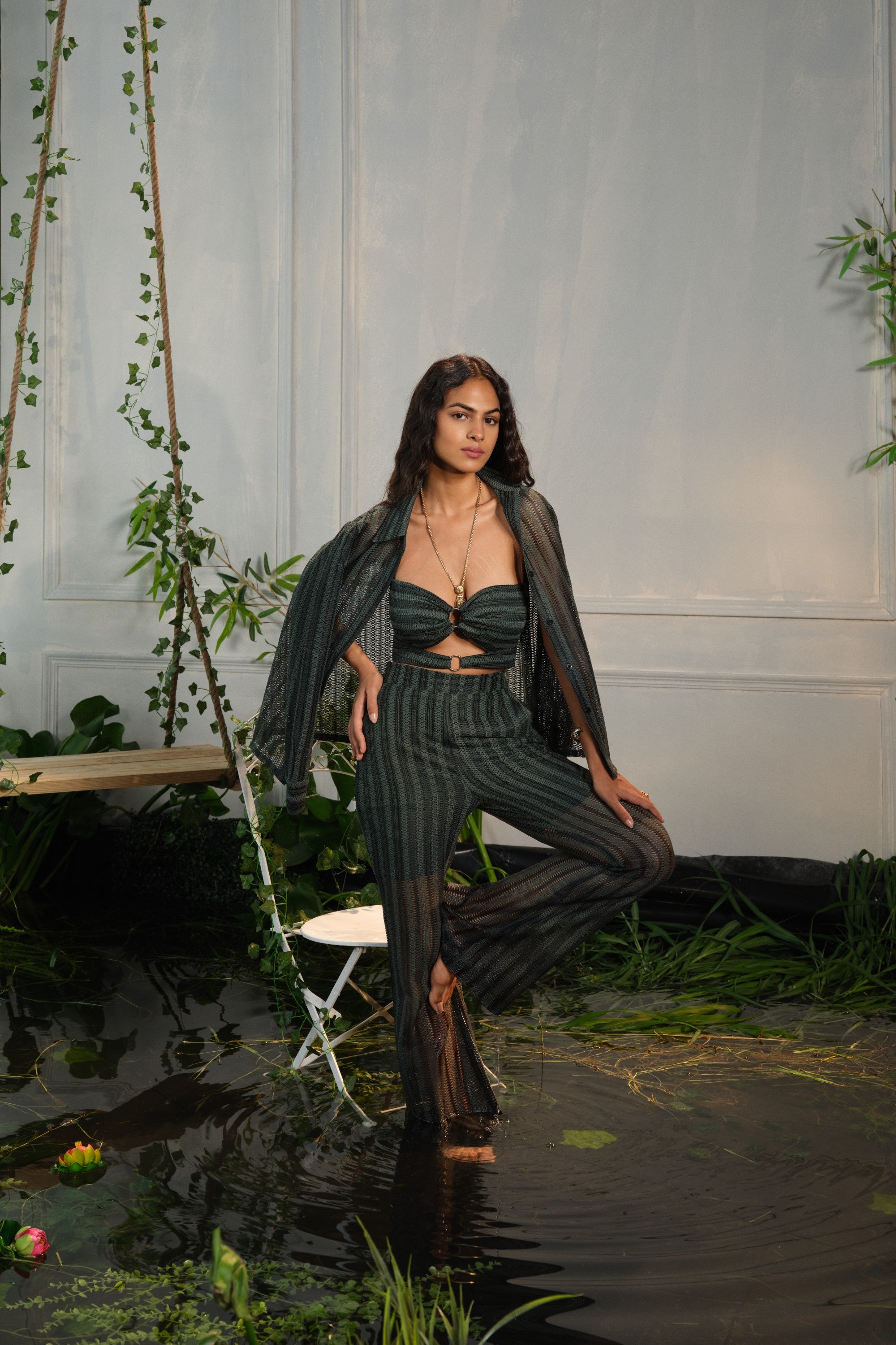 Featuring a textured crochet bustier in Marina green with a buckle front, styled with half-lined comfort-fit pants and a matching overlay shirt. Made in soft crochet knit for a statement yet wearable look.