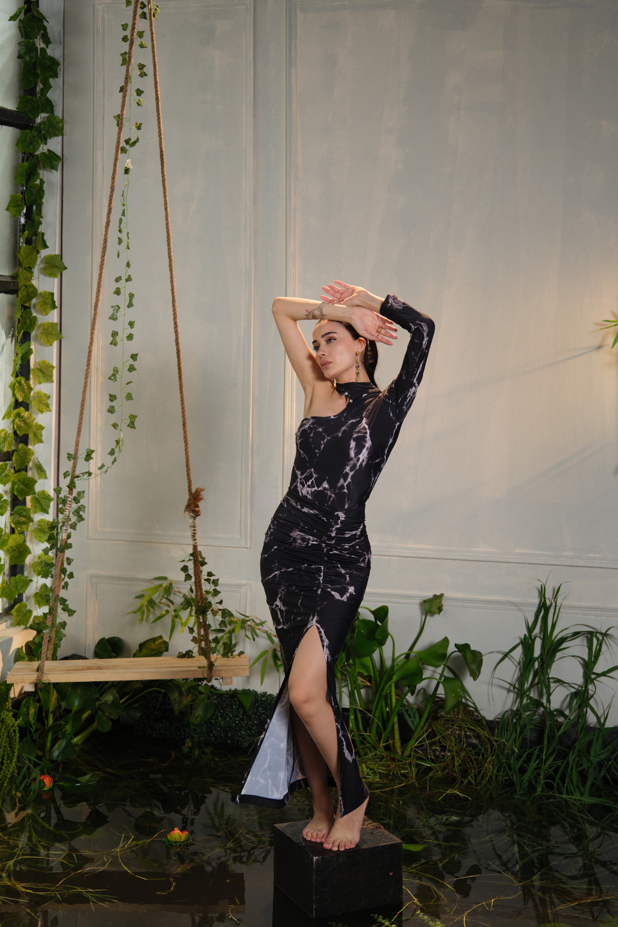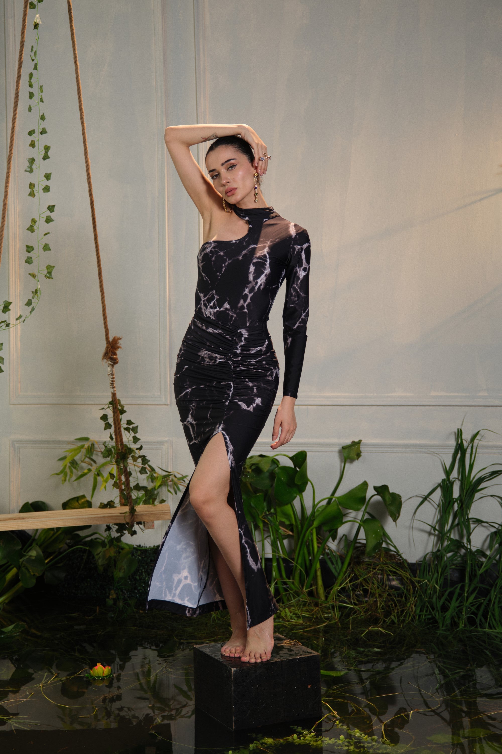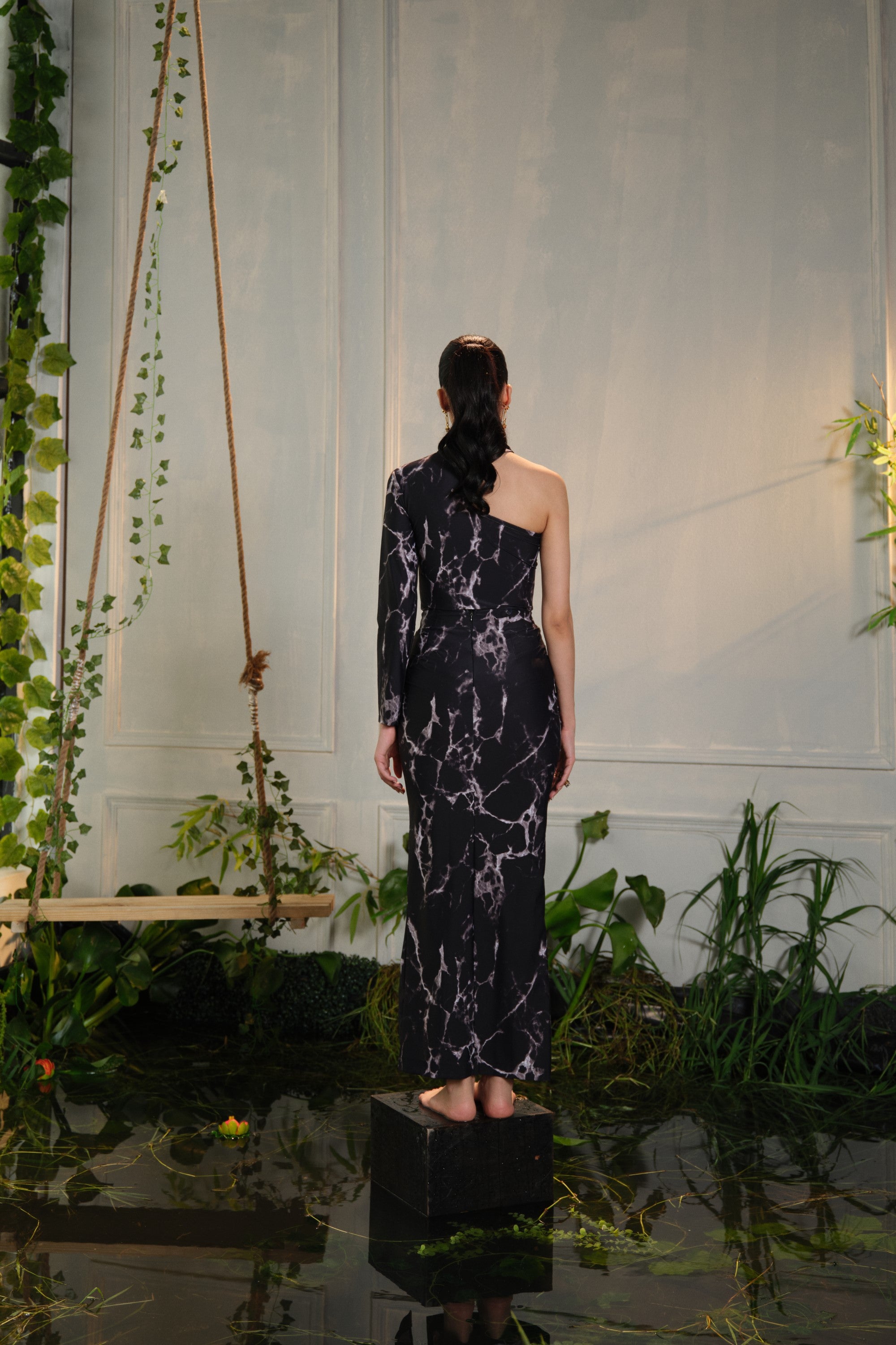 Make a statement in the marble-textured gathered slit skirt paired with a sleek one-shoulder bodysuit. Crafted from premium imported nylon lycra, this power duo hugs in all the right places—blending bold textures with modern elegance for a look that’s effortlessly stunning!