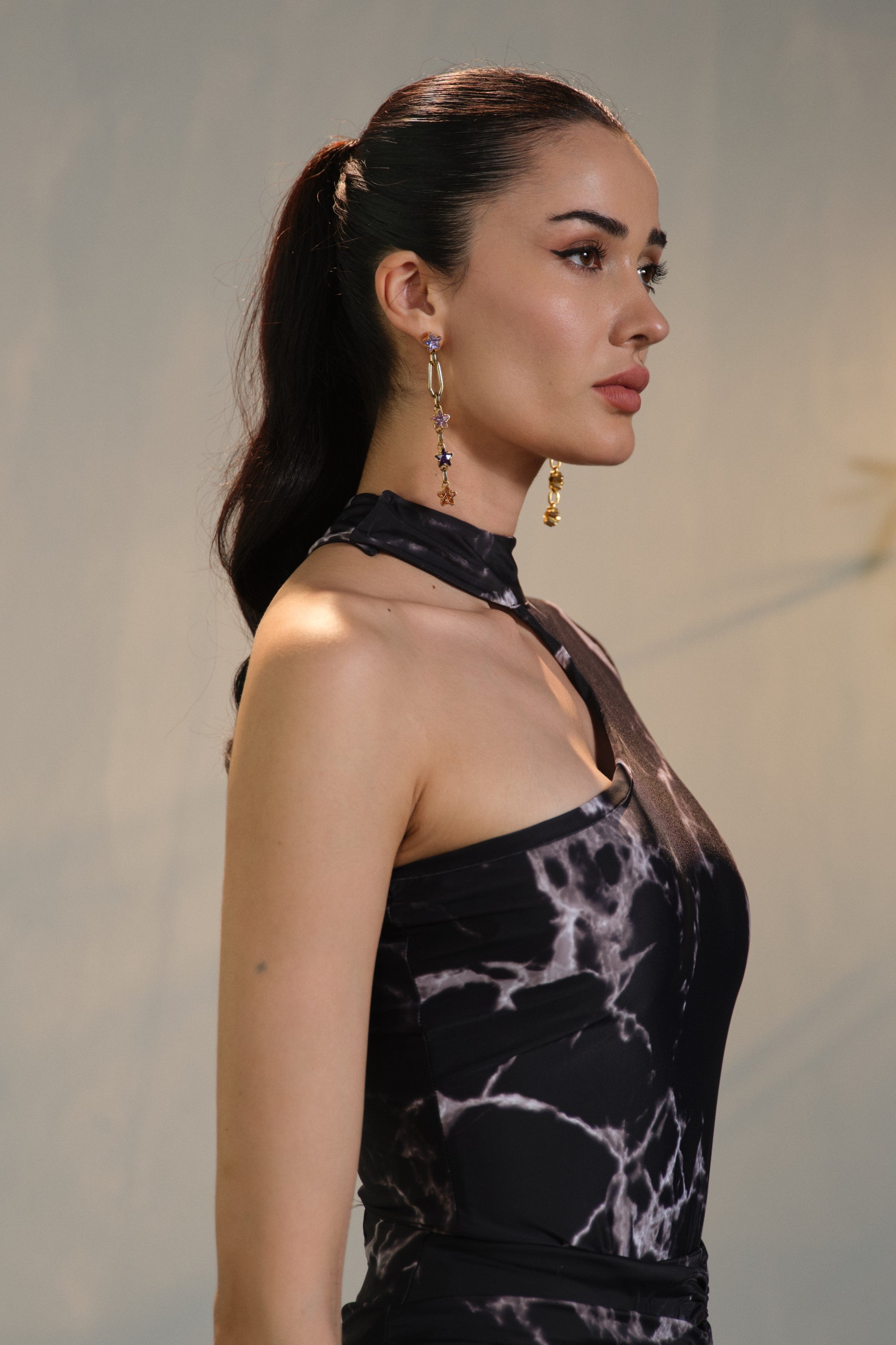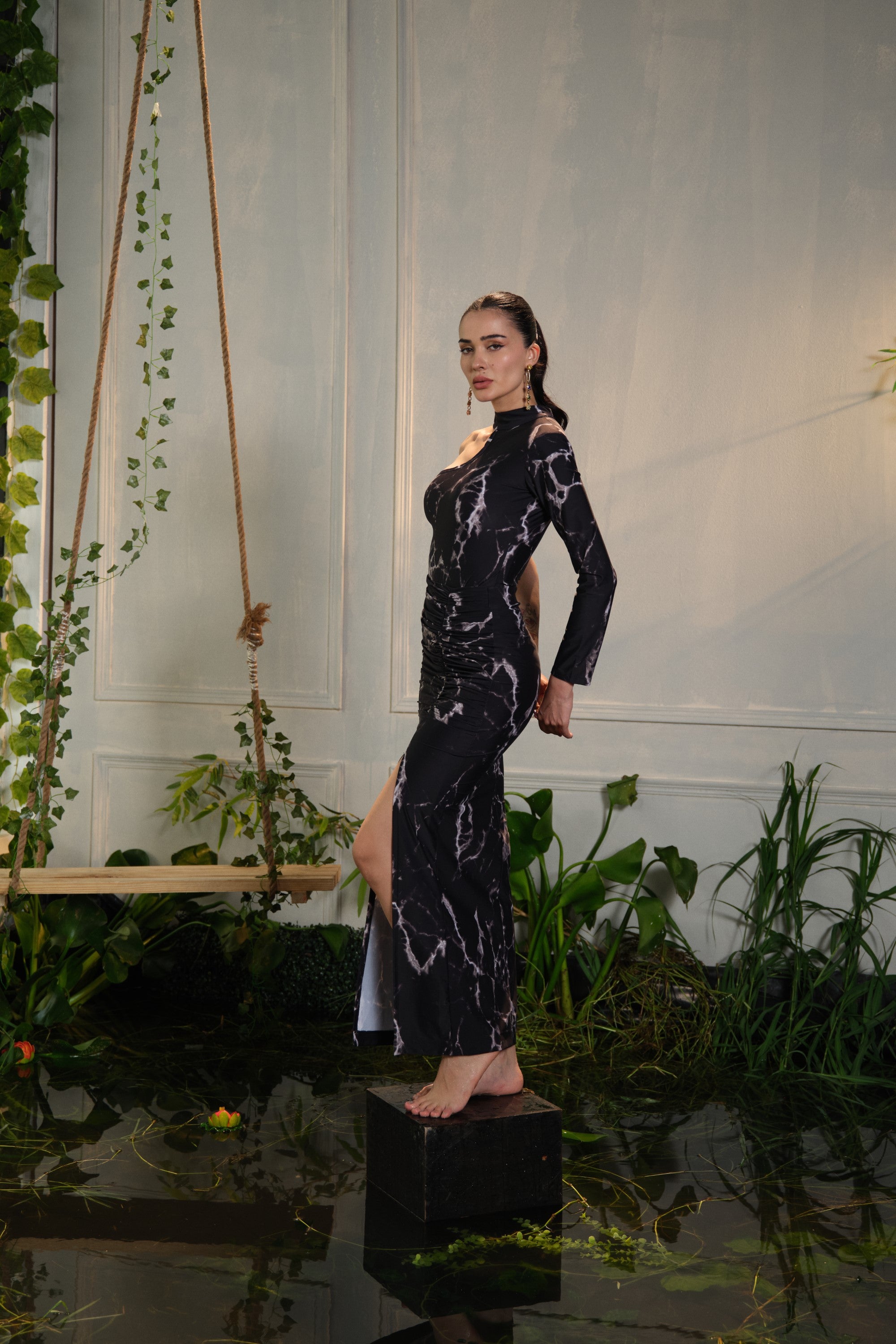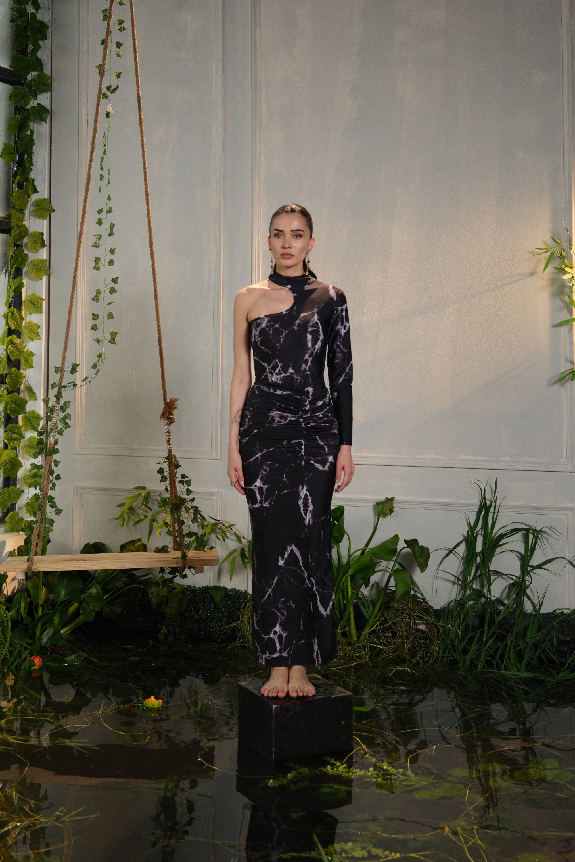 Make a statement in the marble-textured gathered slit skirt paired with a sleek one-shoulder bodysuit. Crafted from premium imported nylon lycra, this power duo hugs in all the right places—blending bold textures with modern elegance for a look that’s effortlessly stunning!