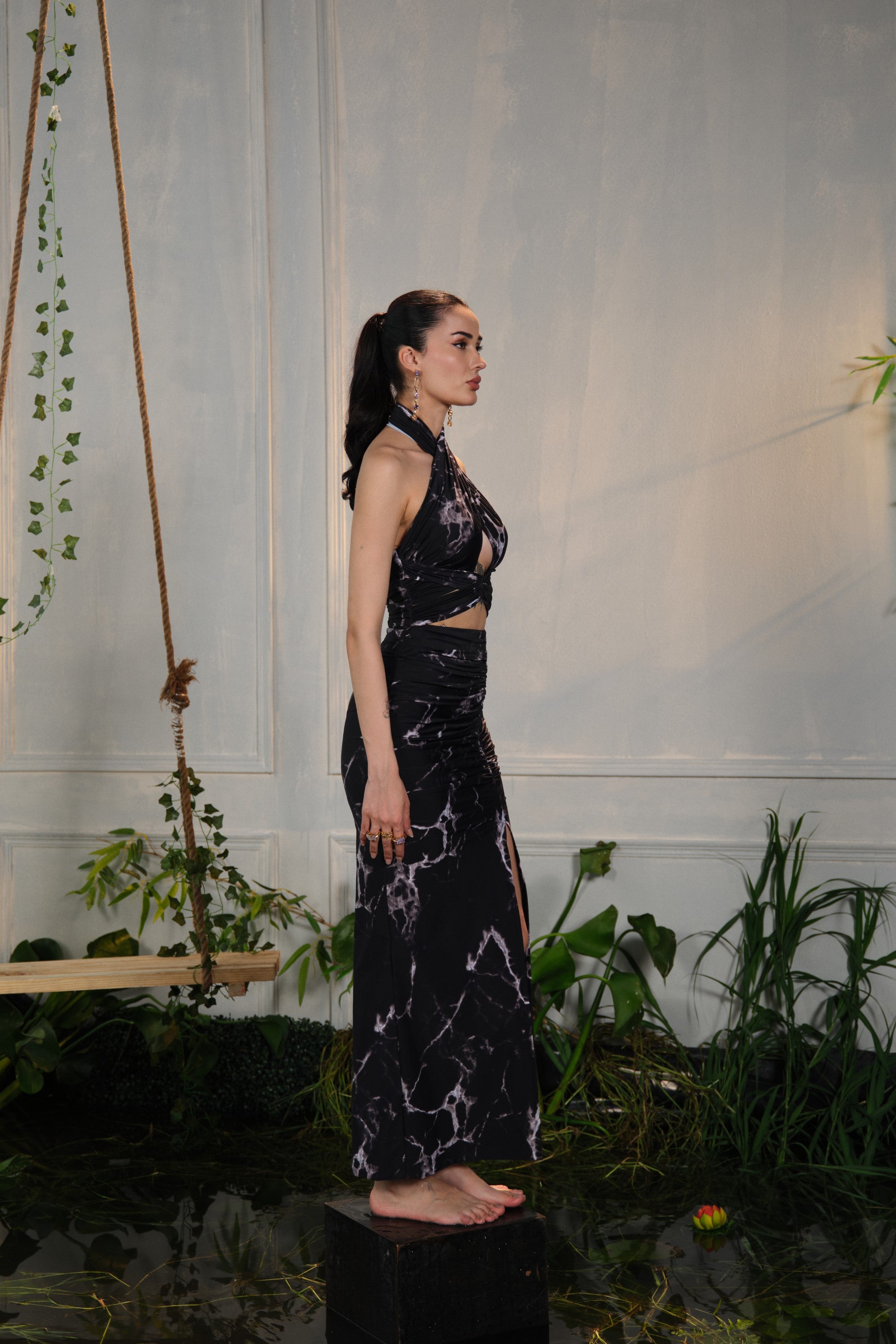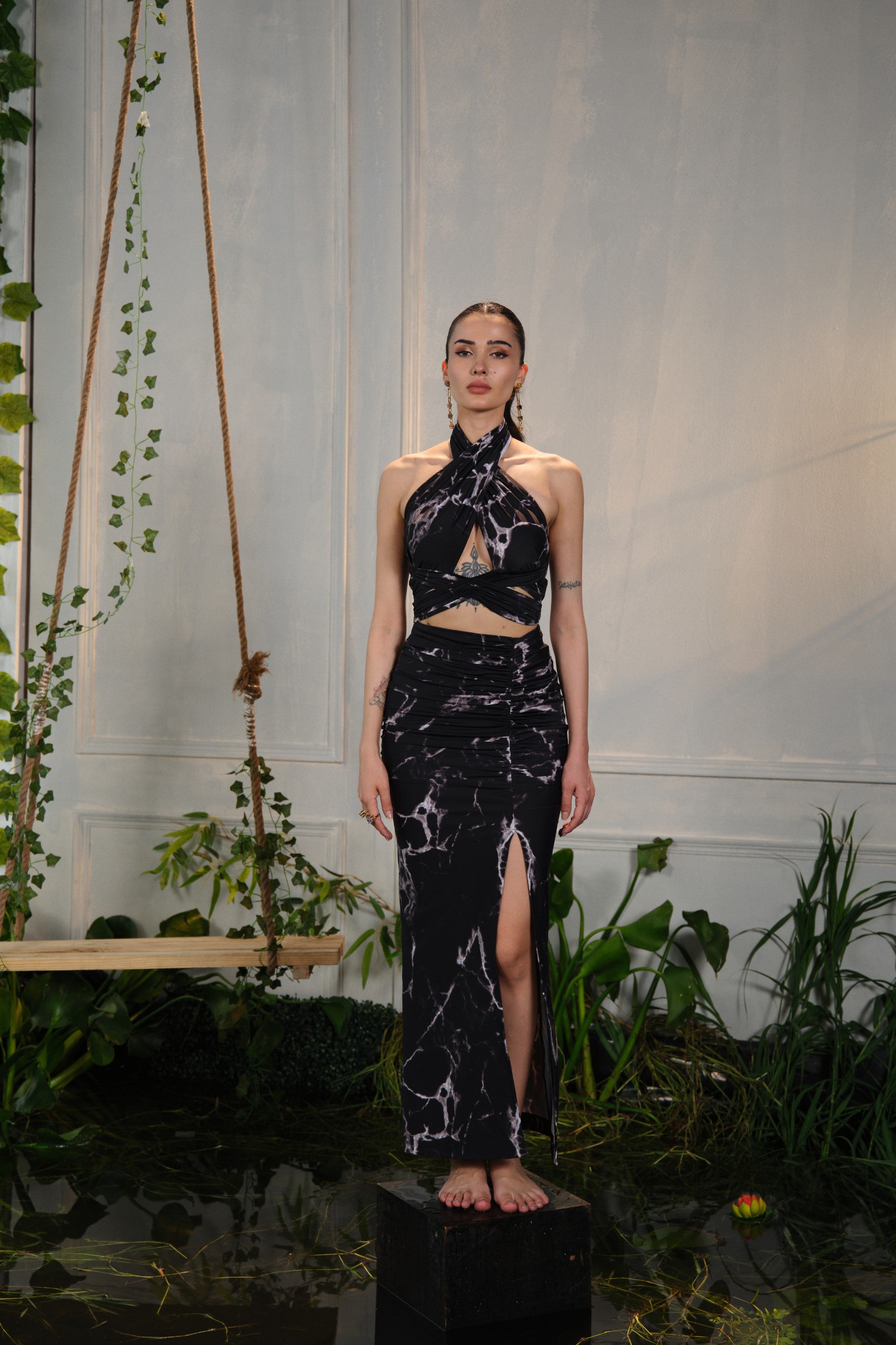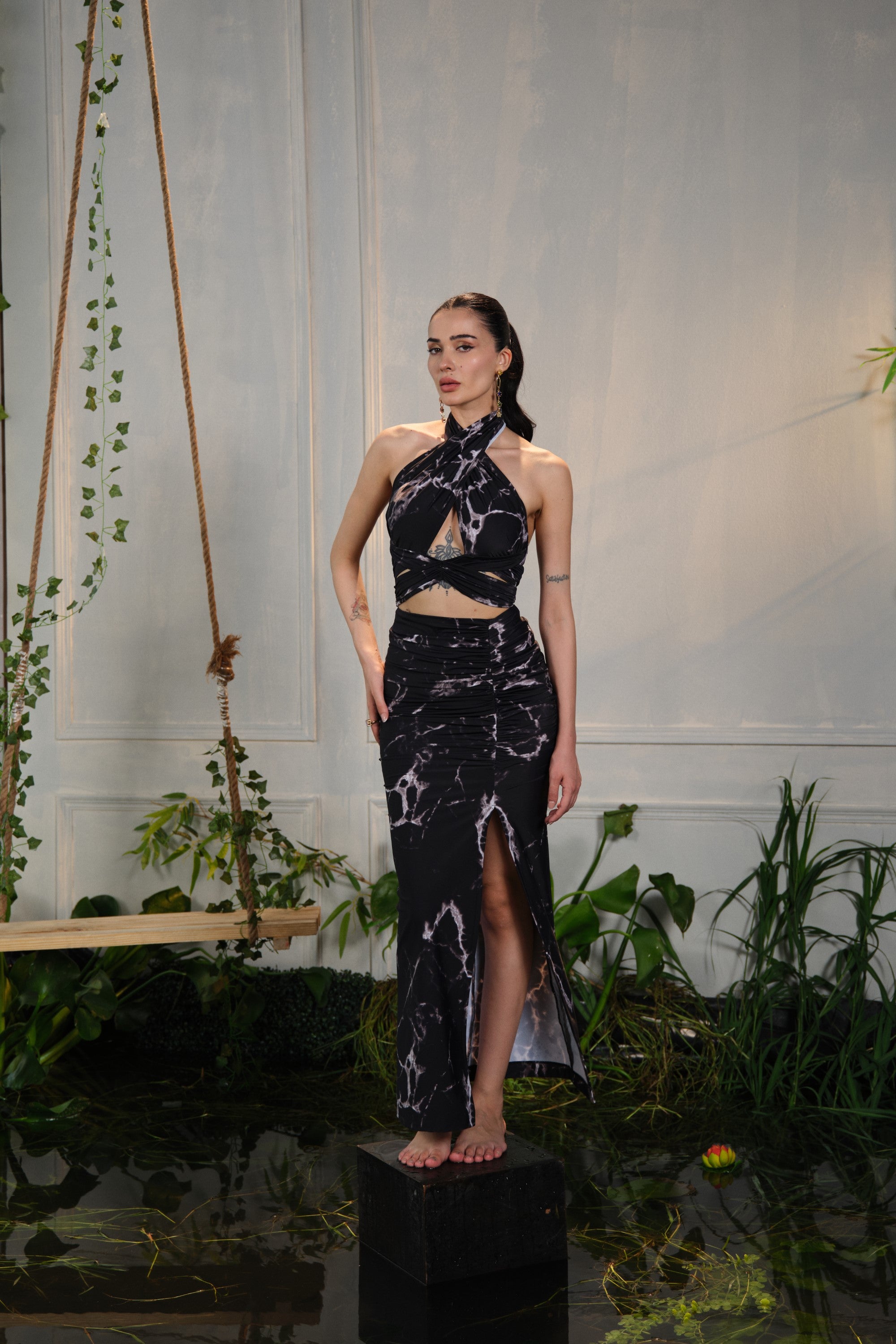 Serve bold style with the marble-textured knotted slit skirt paired with a chic cross KAT neck top. Crafted from luxe imported nylon lycra, this edgy yet elegant duo brings movement, texture, and major fashion energy to your wardrobe!