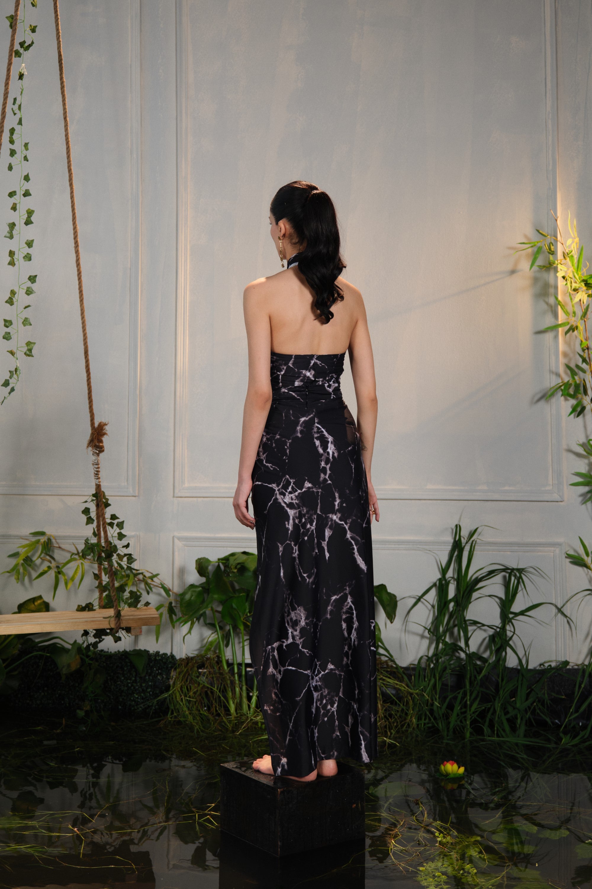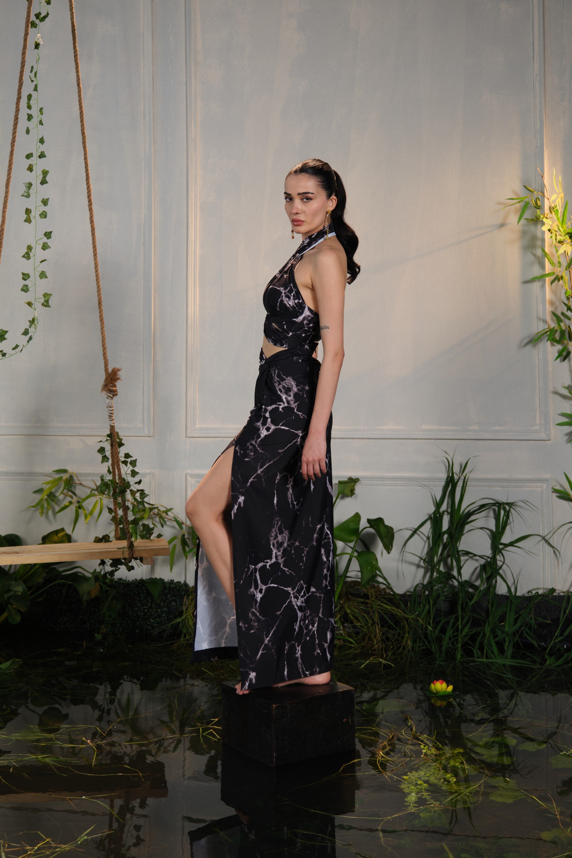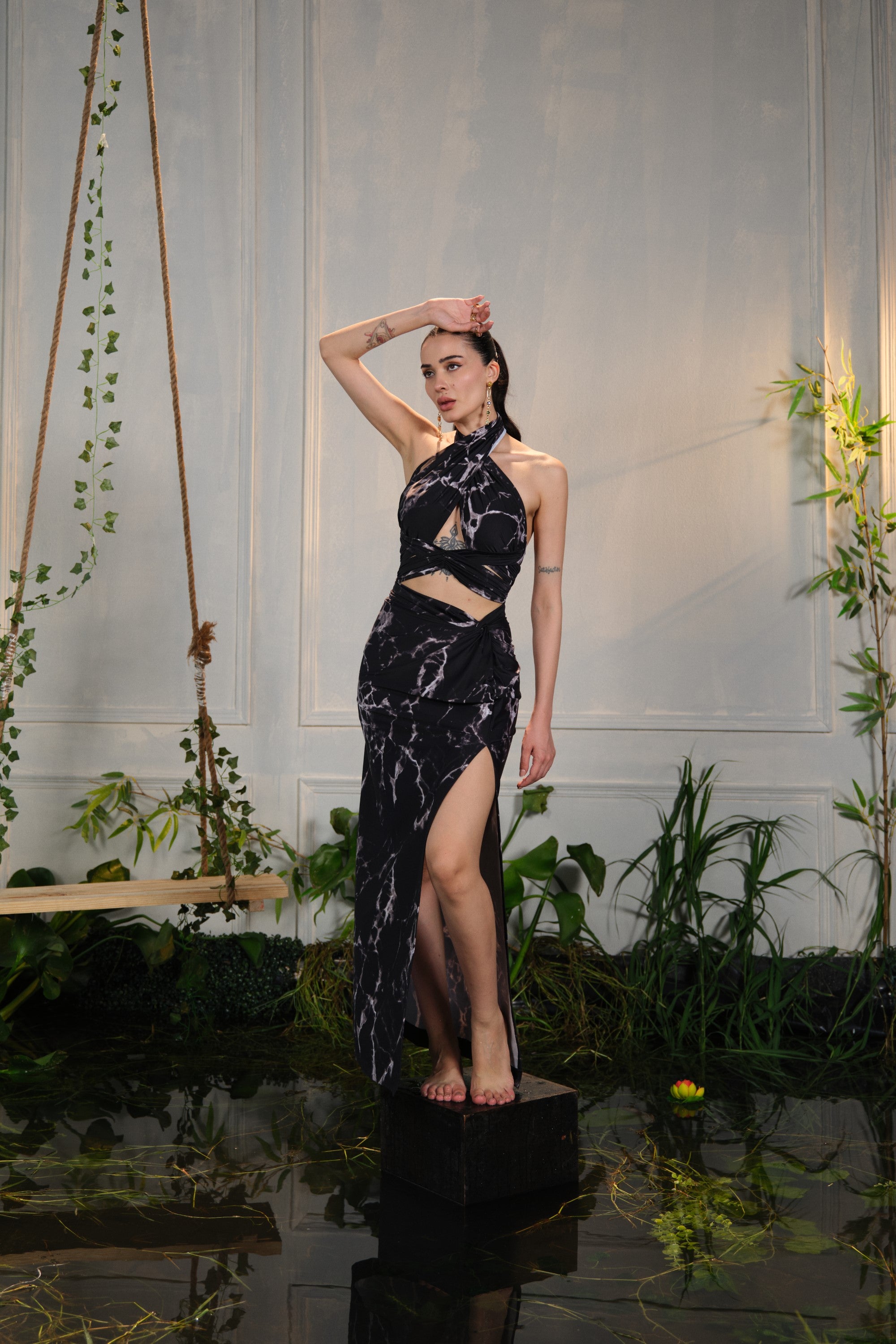 Turn heads in our marble-textured knotted slit skirt, paired with a bold cross-knot neckline top — the perfect blend of edgy and effortless!
