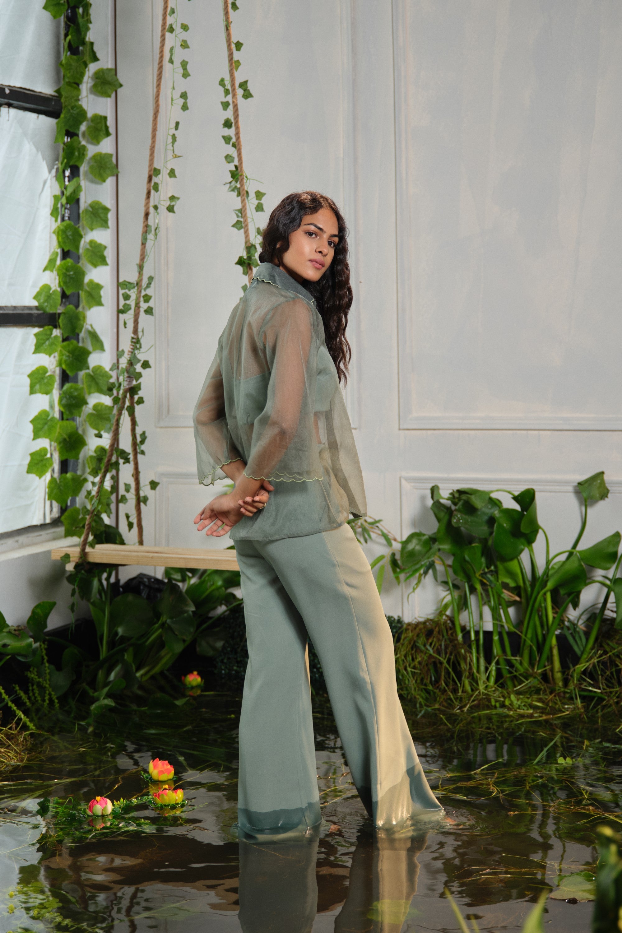 A dreamy sage green set featuring a sheer organza shirt with delicate floral embroidery, paired with a matching bustier and flared crepe pants. Crafted in tissue organza and exclusive crepe for a graceful, layered look.