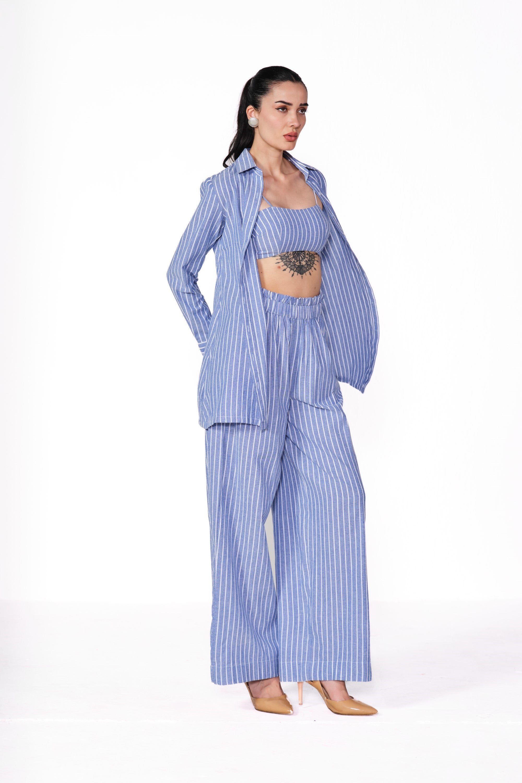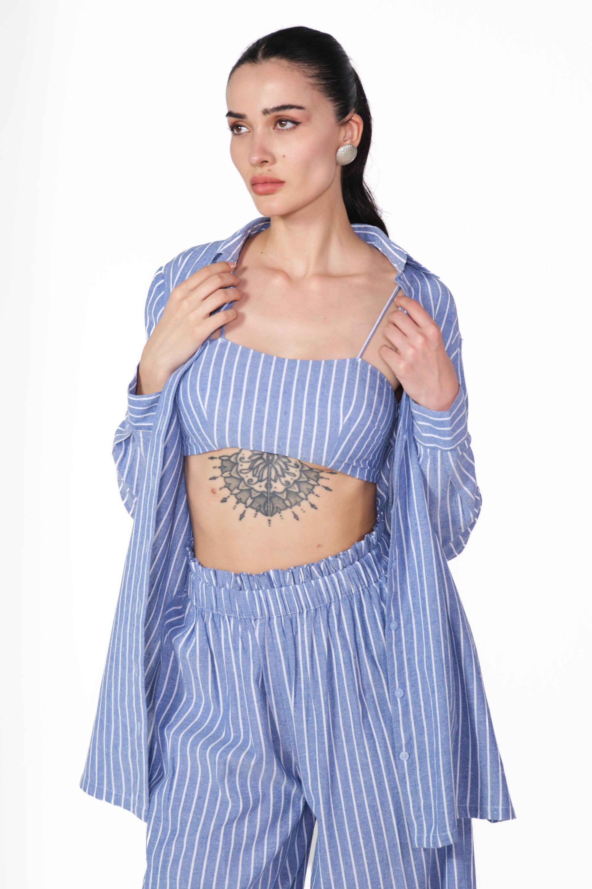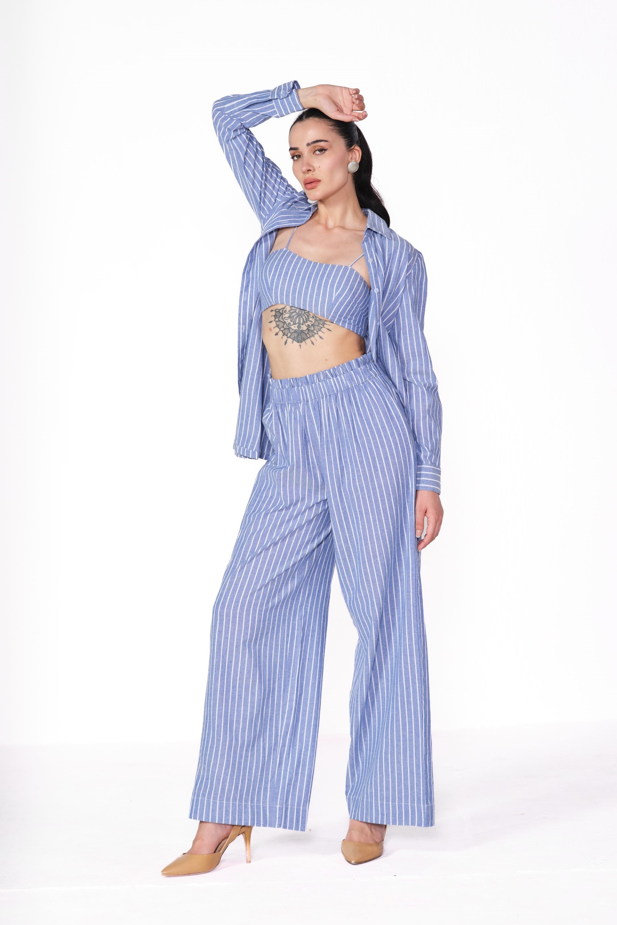 Stay effortlessly chic in the cotton linen striped shirt paired with a trendy bustier and ruffle-waist pants. Made from breathable cotton linen, this playful ensemble blends fresh textures with flirty details—perfect for a stylish, laid-back vibe!