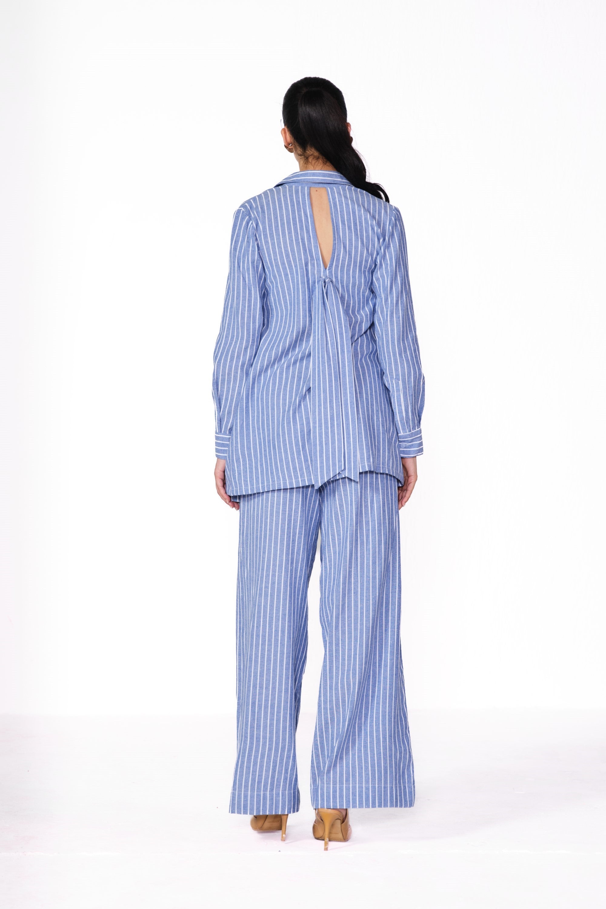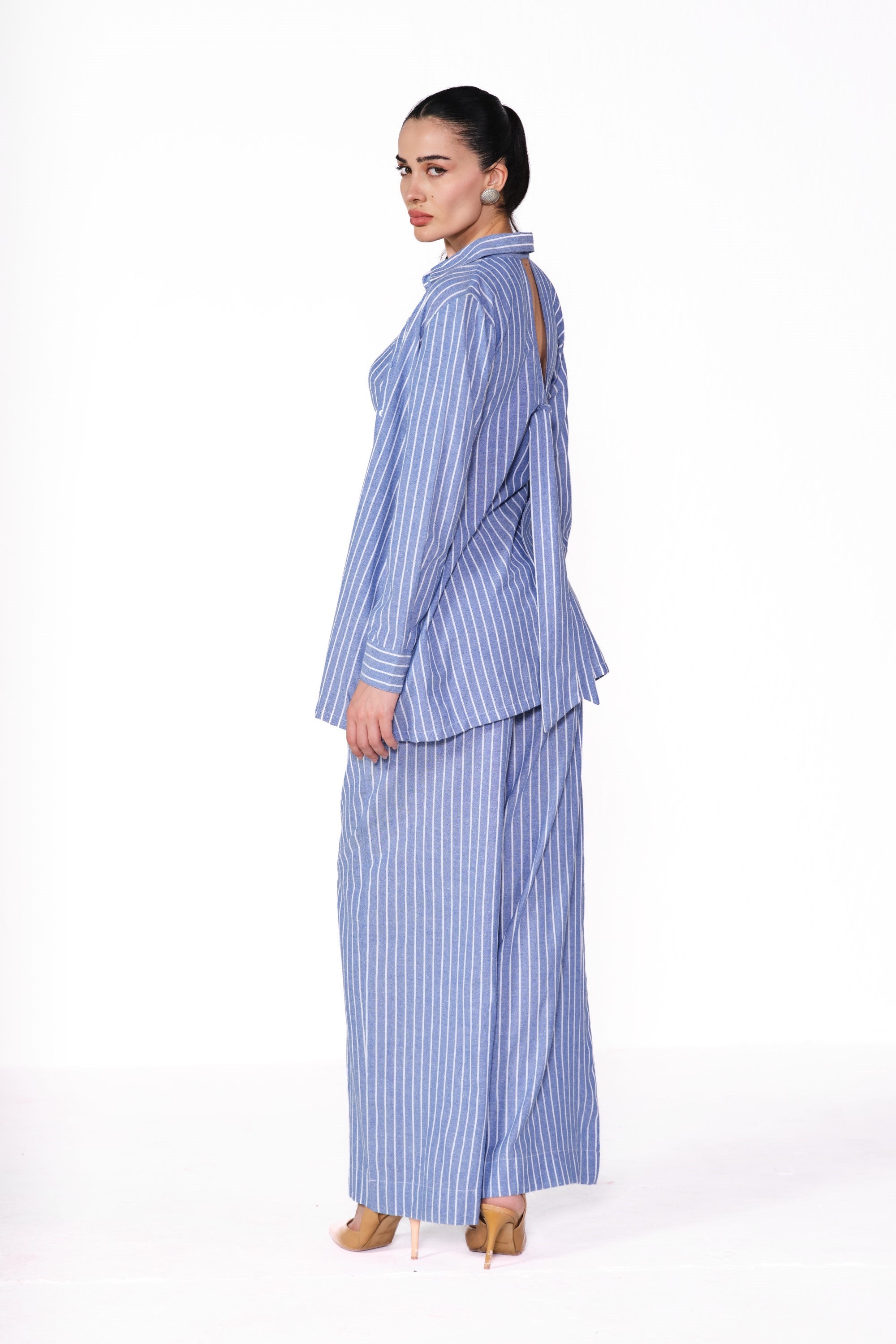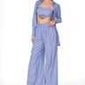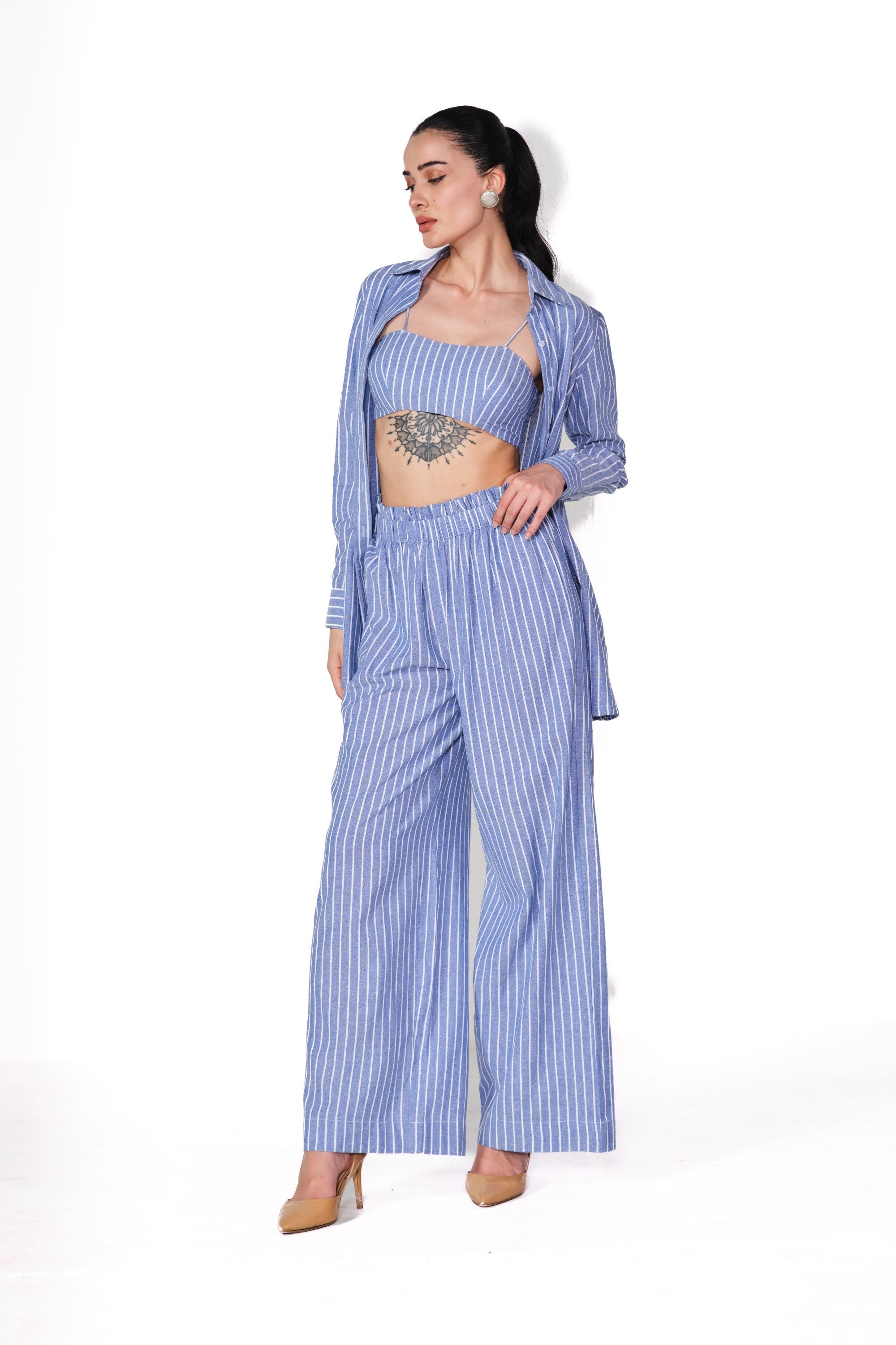 Stay effortlessly chic in the cotton linen striped shirt paired with a trendy bustier and ruffle-waist pants. Made from breathable cotton linen, this playful ensemble blends fresh textures with flirty details—perfect for a stylish, laid-back vibe!