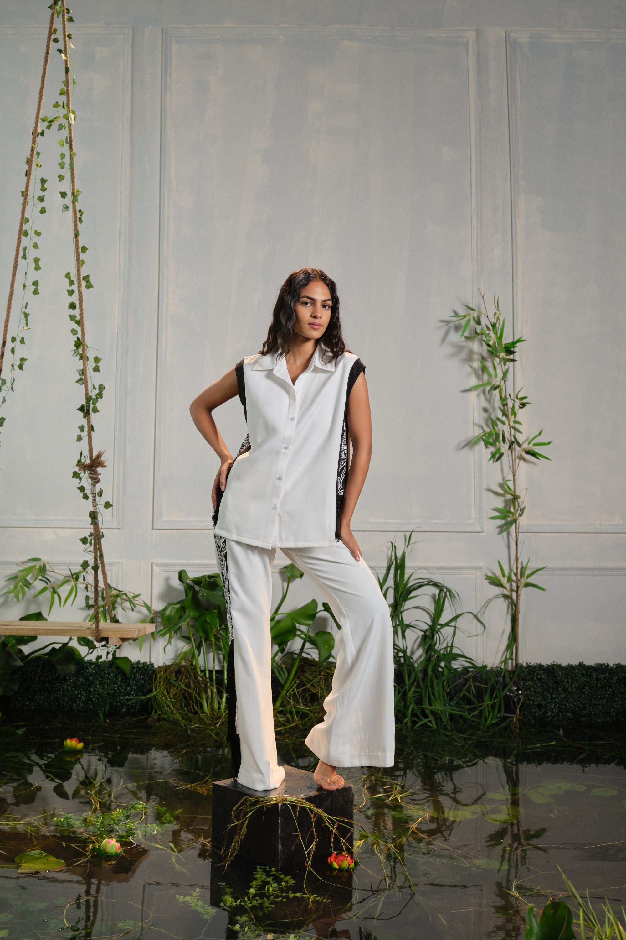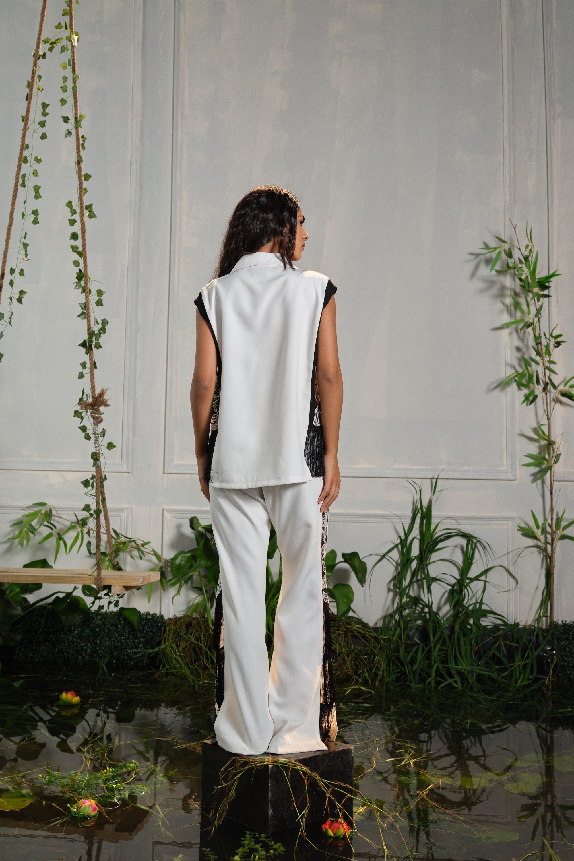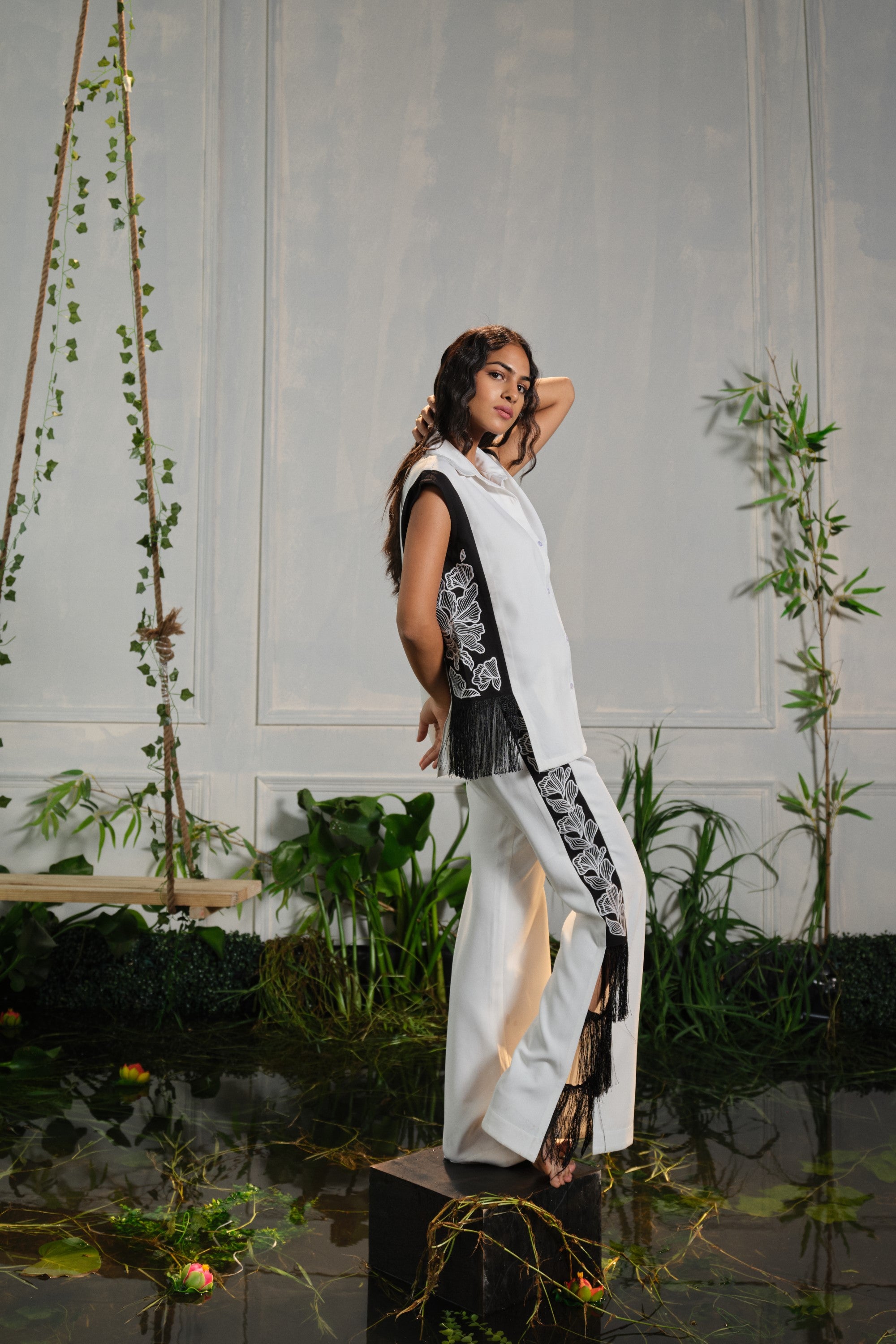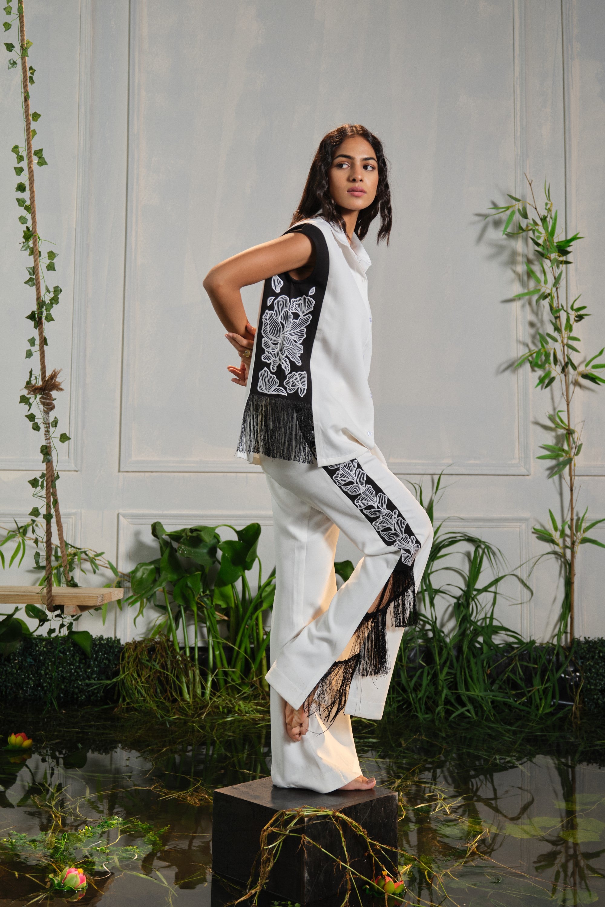 This white cord set is crafted in premium crepe and detailed with bold black Caia thread embroidery on both shirt and pant side panels. Fringes add the perfect finishing touch.