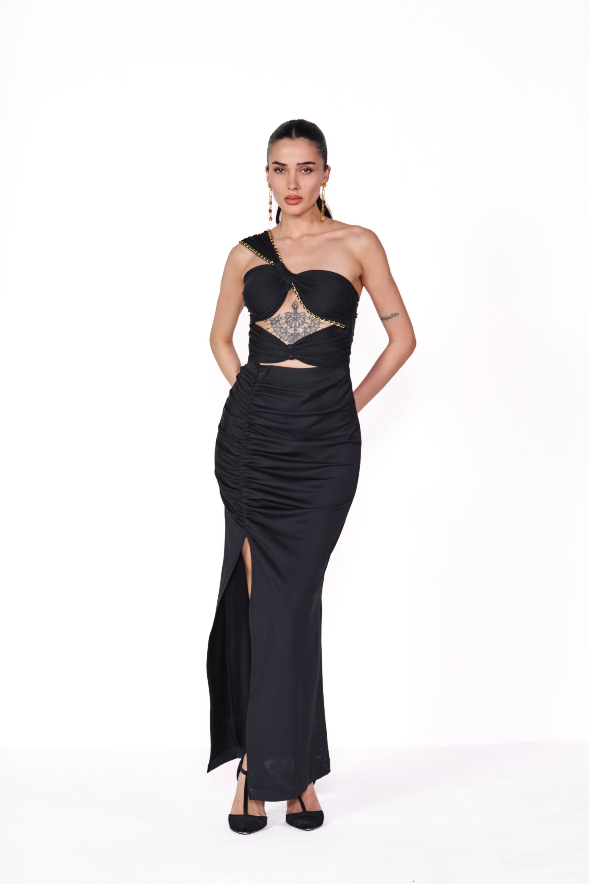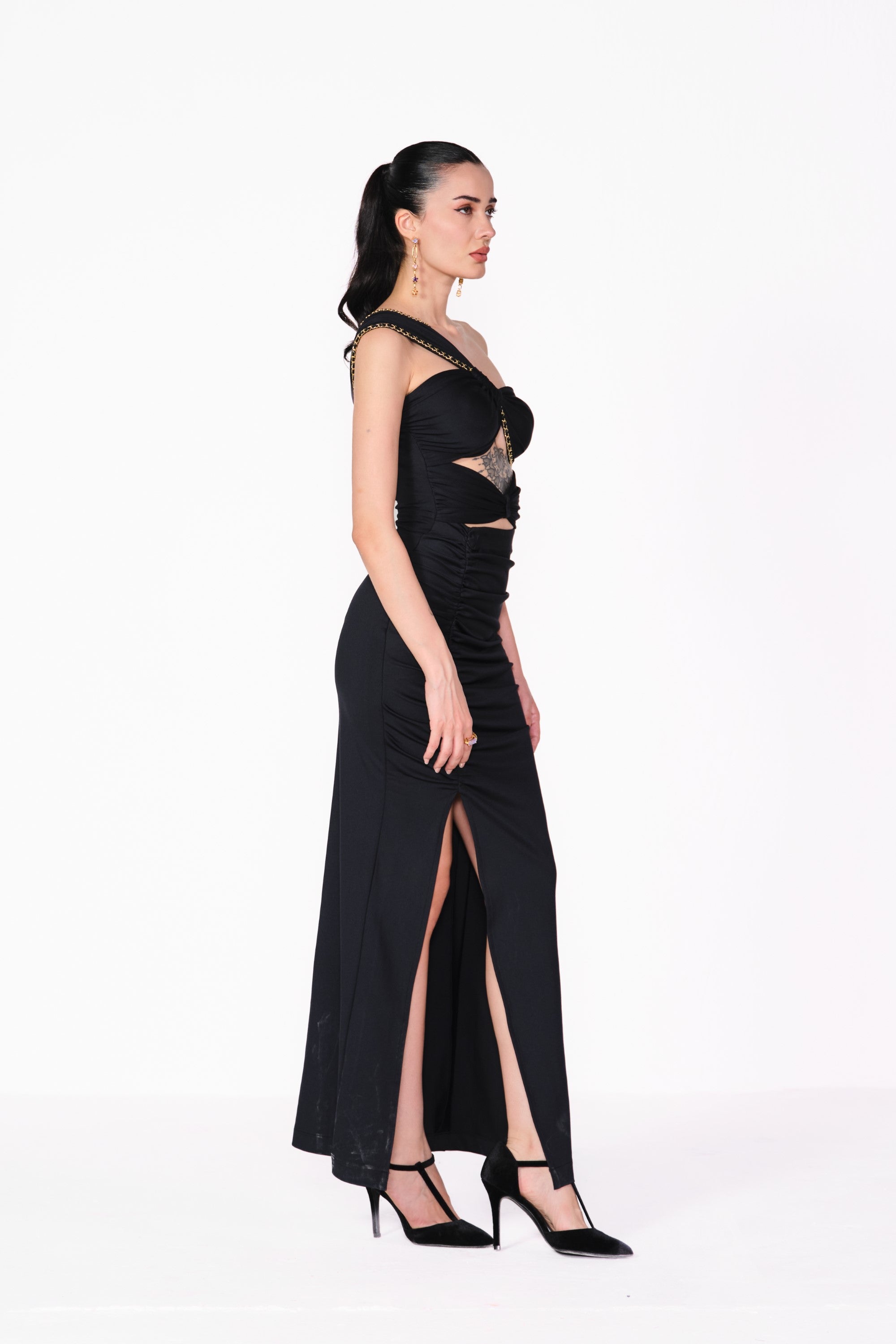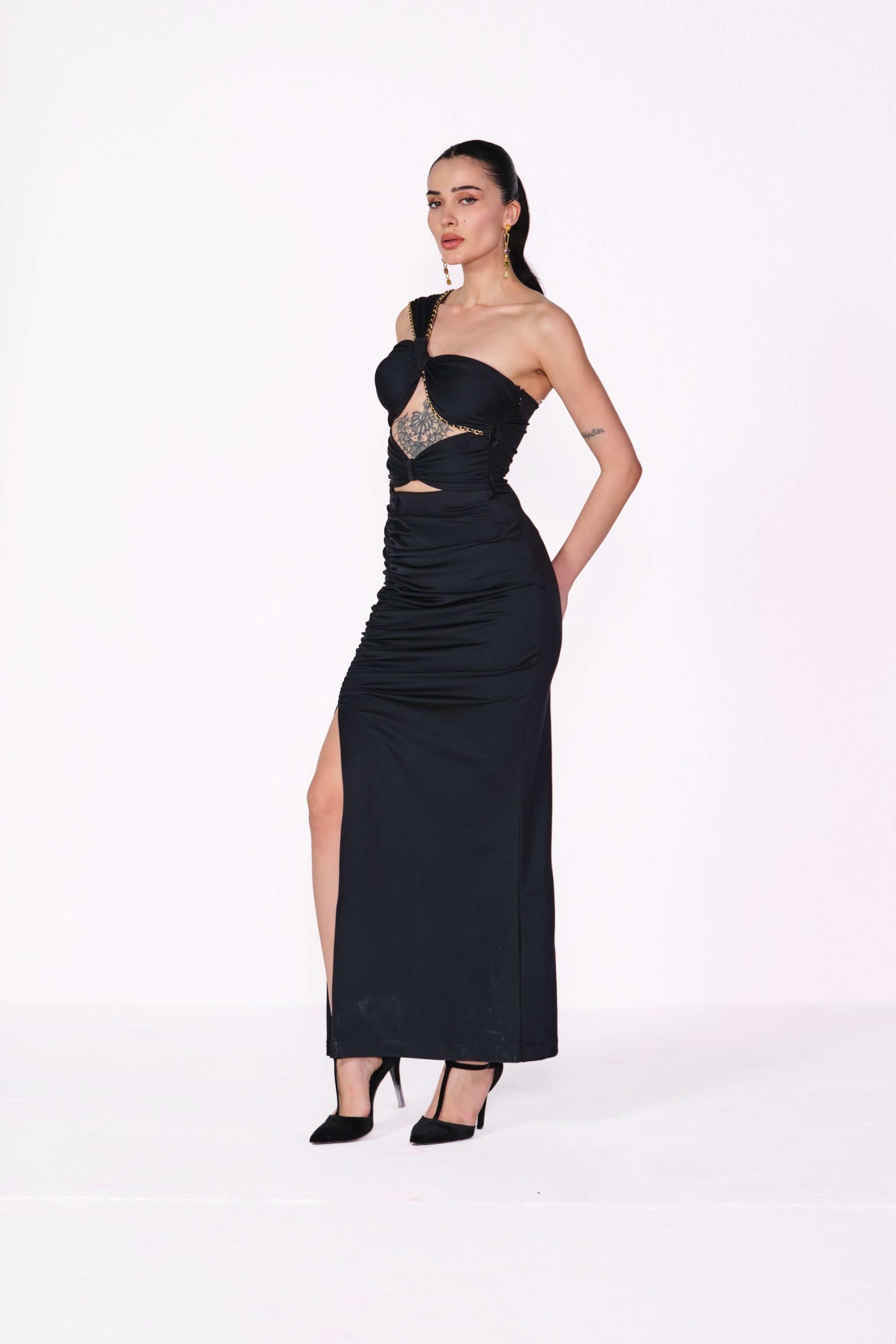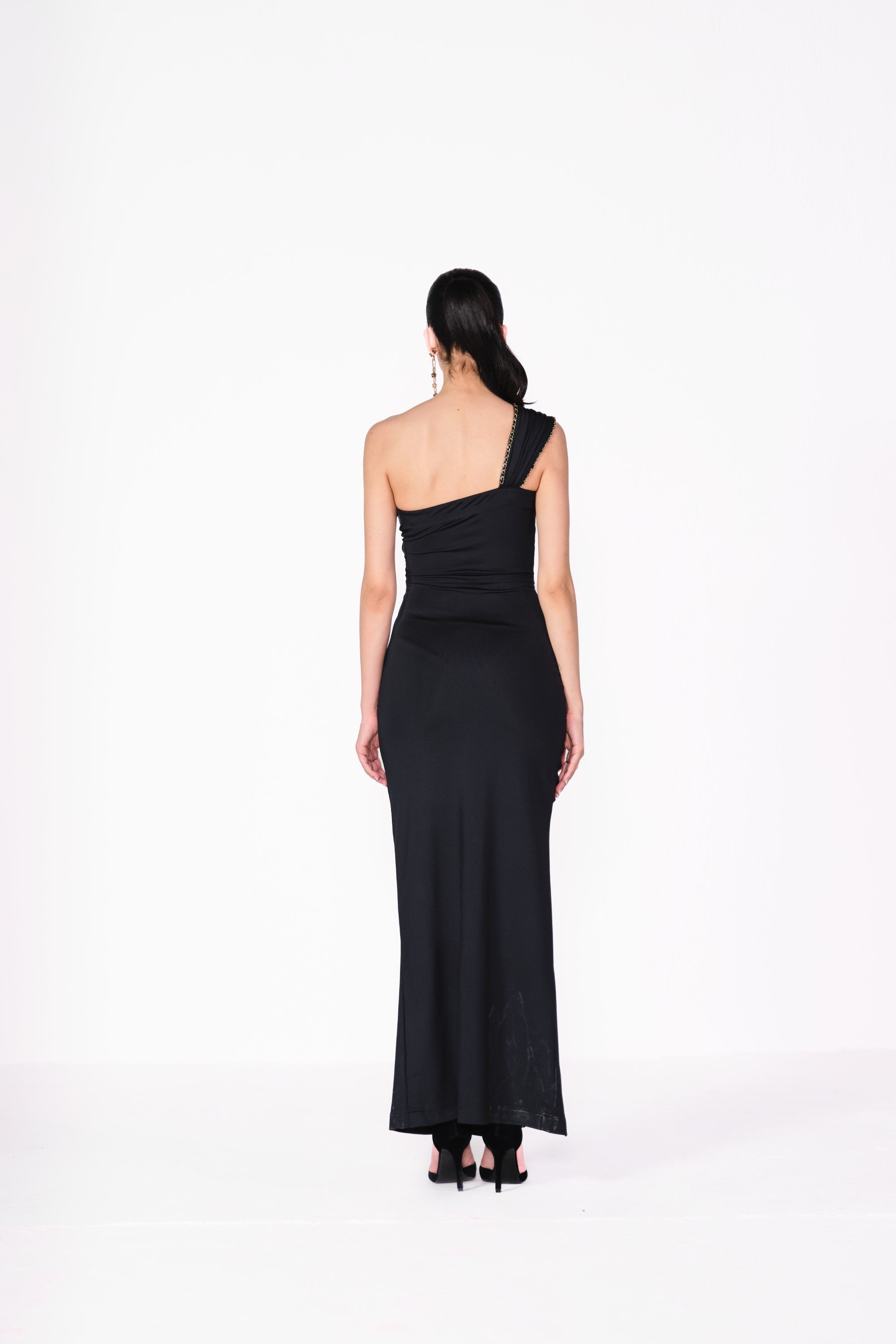 Own the night in the Zella black side-cut gathered dress with a daring slit, beautifully detailed with silver crystal strings draping the shoulders. Made from exclusive lycra, this show-stopping piece blends edgy glamour with sleek sophistication for a look that truly captivates!