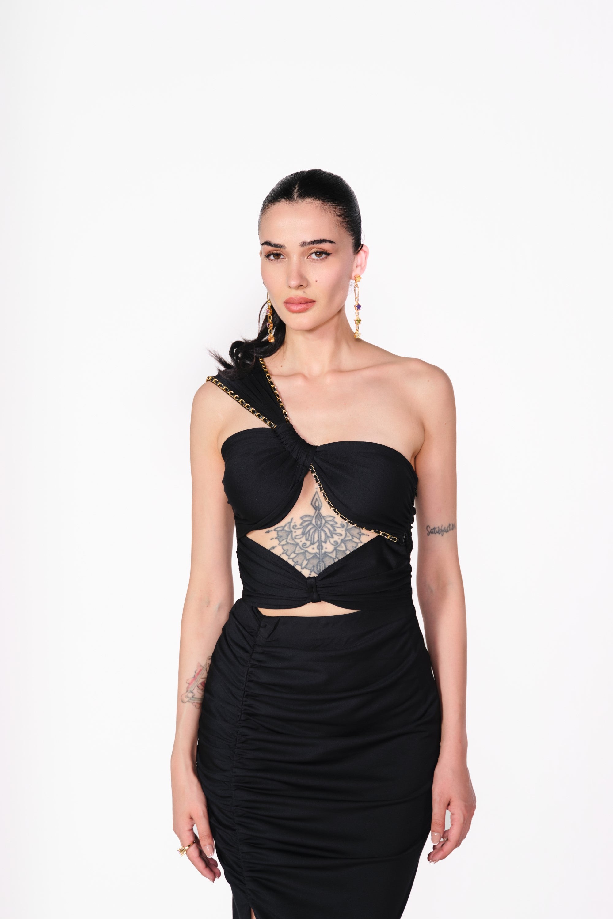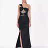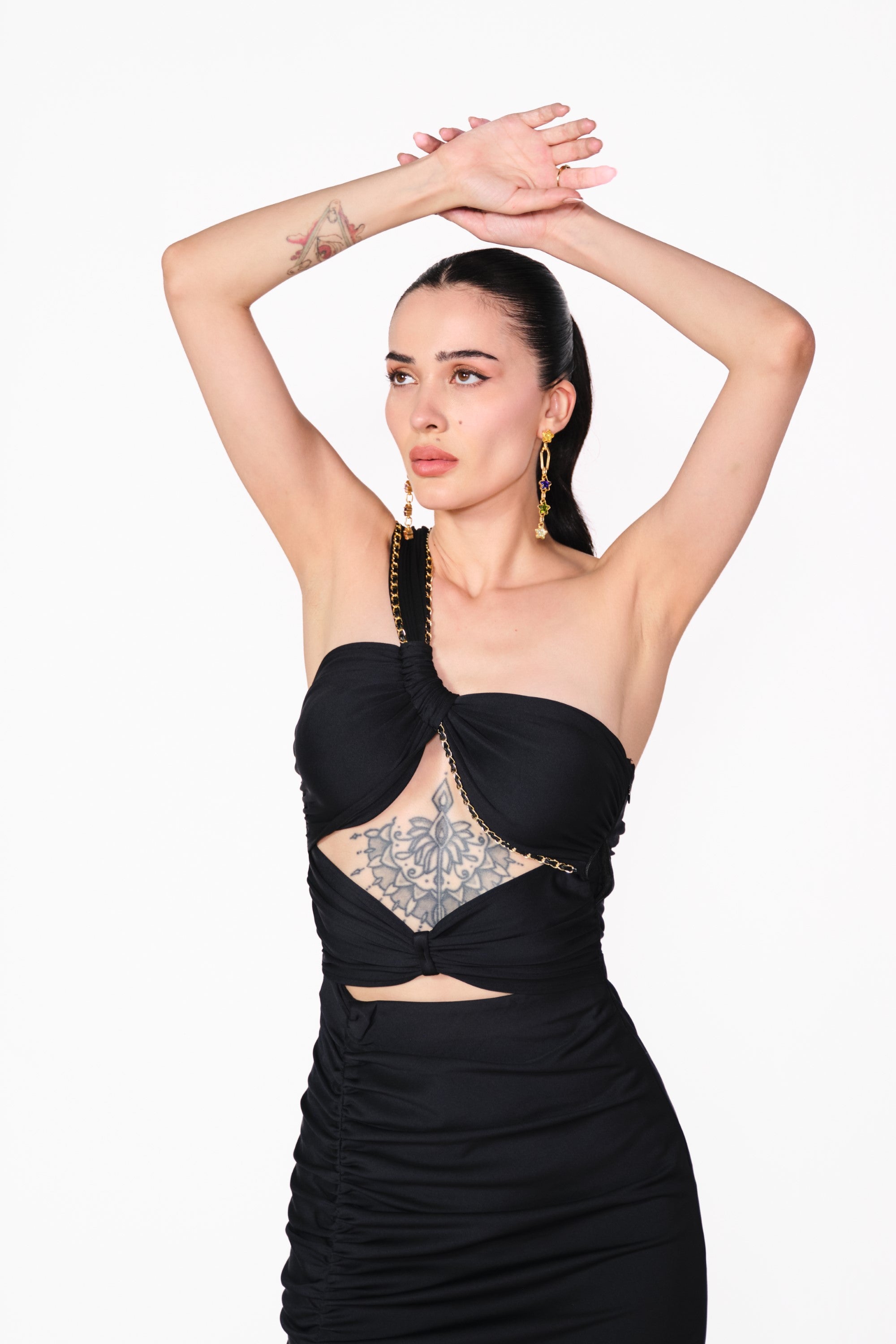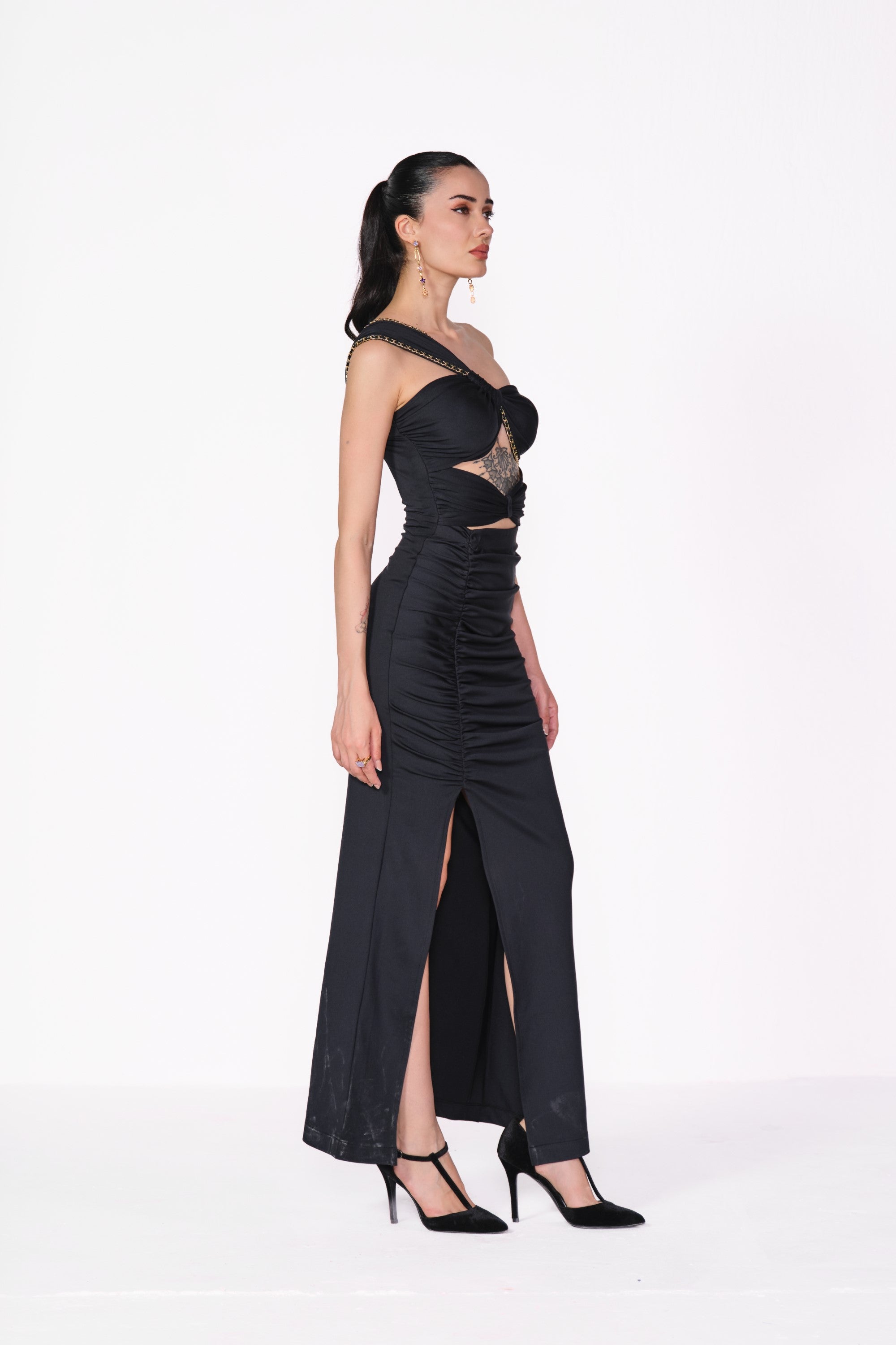 Own the night in the Zella black side-cut gathered dress with a daring slit, beautifully detailed with silver crystal strings draping the shoulders. Made from exclusive lycra, this show-stopping piece blends edgy glamour with sleek sophistication for a look that truly captivates!