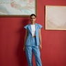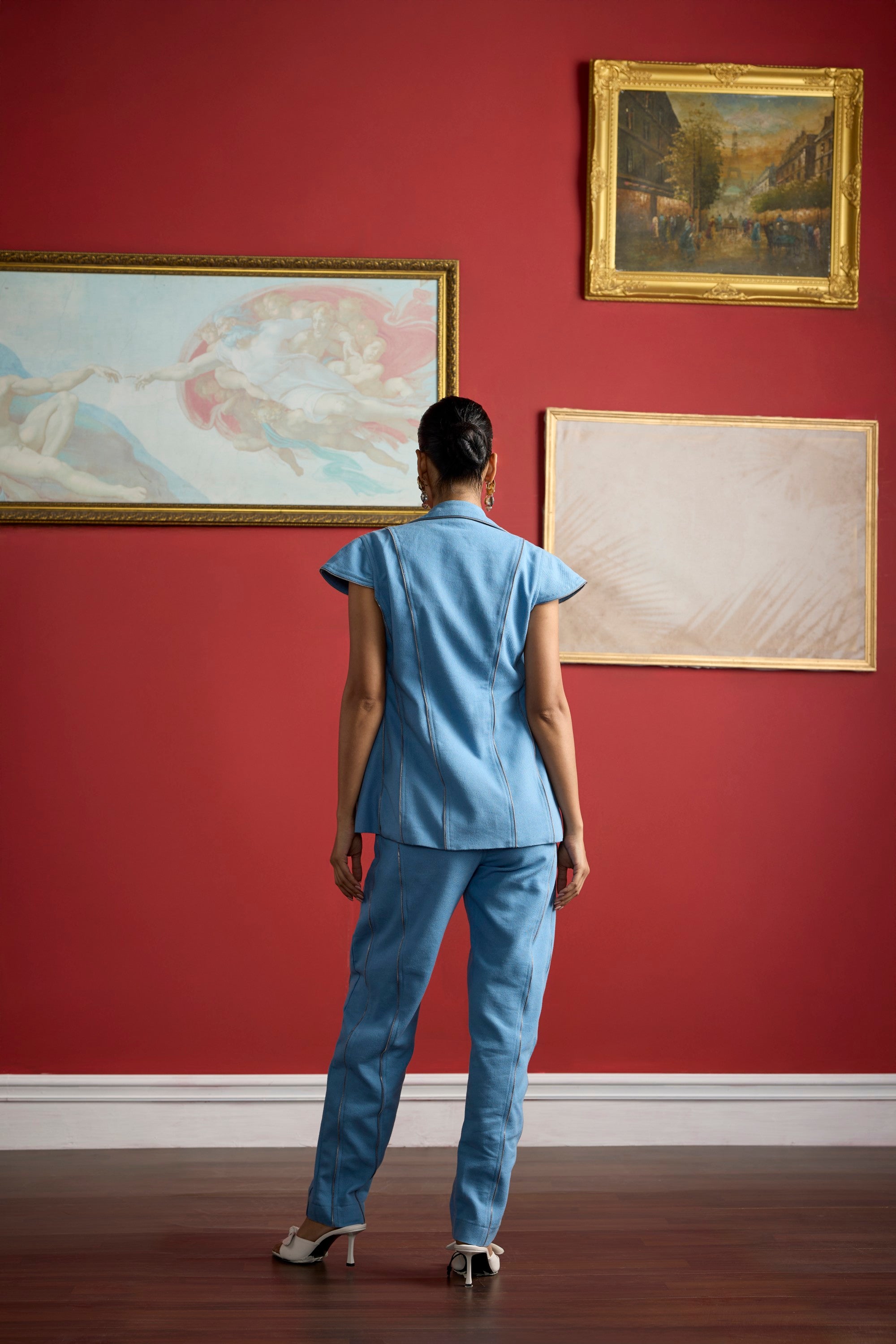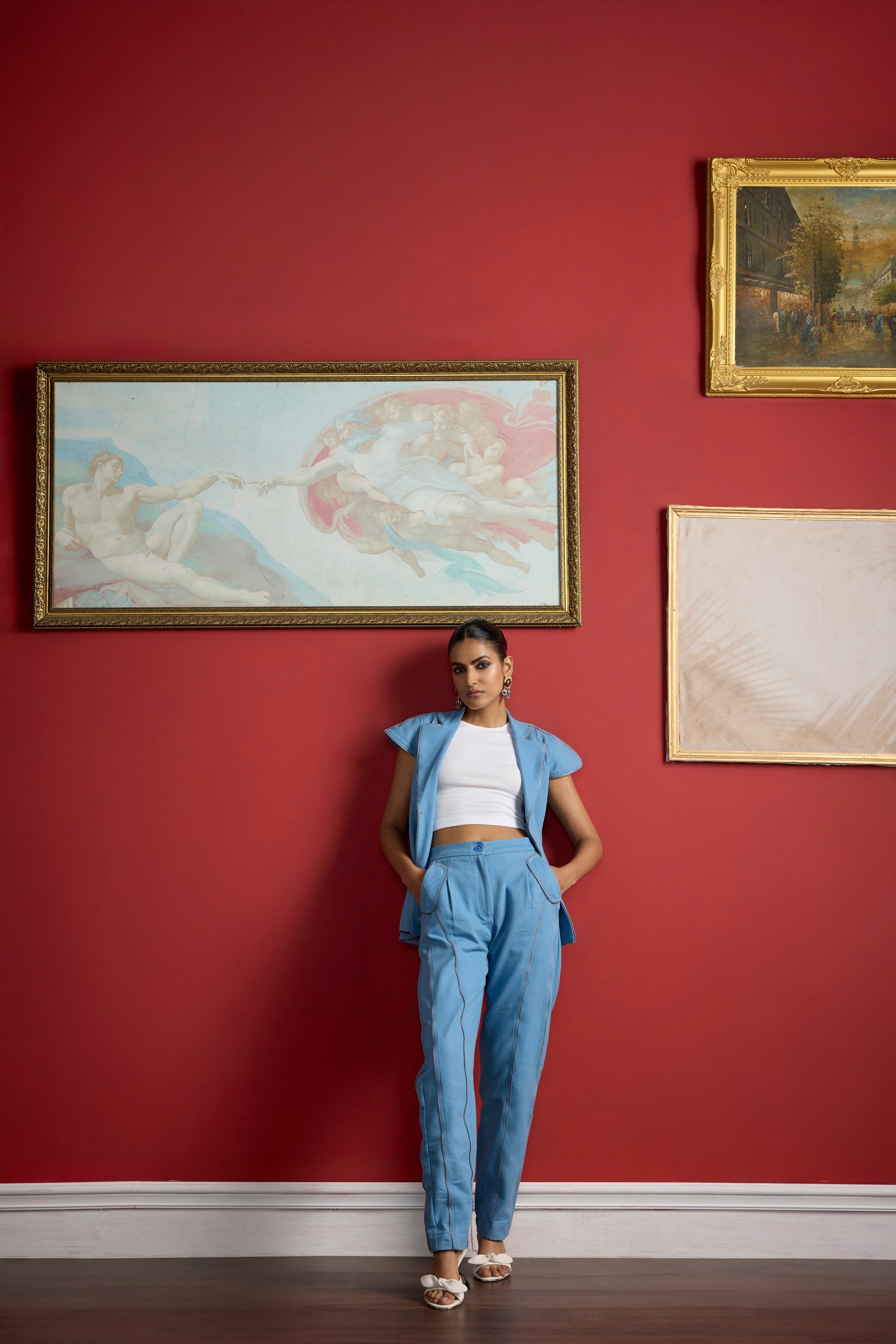 featuring the denim blue zip detaling jacket paired with relaxed fit pants
