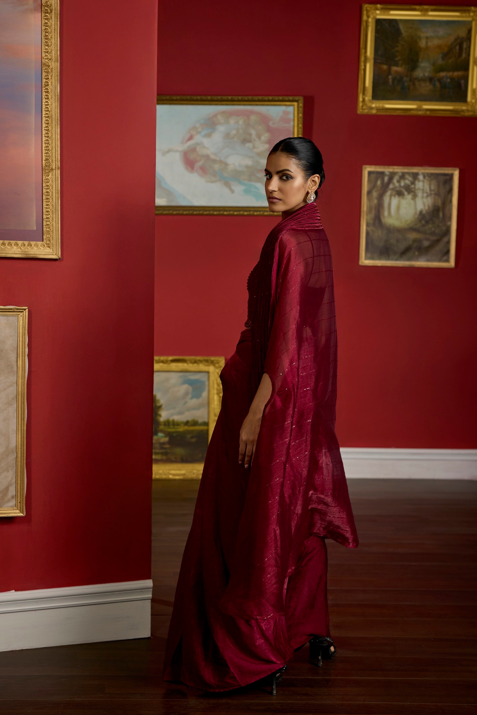 featuring the contemporary maroon dori work blouse , paired with a drape style dhoti skirt adorned with a flowy dori crush organza cape.