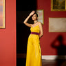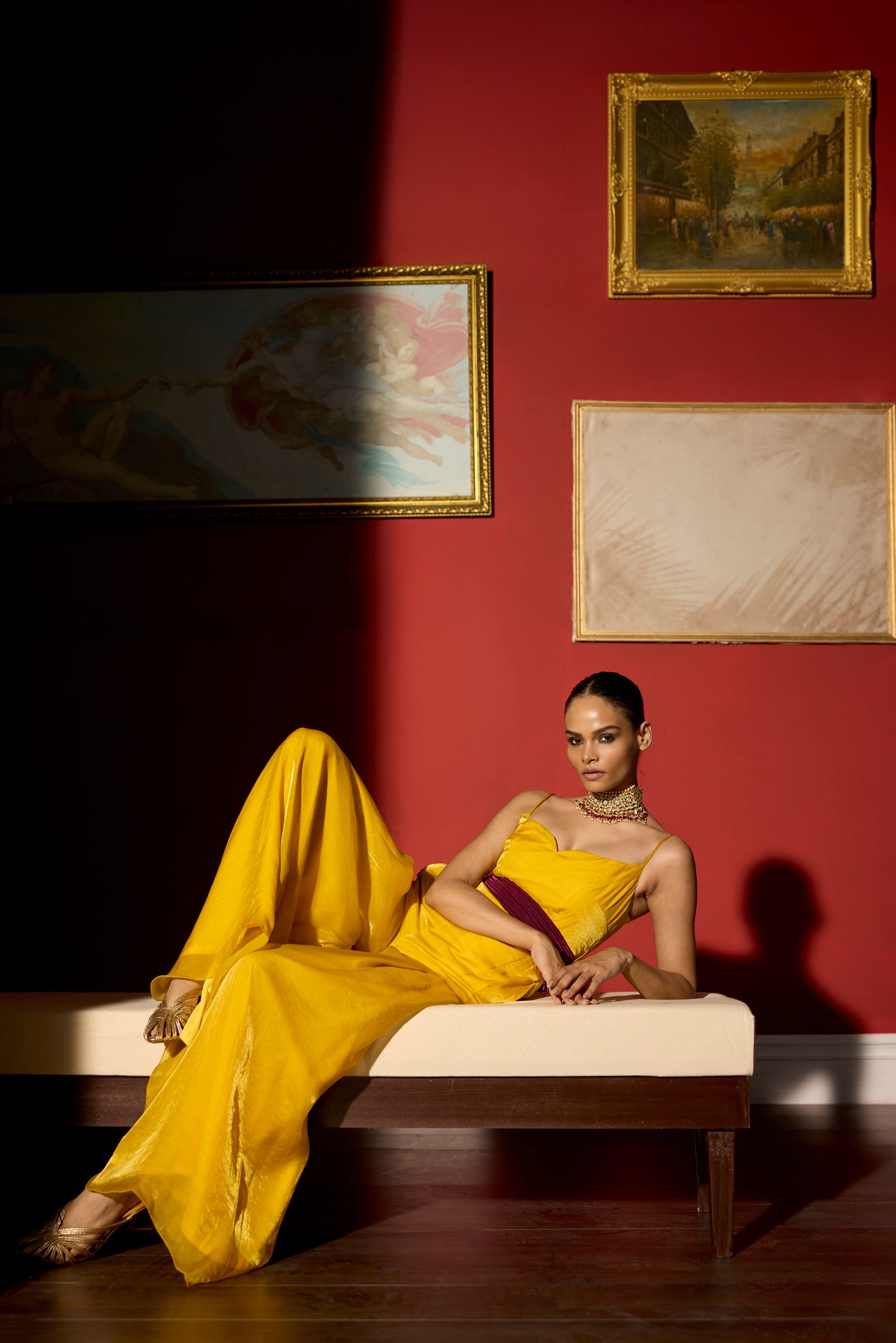 featuring the mustard yellow flaired leg jumpsuit detailed with pink dori work belt