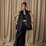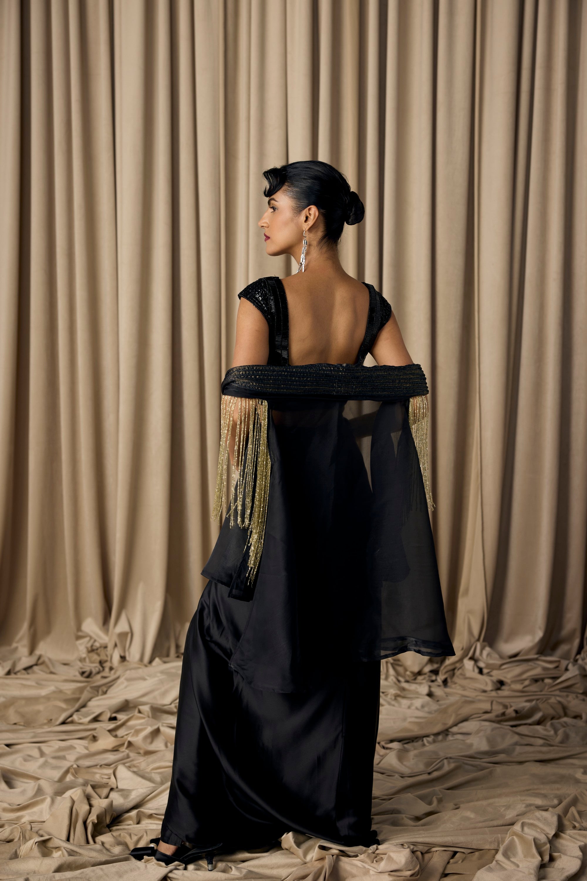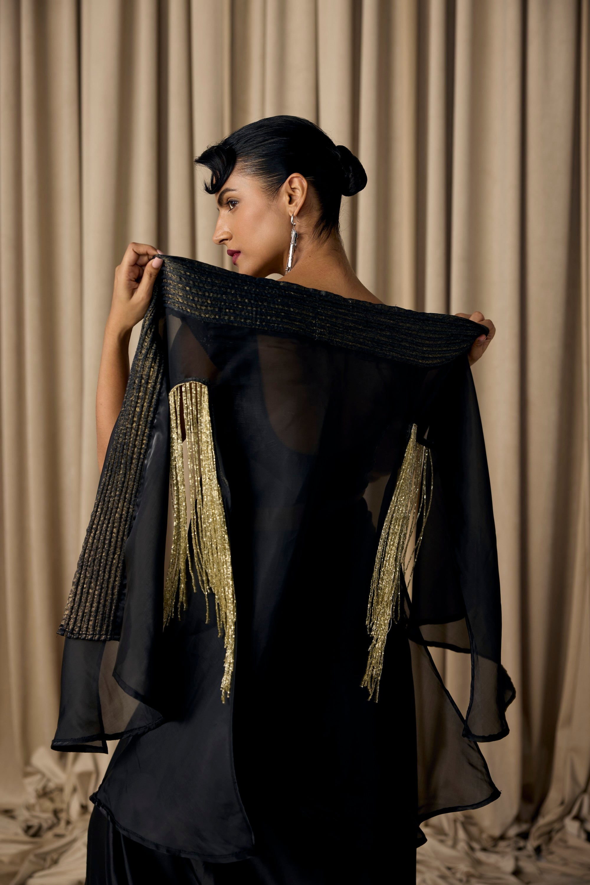 featuring the nalki work embellished blouse with armani satin exlcusive drape dhoti style skirt, adorned with a dori work organza cape , with crsytal kardana fringes on shoulders