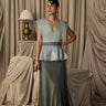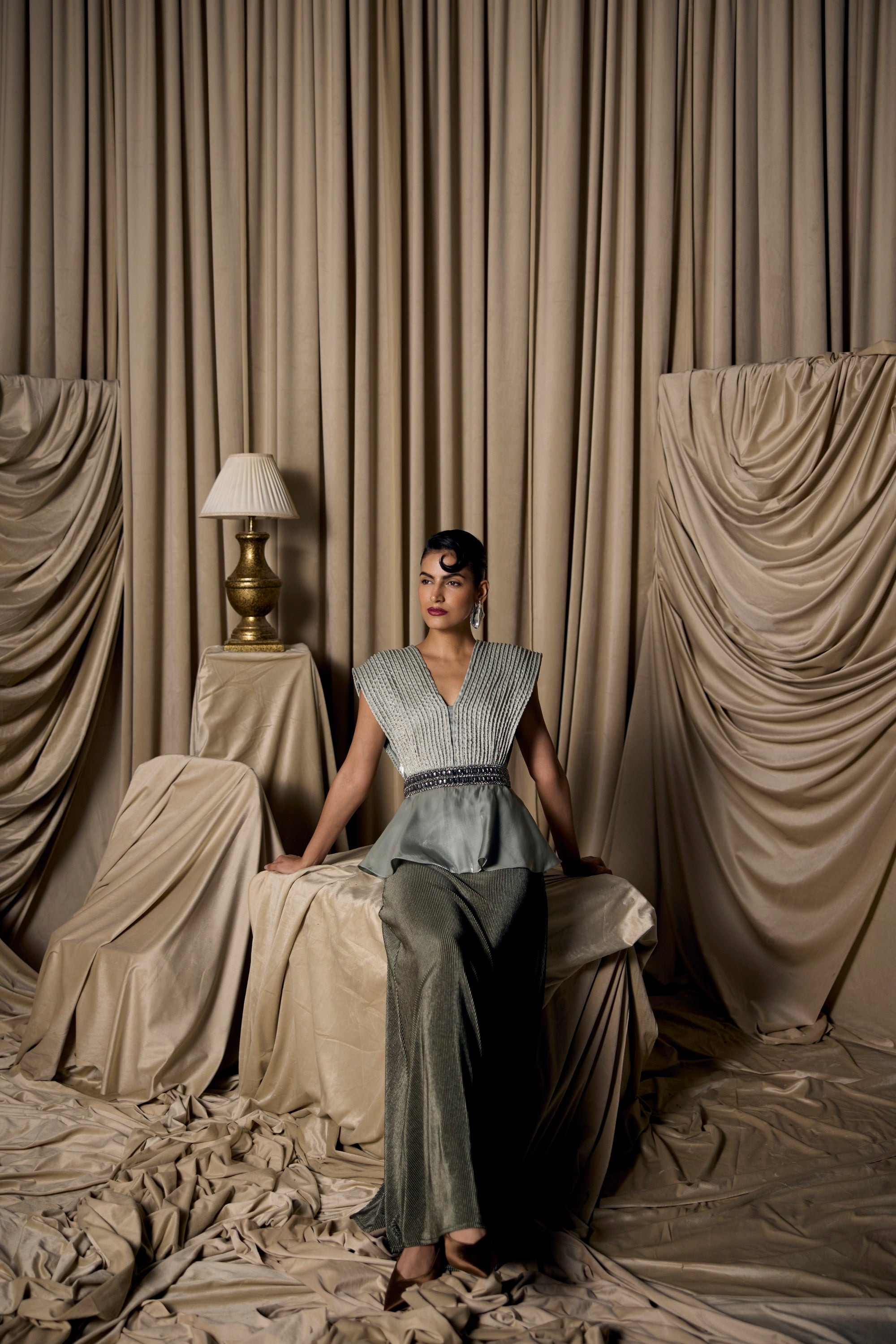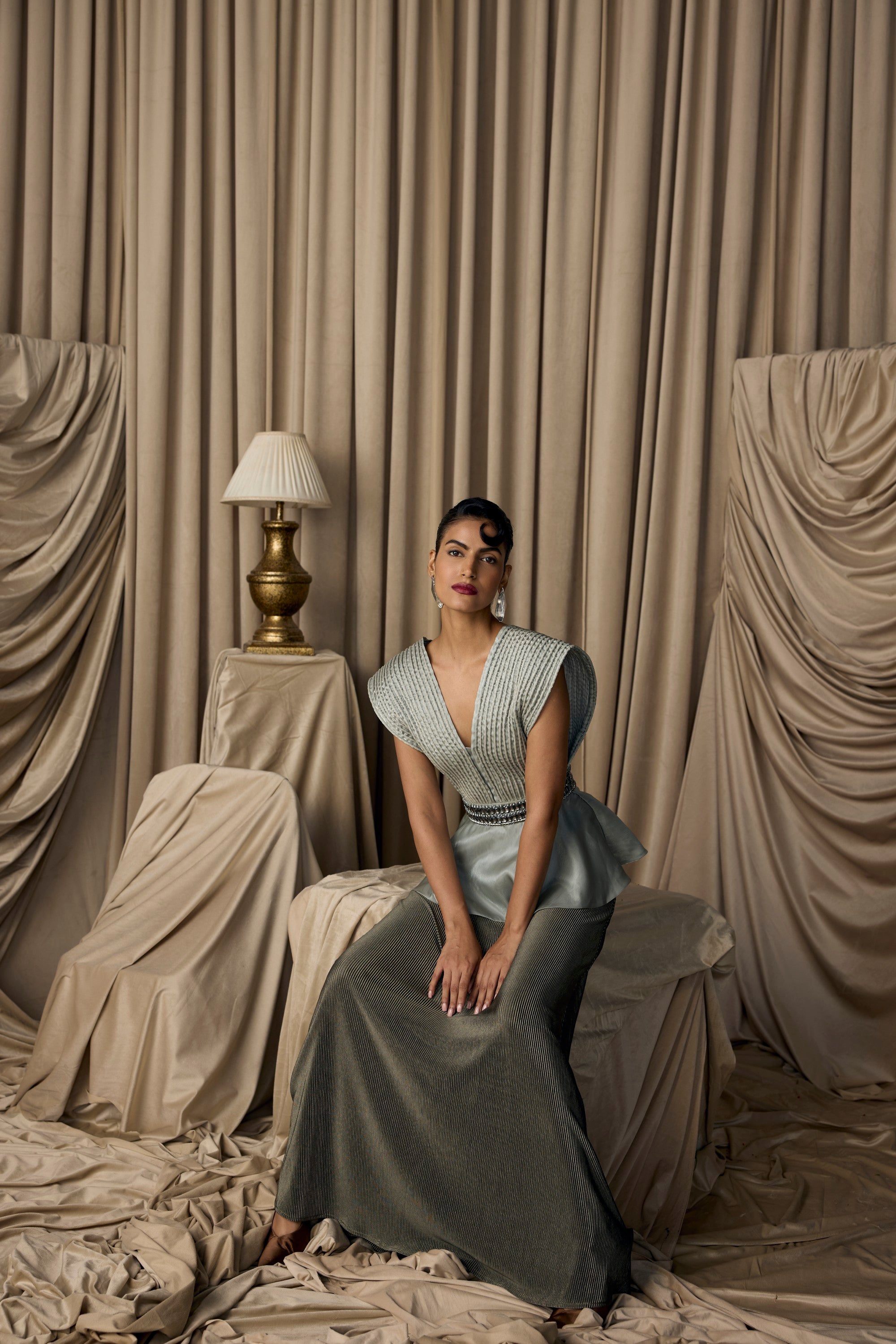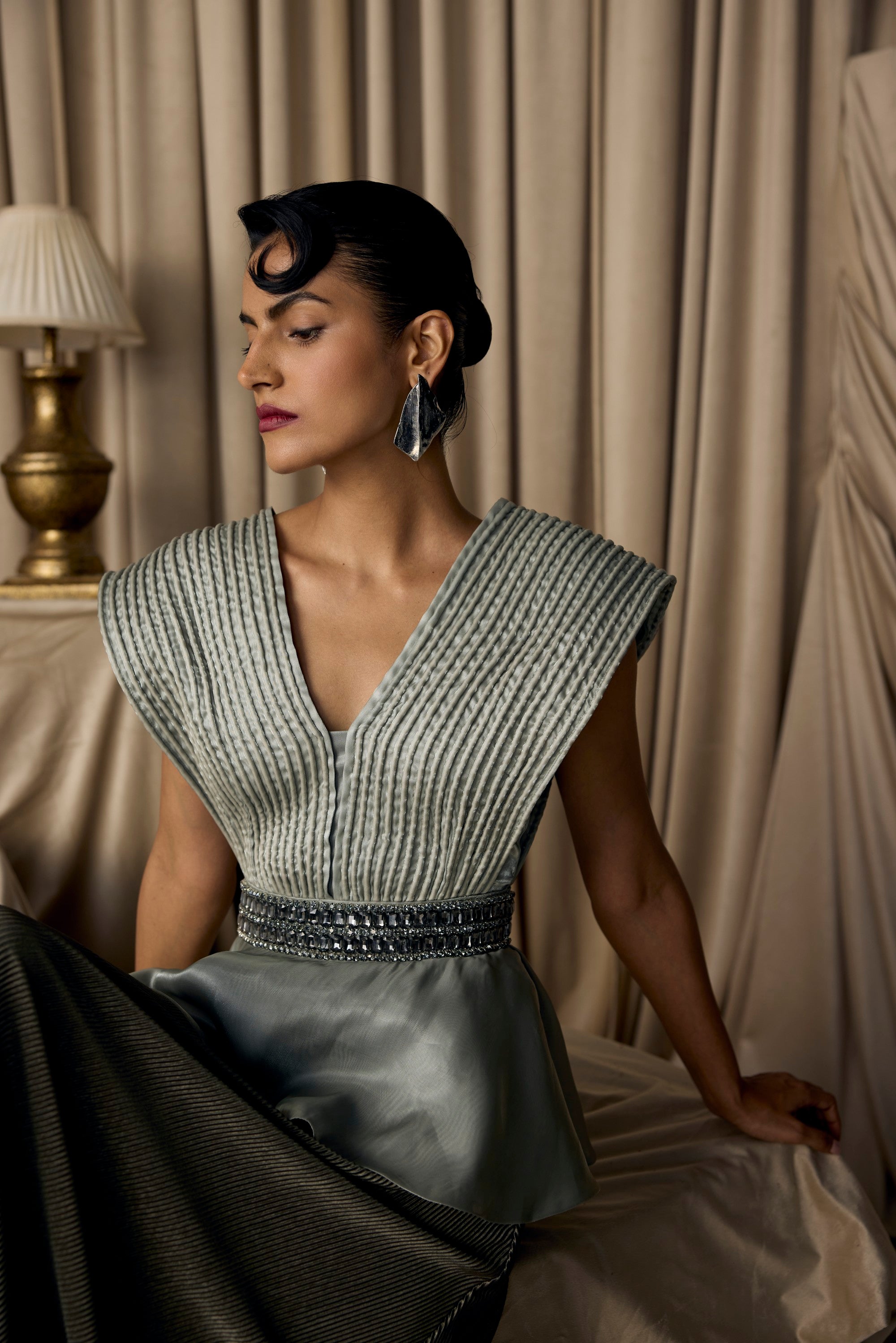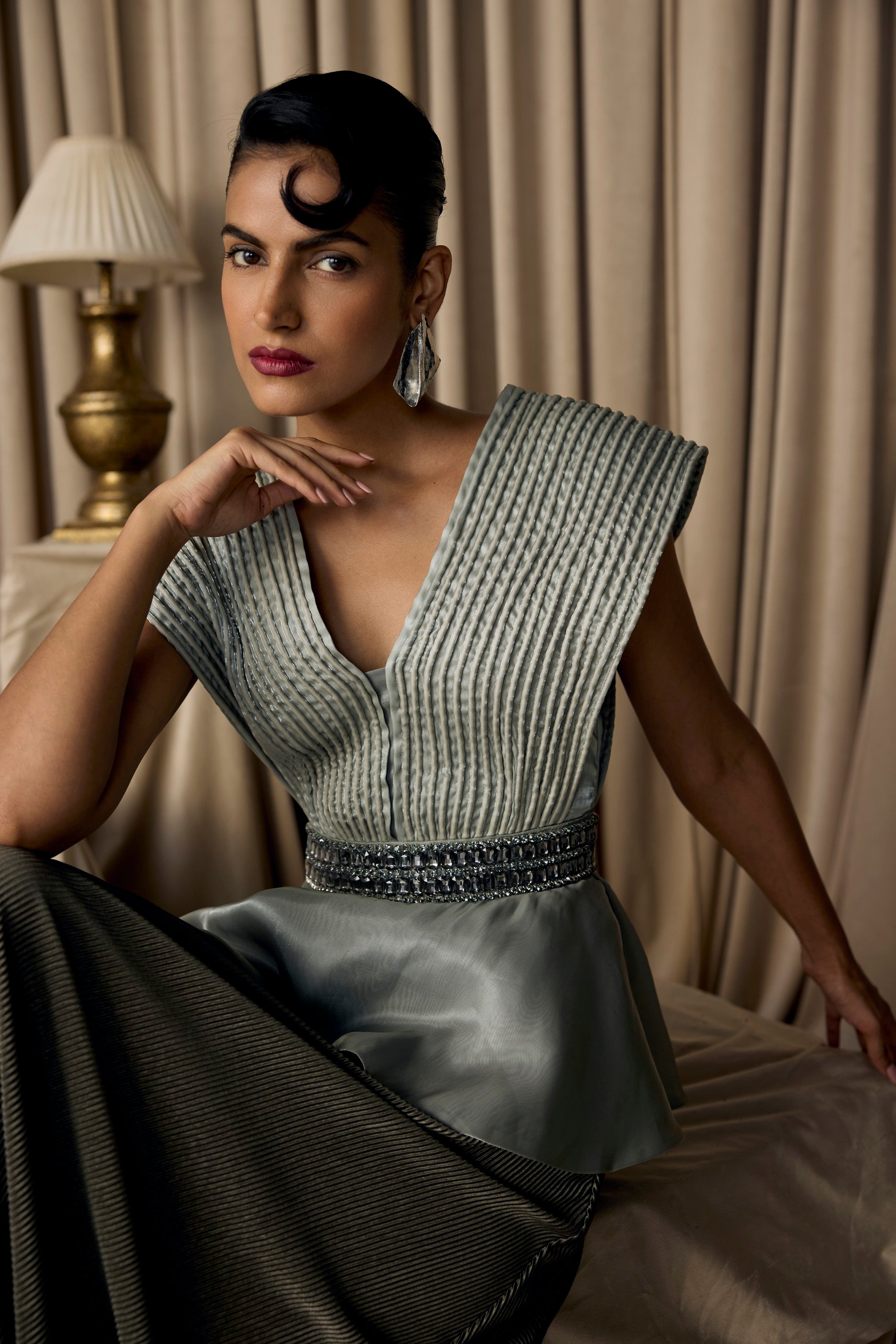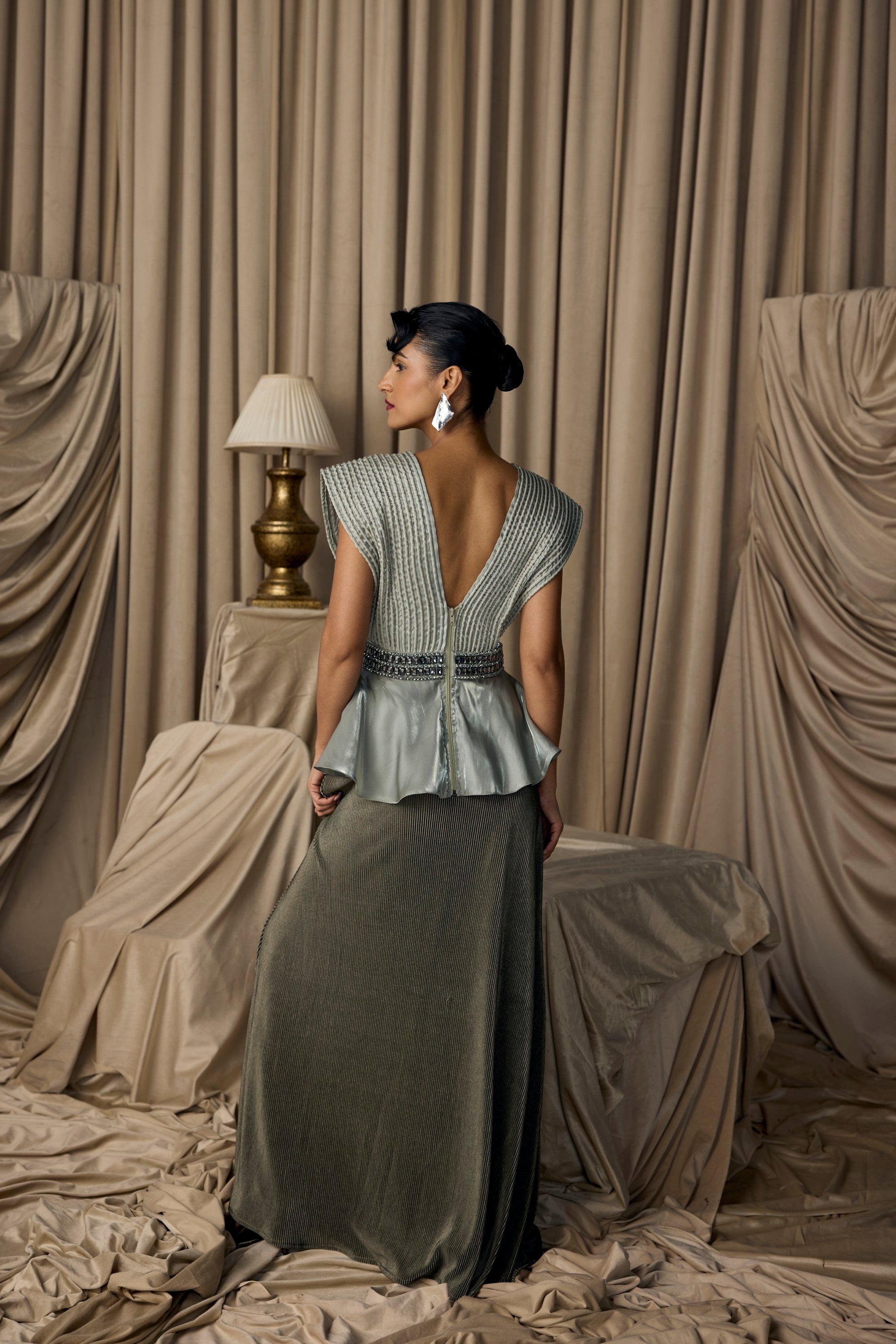 featuring the edgy dori work organza peplum top with crystal stone embroidery belt ,with high waisted pleated comfort fit skirt.