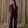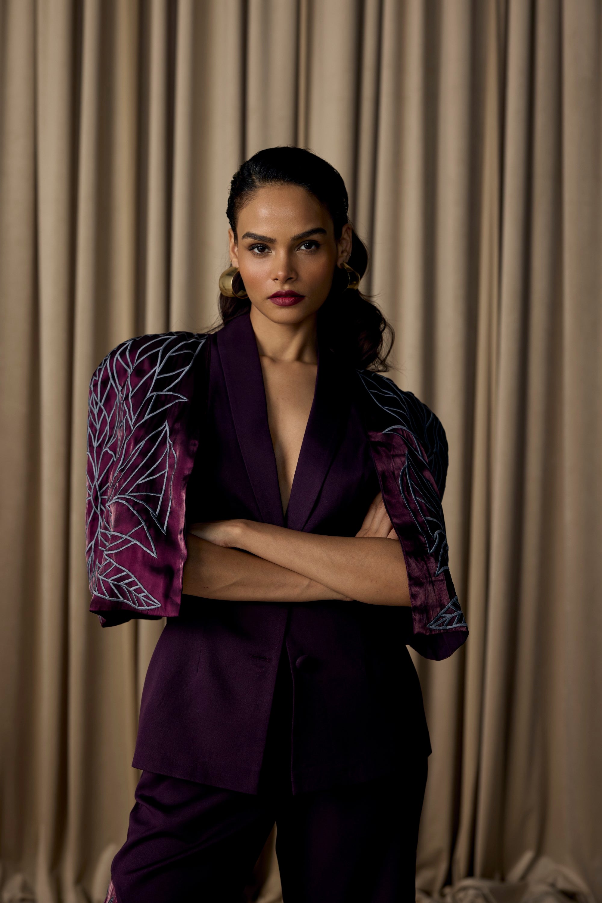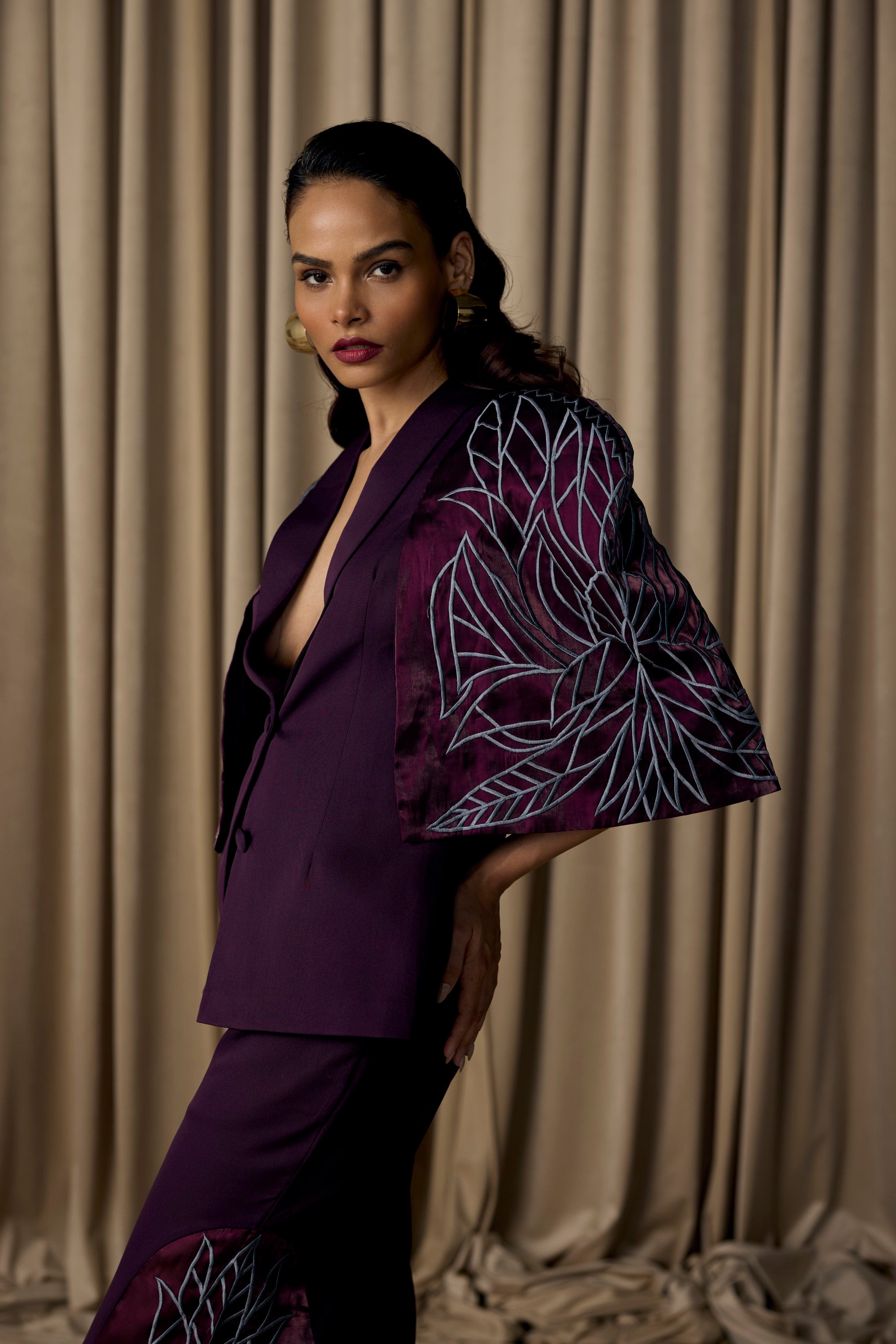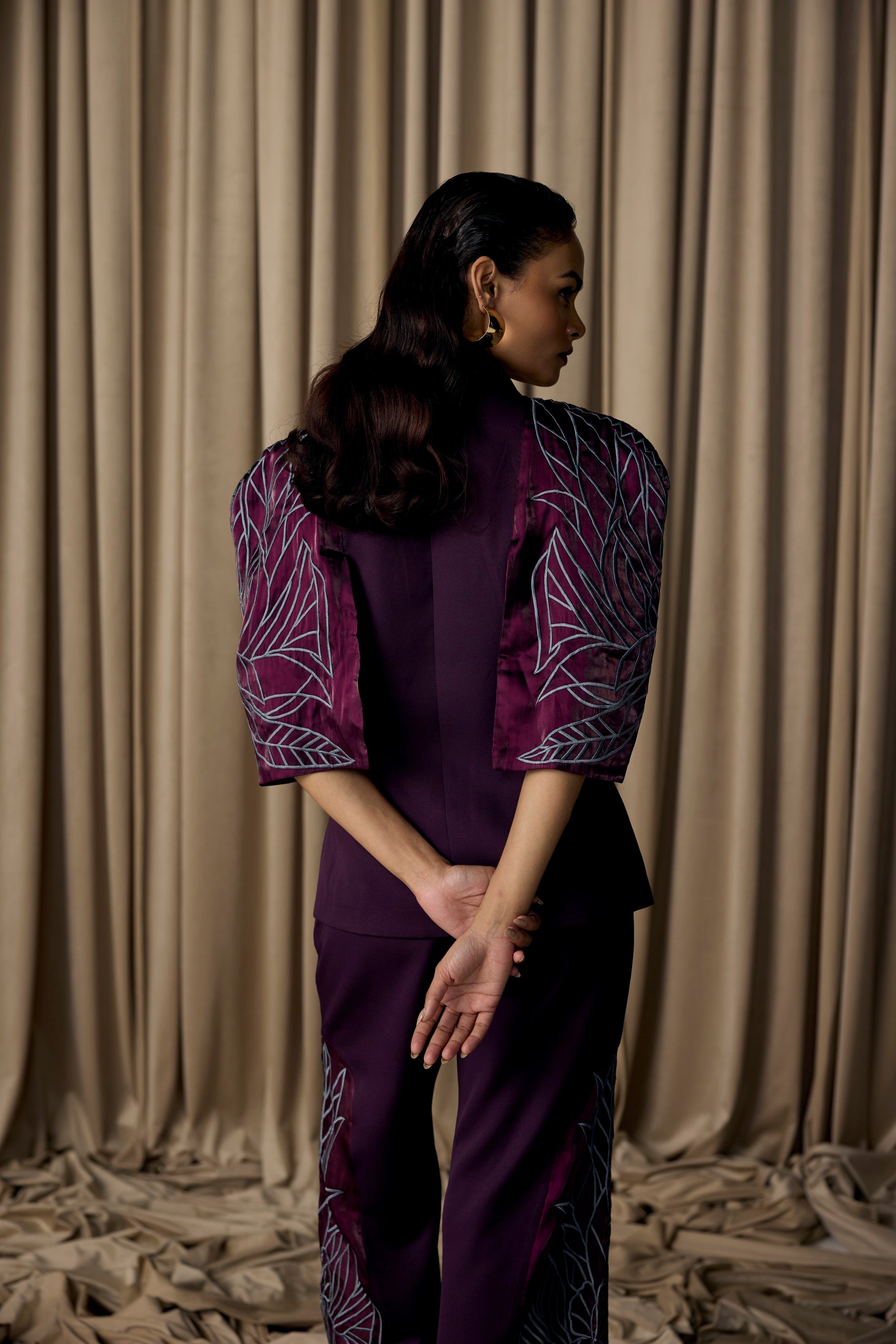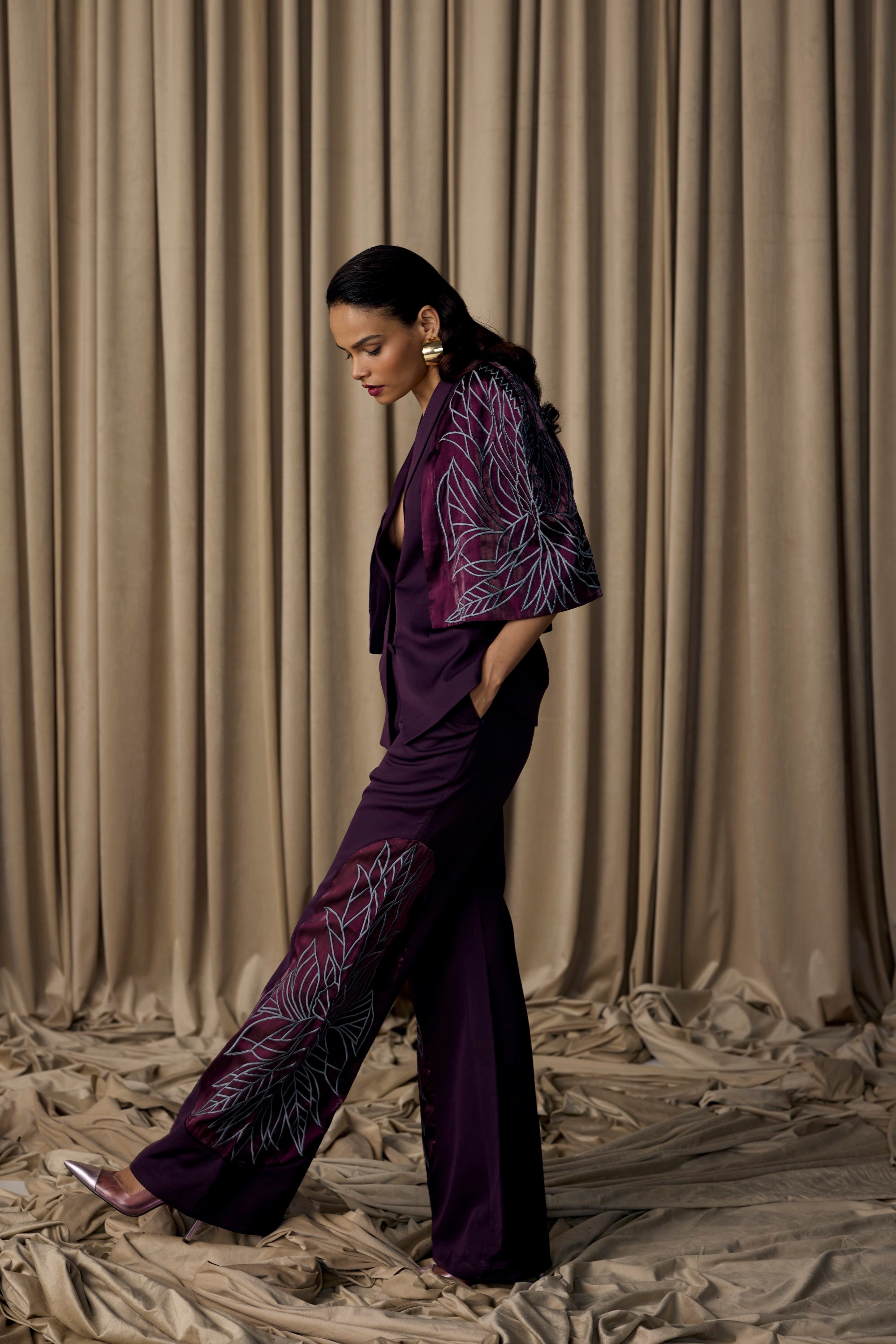 featuring the classic purple  blazer with organza slit sleeves embroidery paired with high waisted flair leg organza emboridered pannel pants