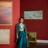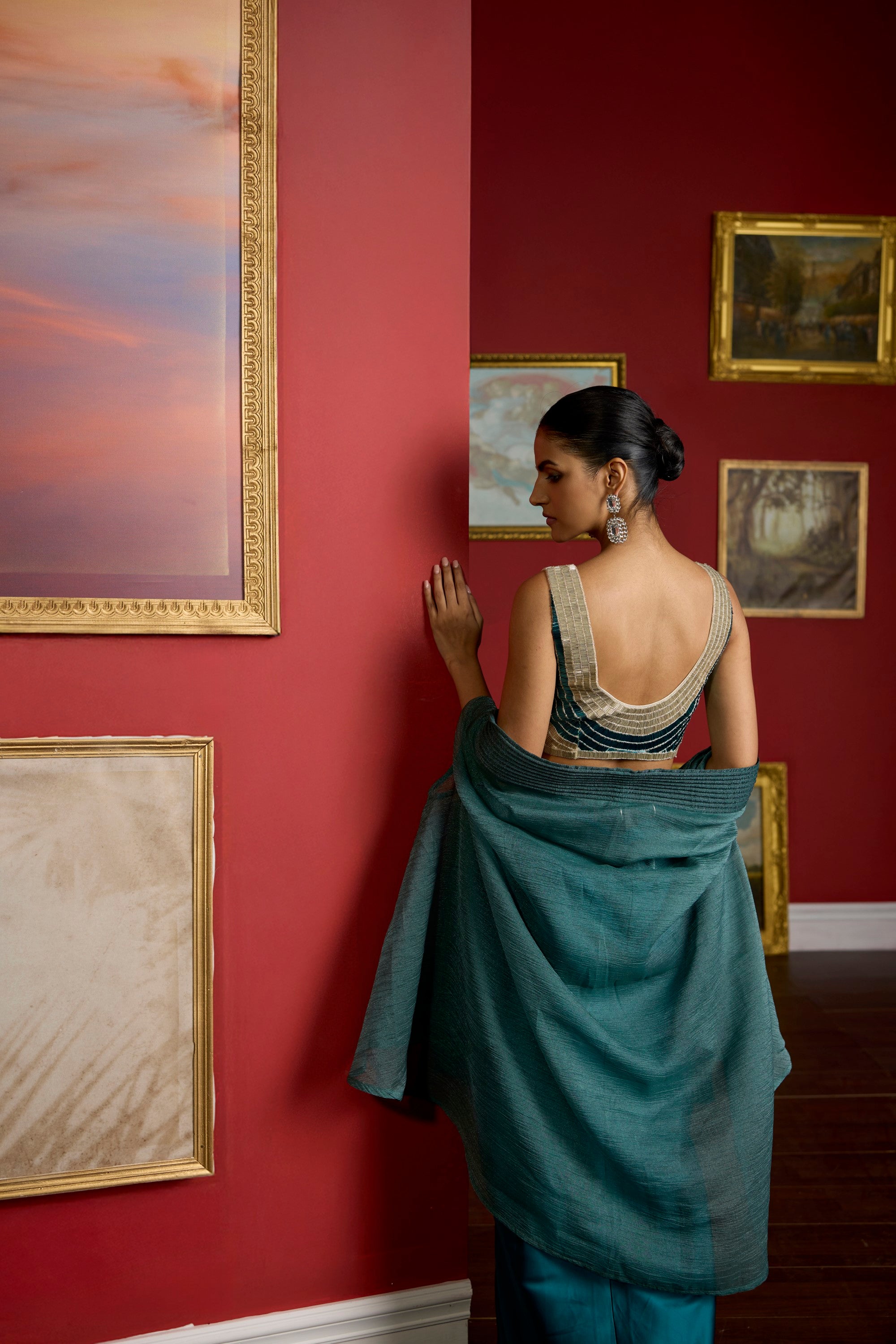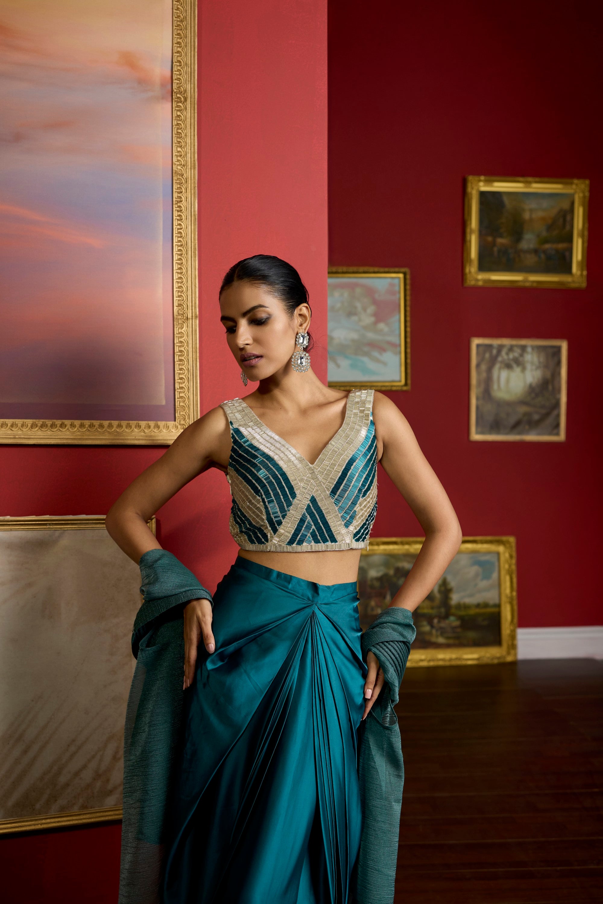 featuring the nalki work embellished blouse with armani satin exlcusive drape dhoti style skirt, adorned with a dori work organza cape