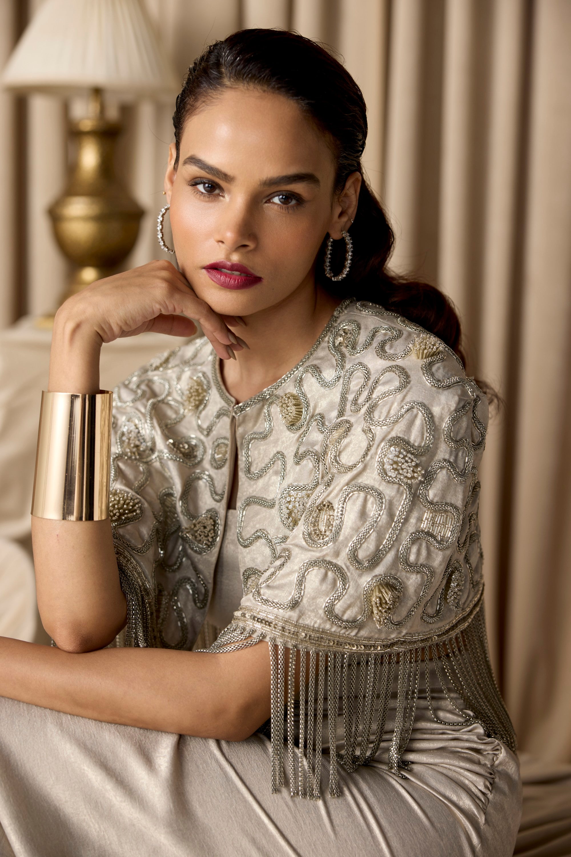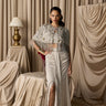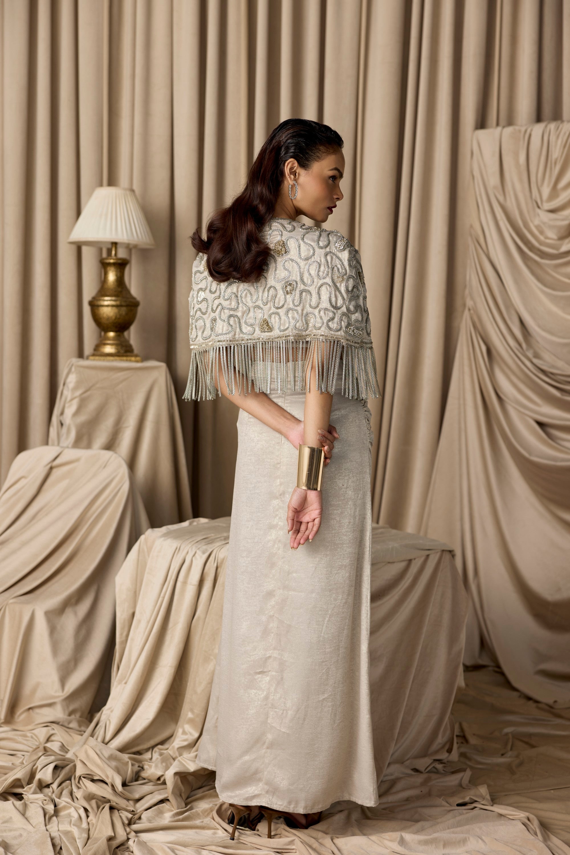featuring the zeel embroidered cape embellished chains, the cape is paired with a drape slit skirt and busiter