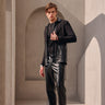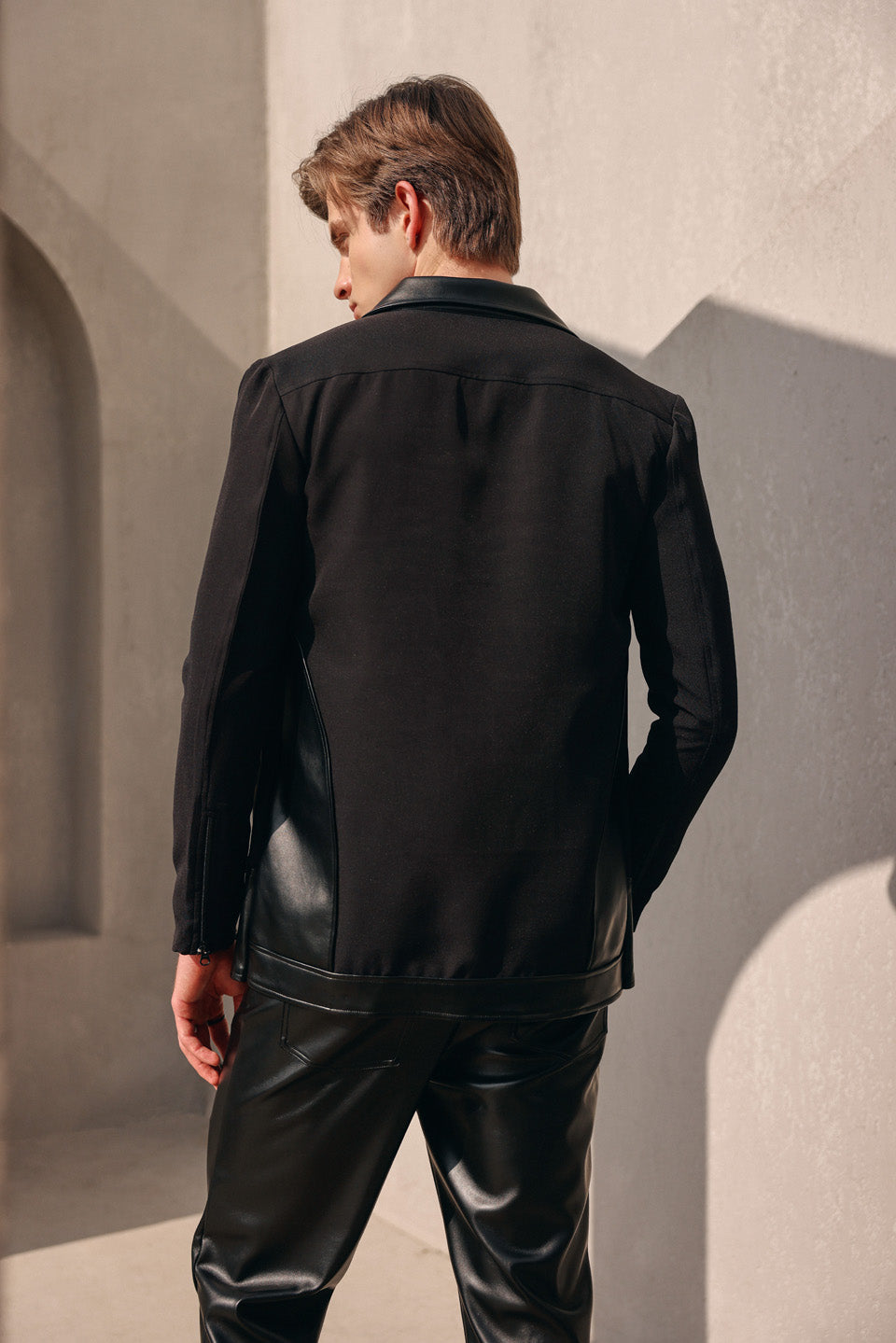 Featuring the black leather and crepe contrasting work zipper jacket, leather pants