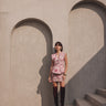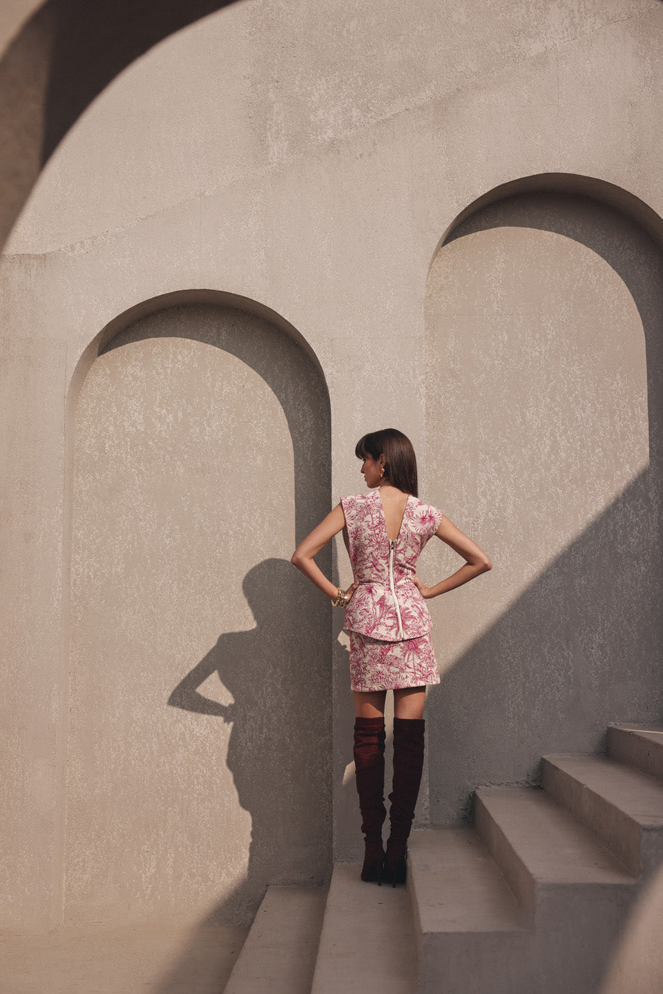 Featuring the archive vintage beige pink peplum edgy top with enchanting gold buckles, paired skirt
