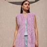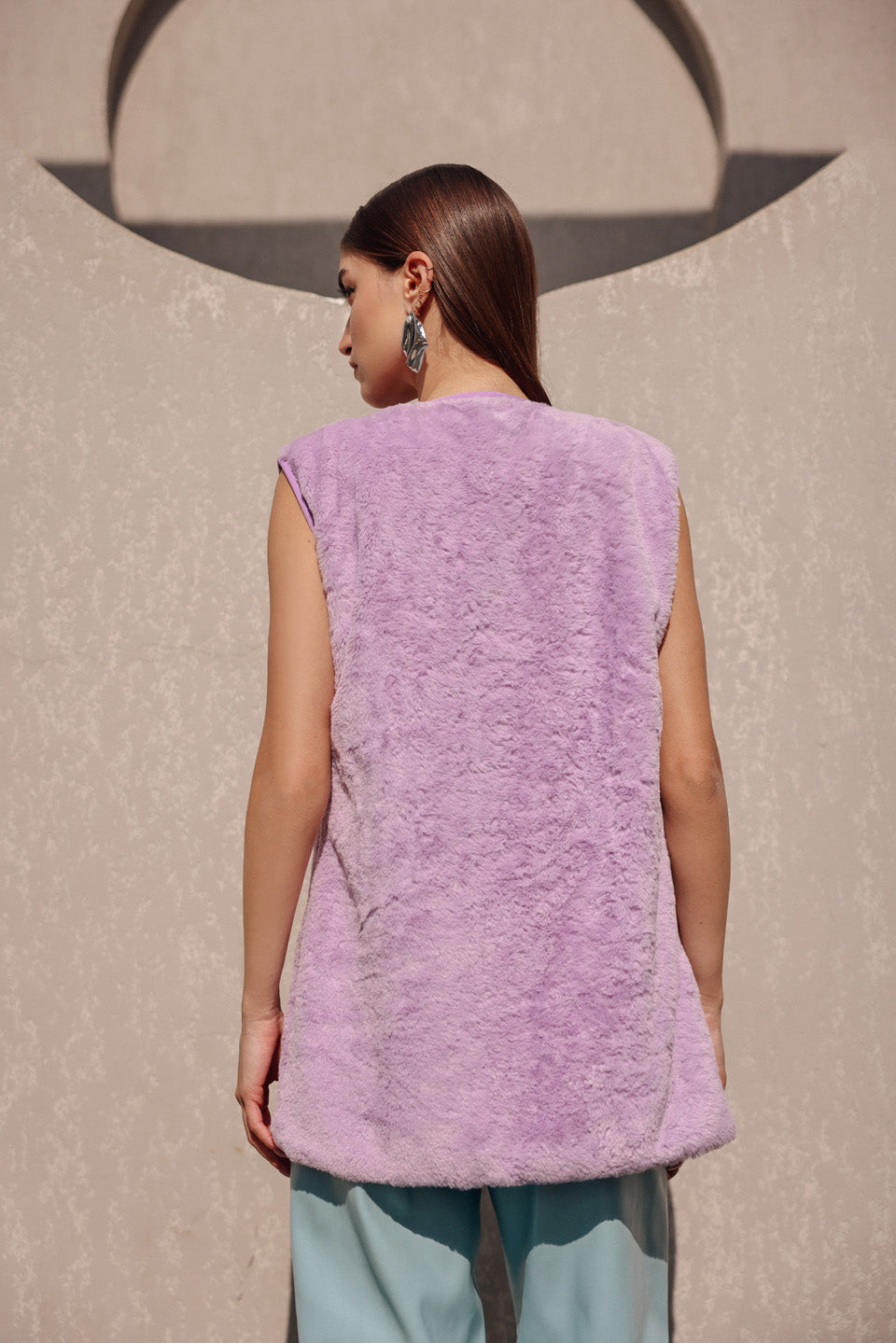 Featuring the lavender sleeveless fur jacket