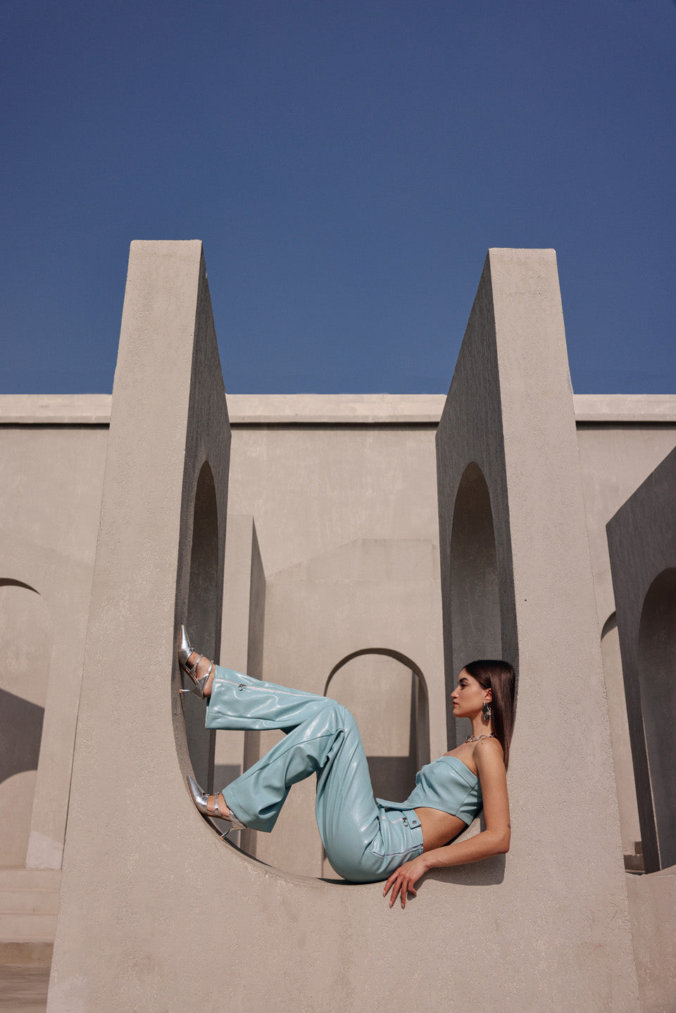 Featuring the ice blue zip detaling bustier paired with zip pants
