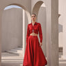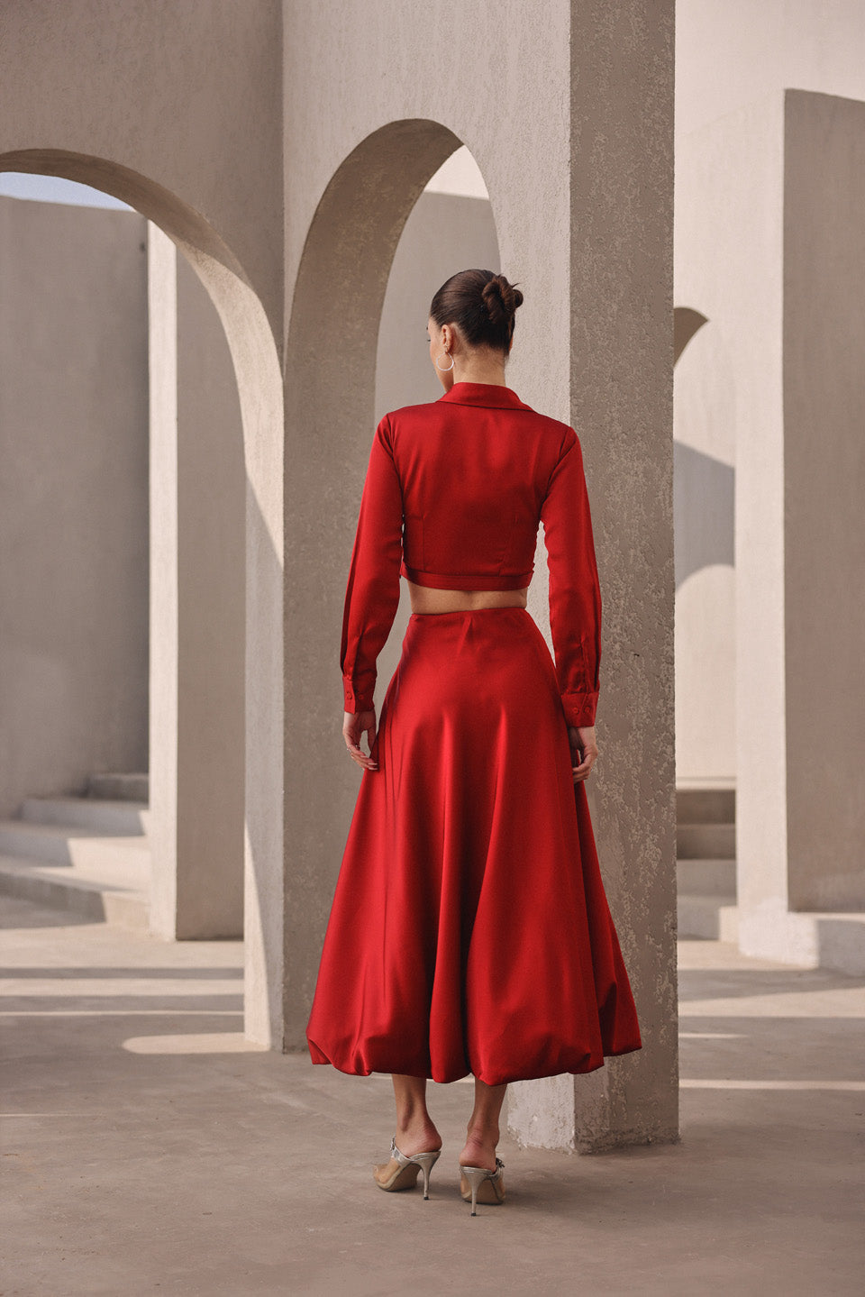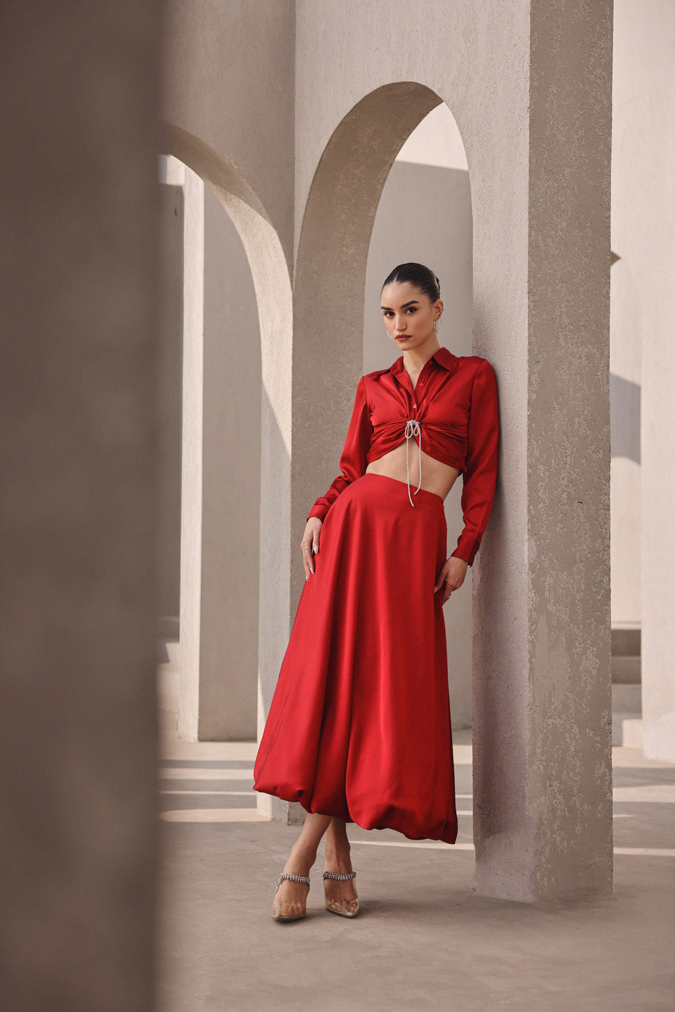 Featuring the cropped knotted crystal top with high waisted balloon satin skirt