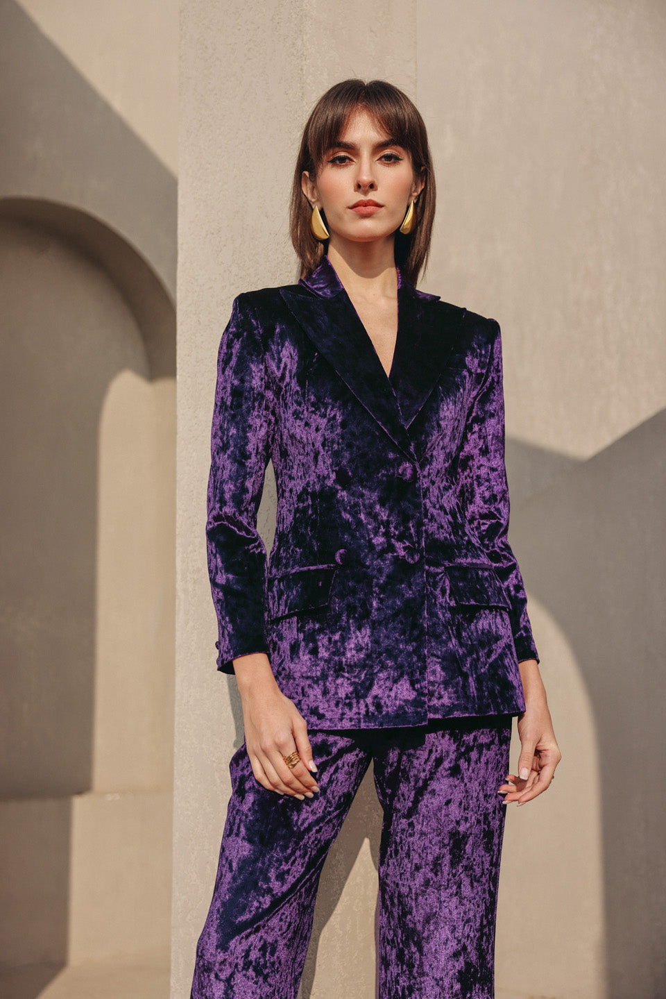 Featuring the classic edgy double breasted velvet blazer with flaired pants