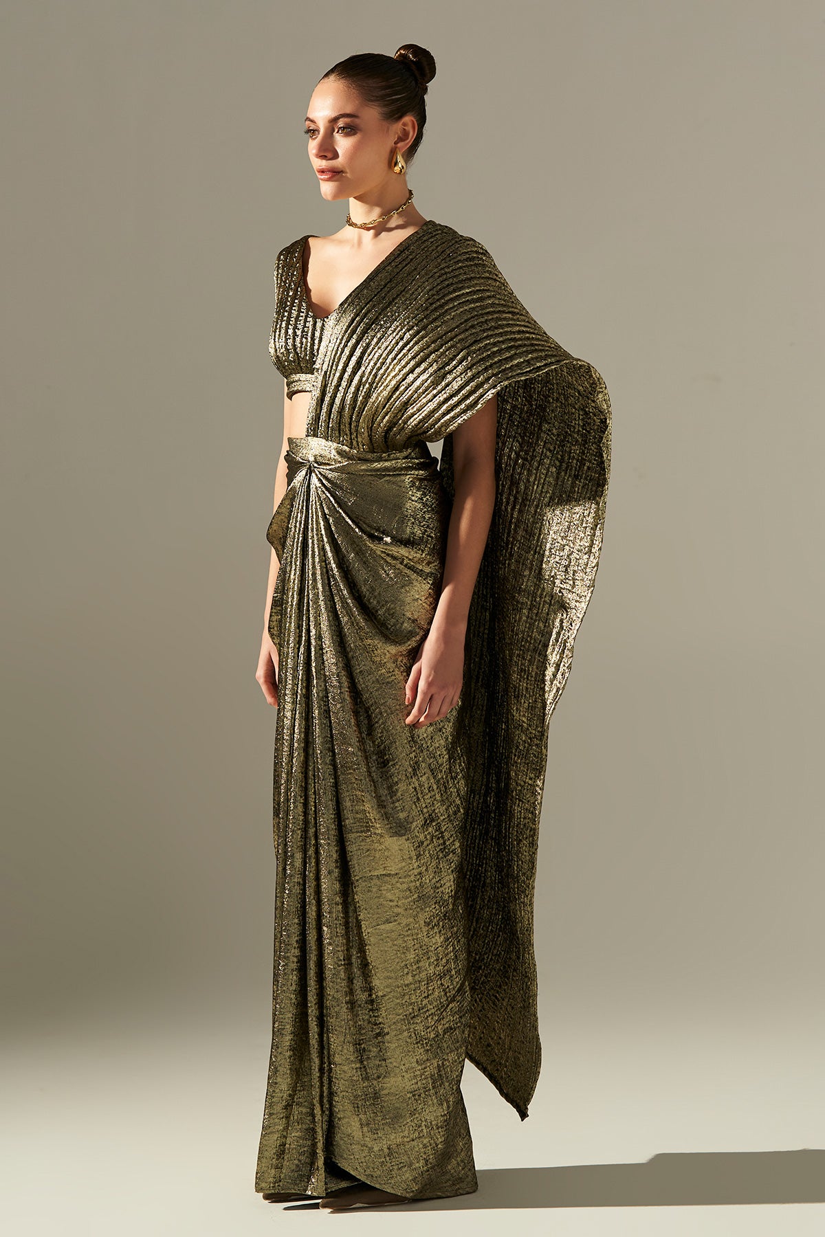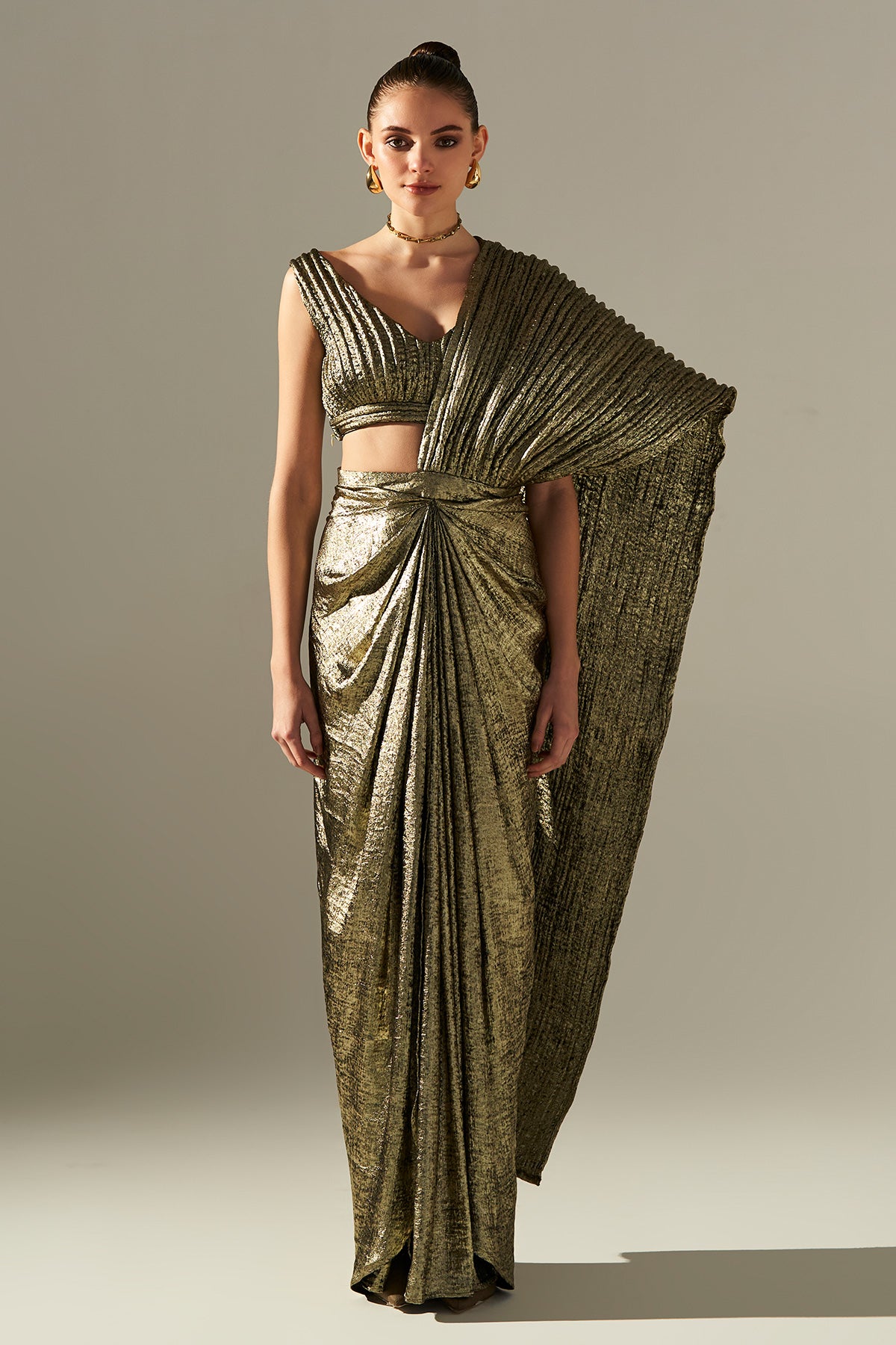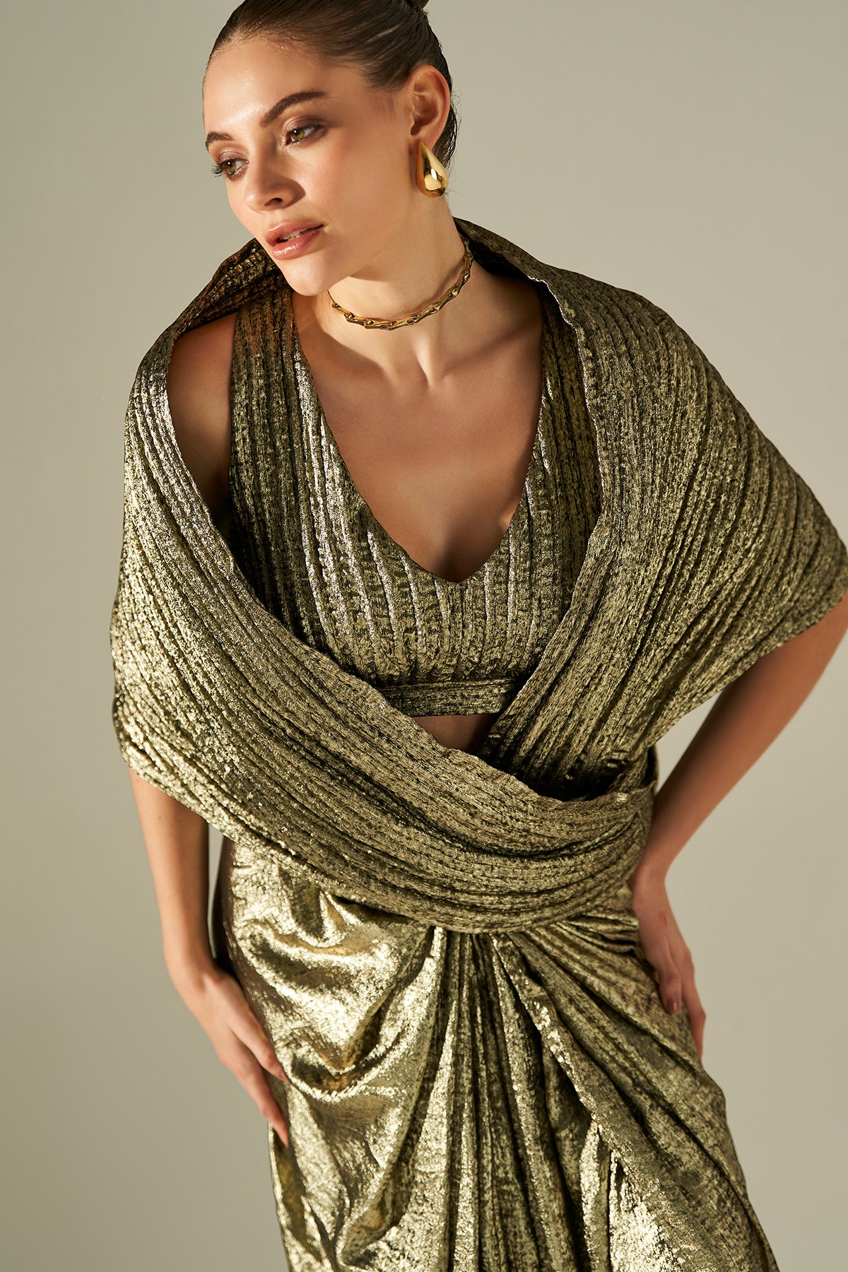 Metallic Gold Dori Drape Skirt Saree With Dori Blouse