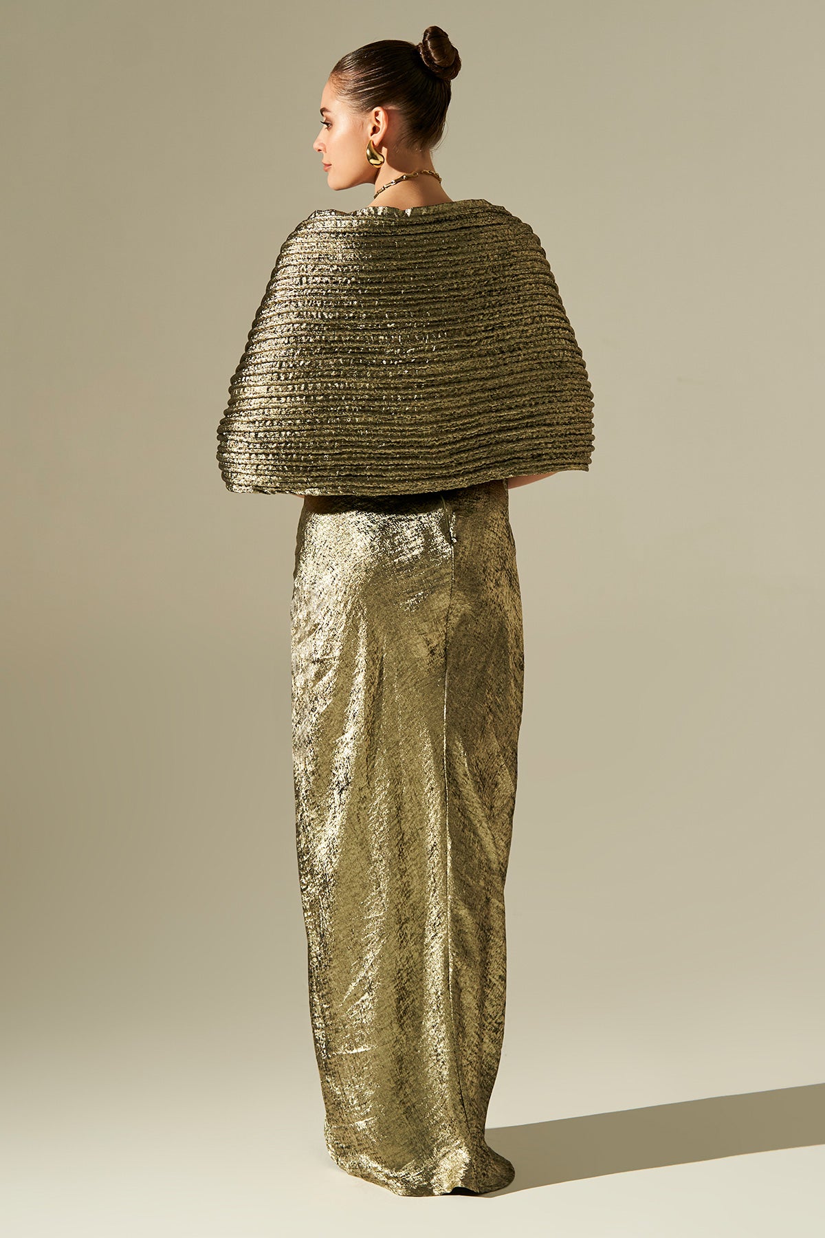 Featuring The Metallic Gold Drape Skirt Saree With The Hand Dori Work Pallu And Dori Work Stiched Blouse.