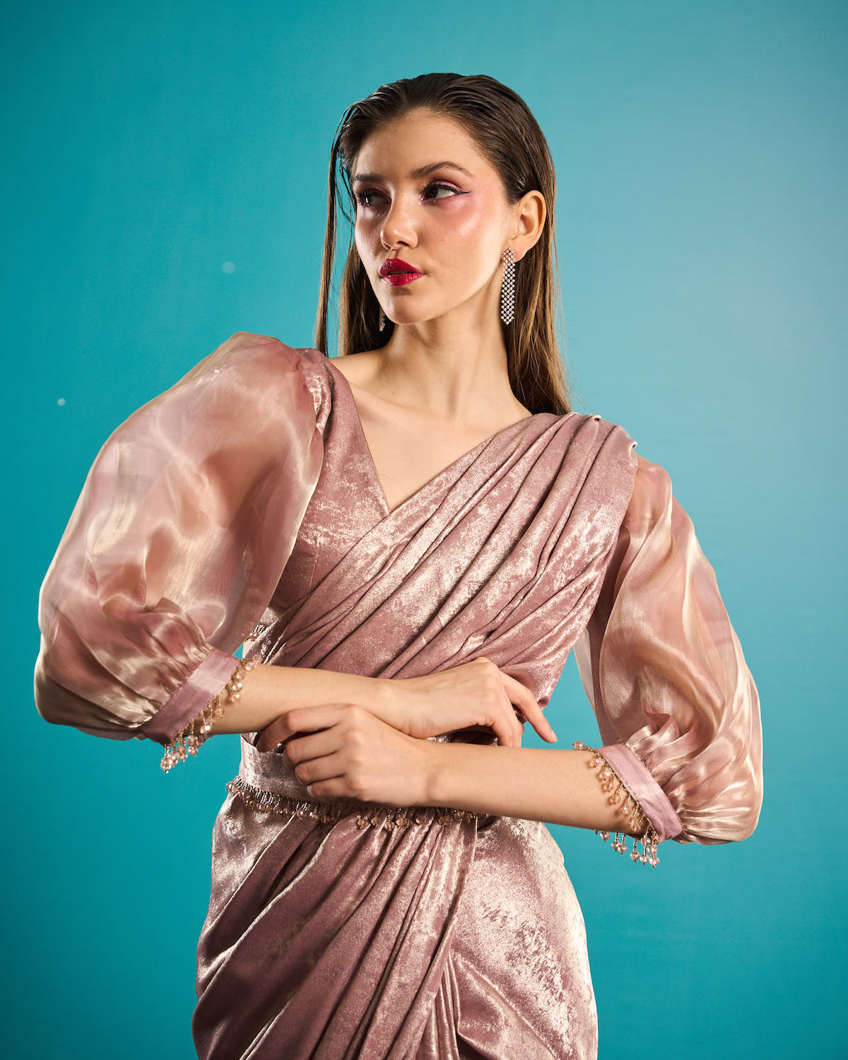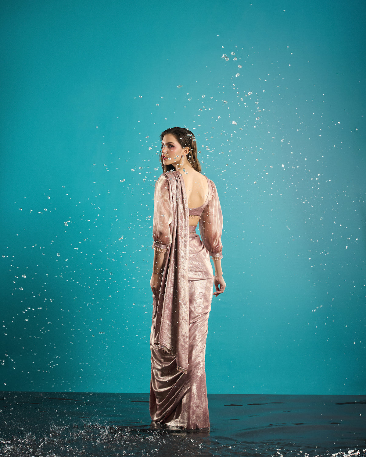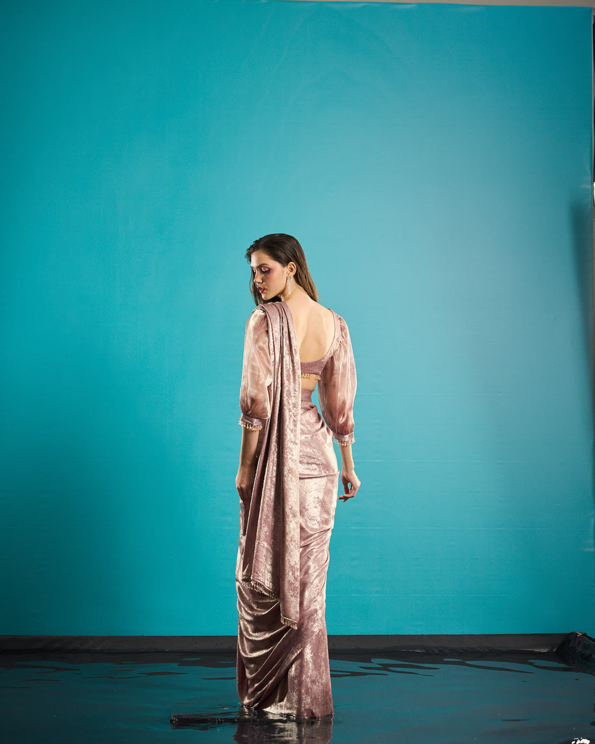 Foil rose gold organza sleeves pre-stiched saree