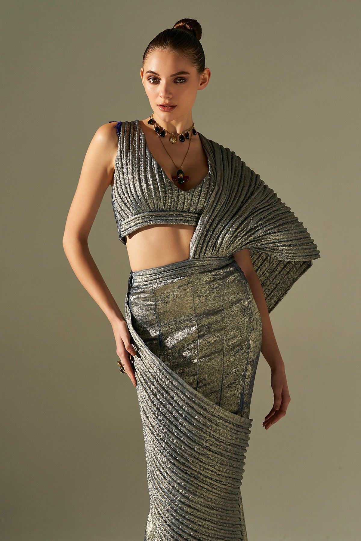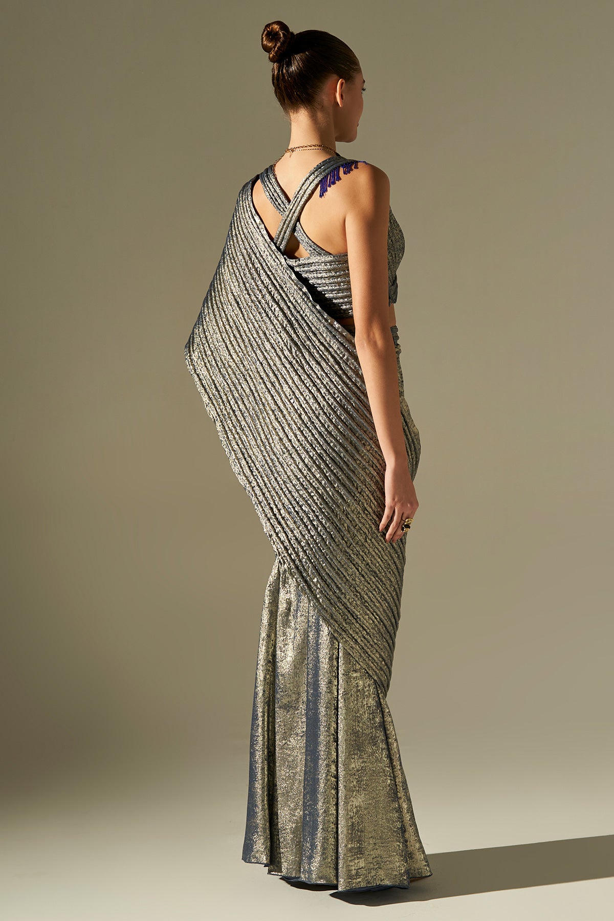 Metallic Blue Dori Skirt Saree With Dori Blouse