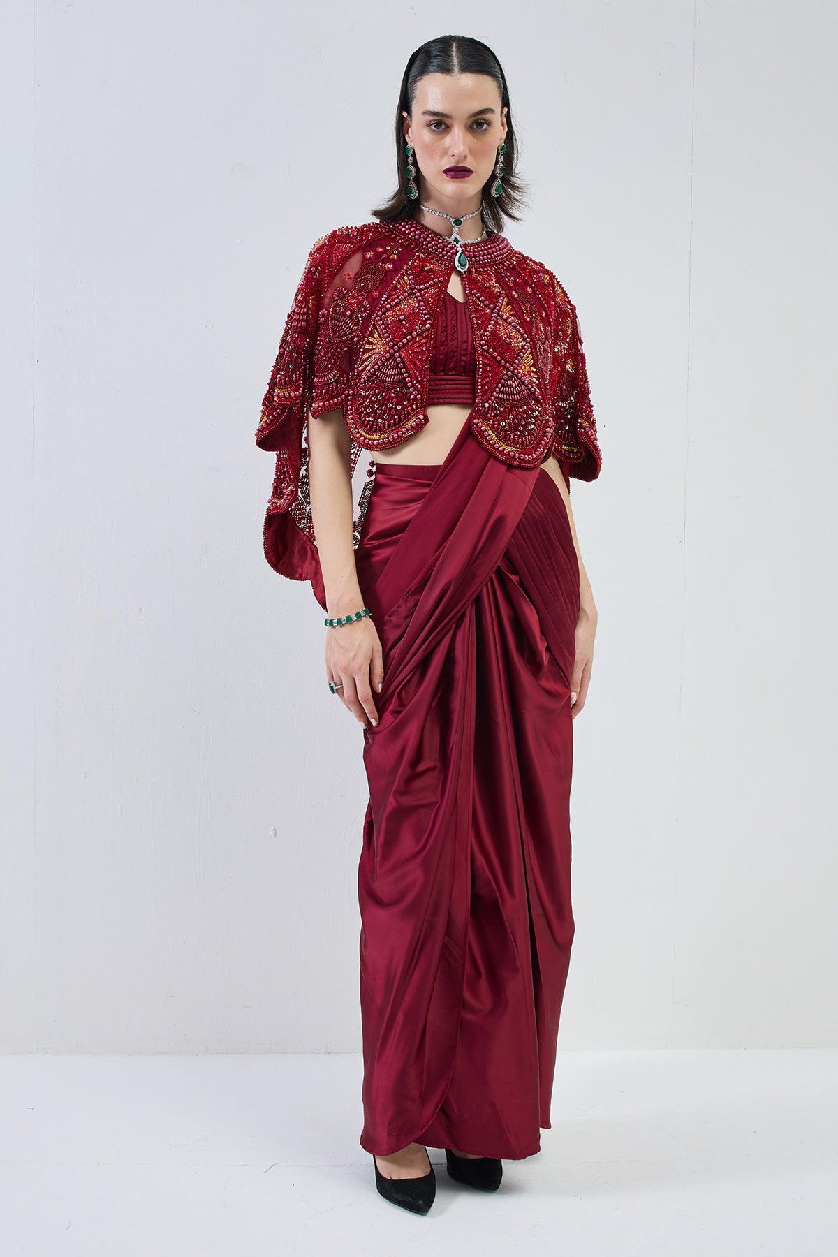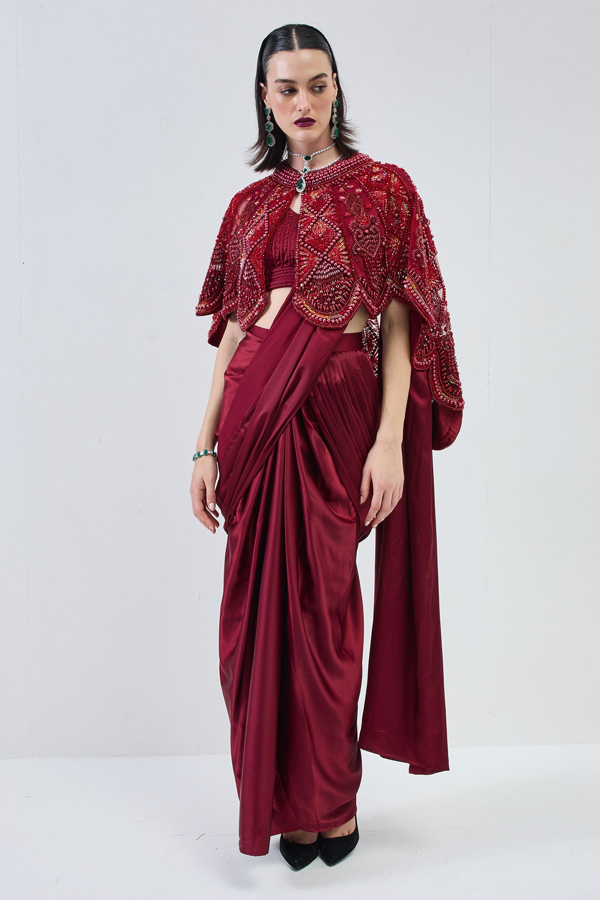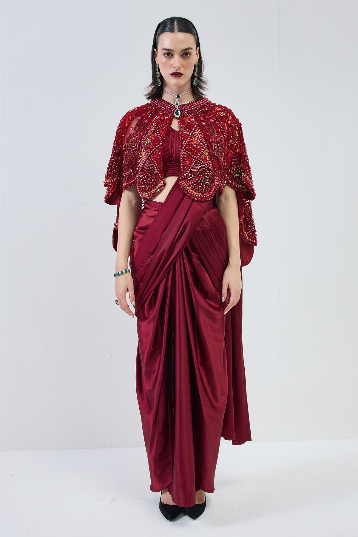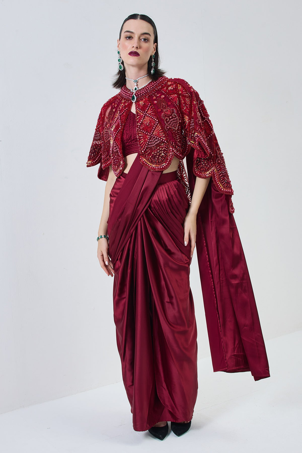 pre-stiched drape saree with dori blouse with cape-maroon red