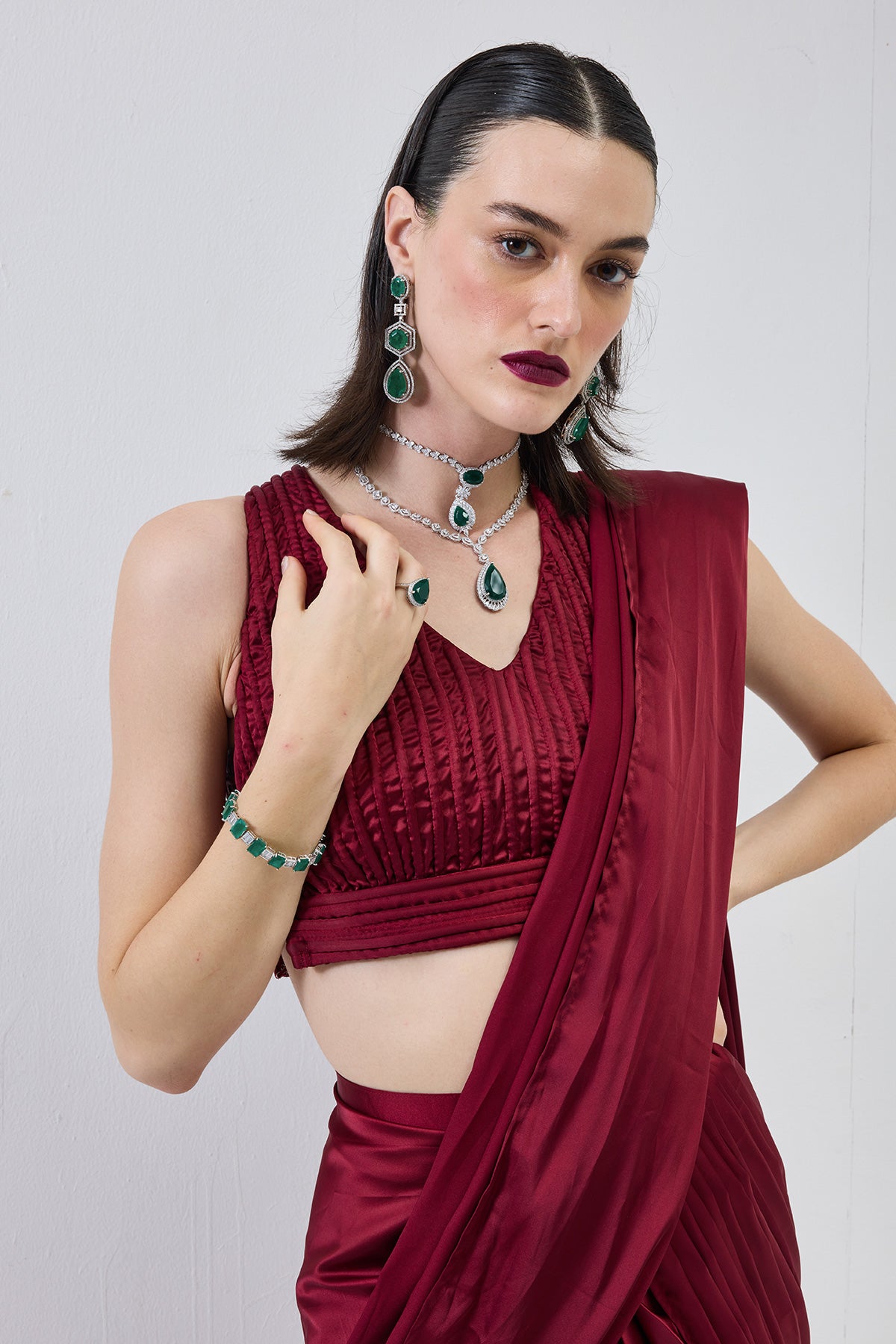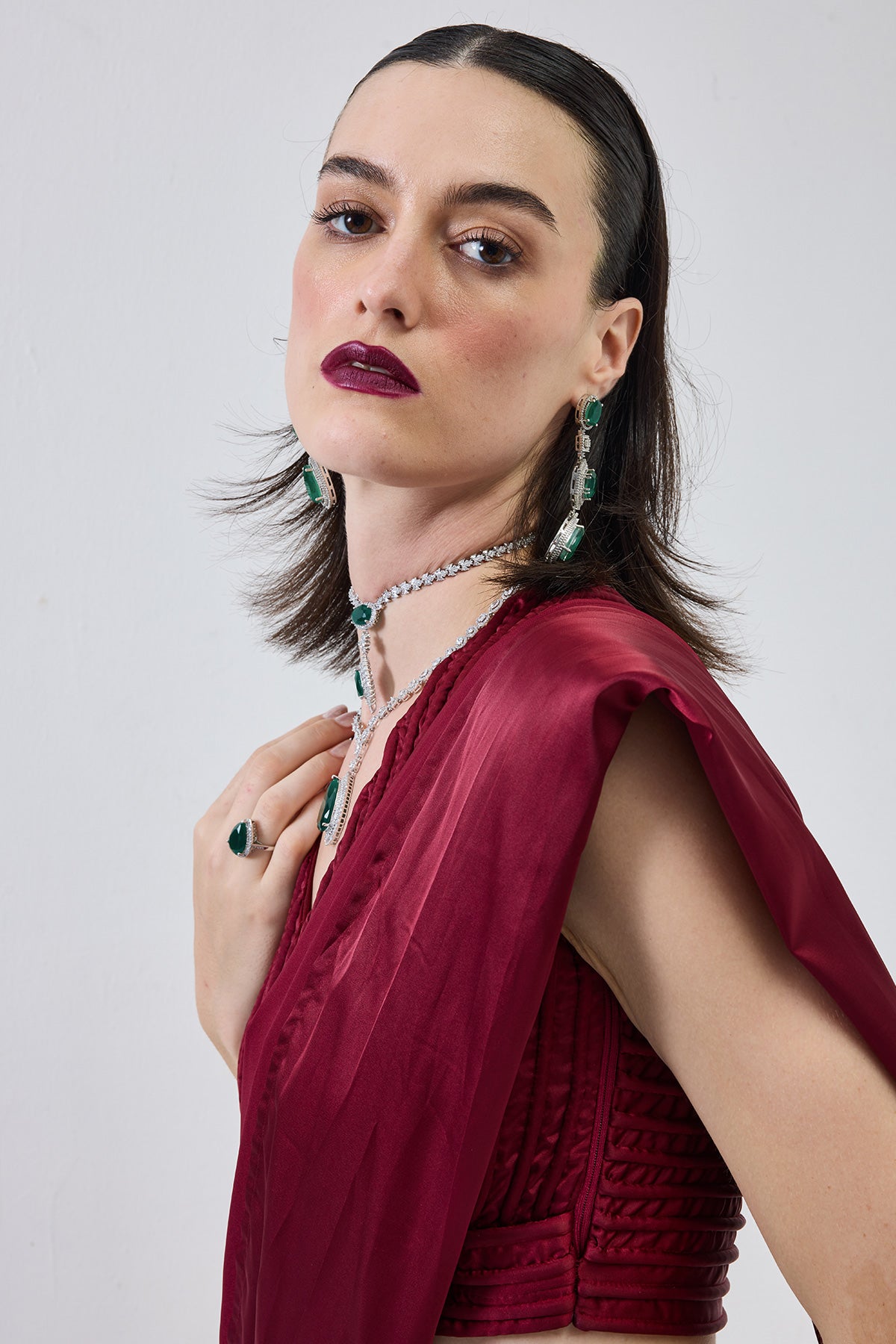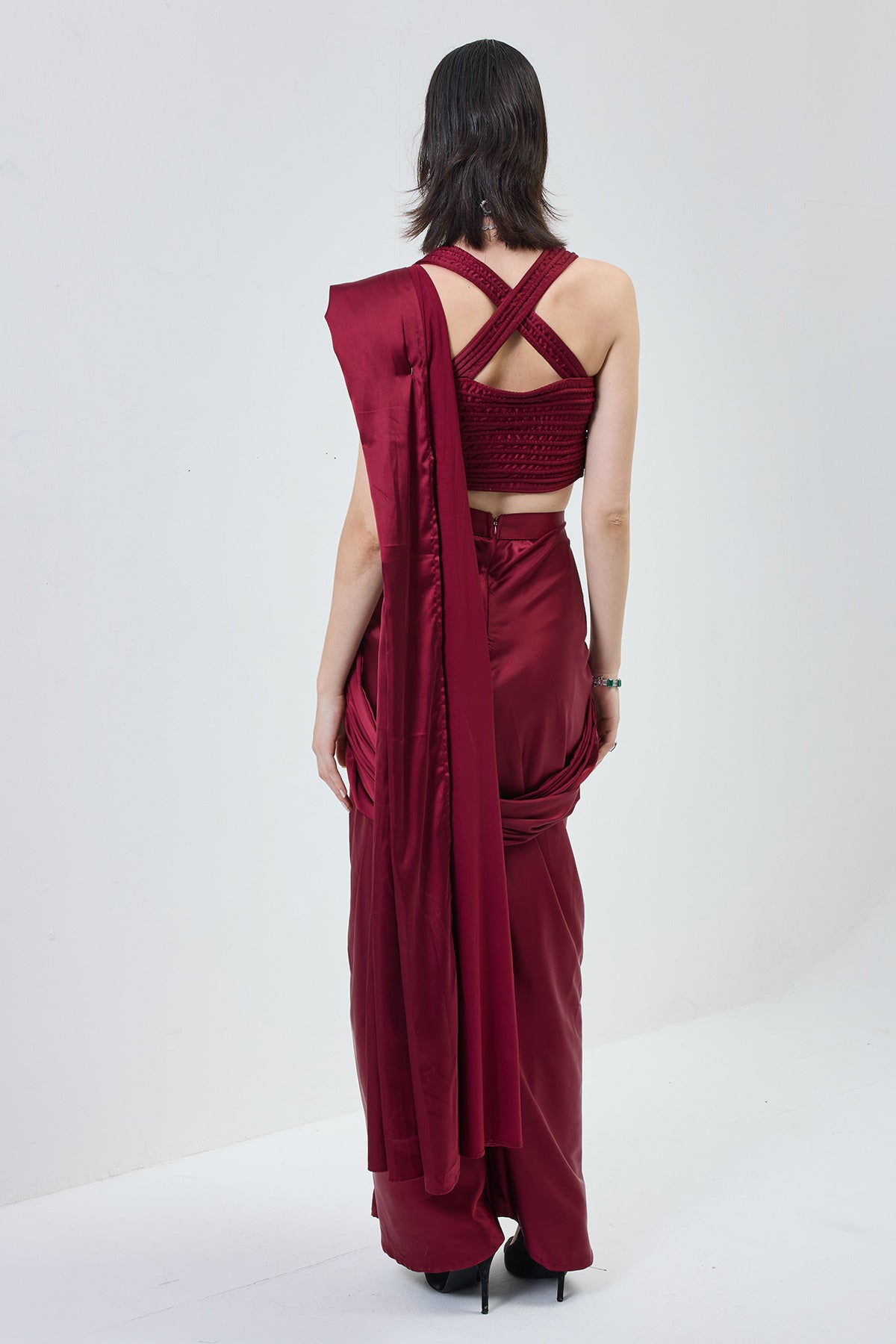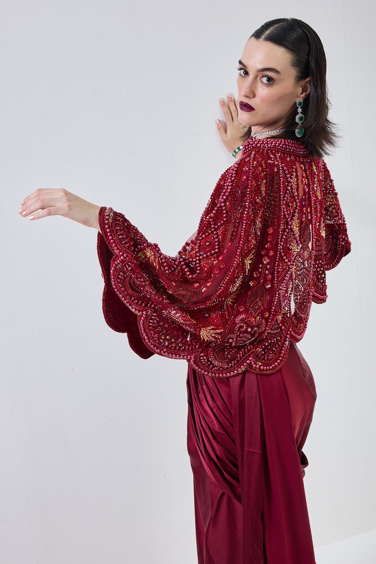 pre-stiched drape saree with dori blouse with cape-maroon red