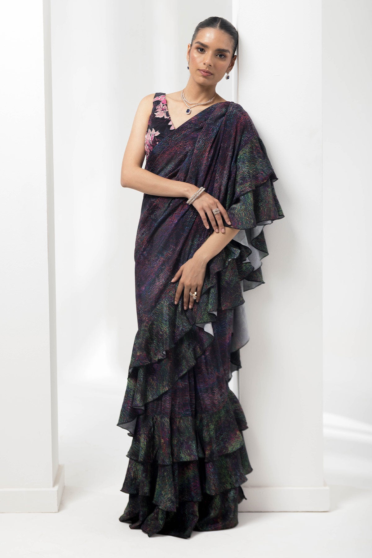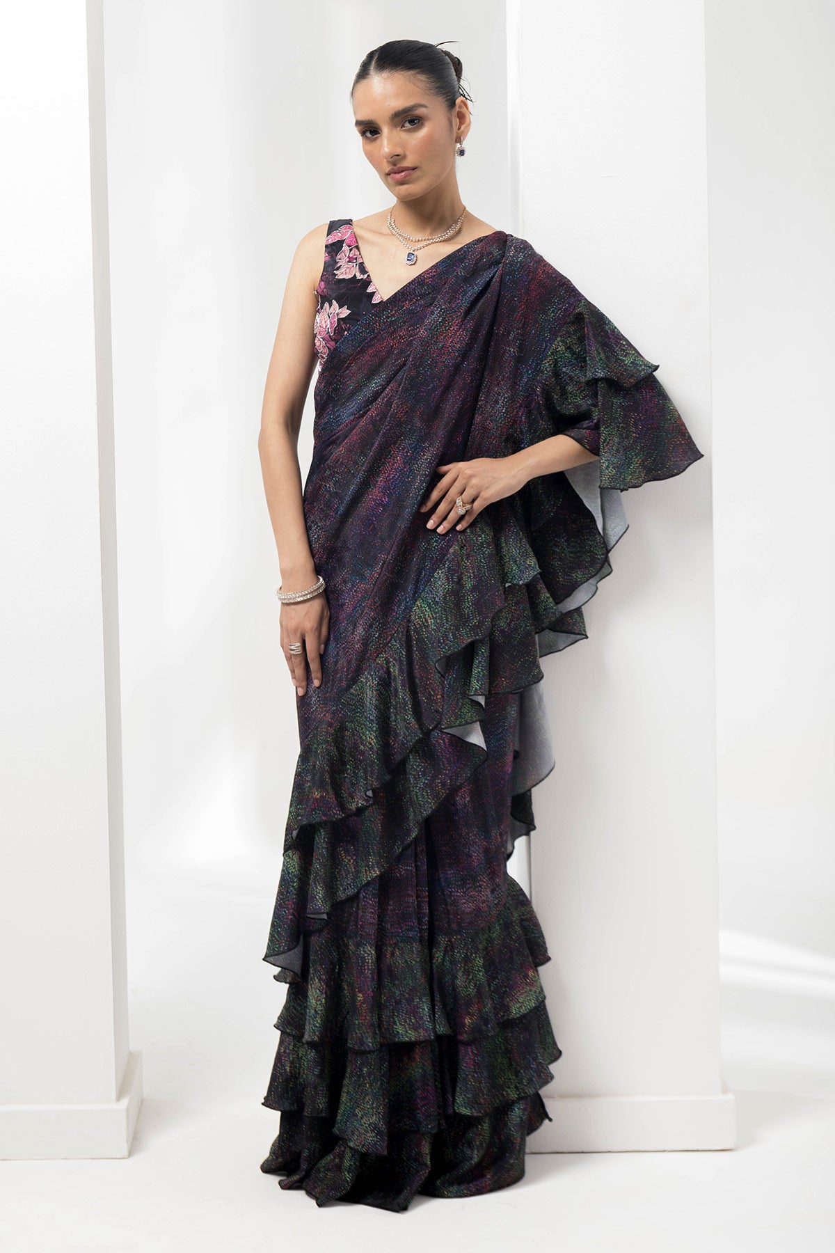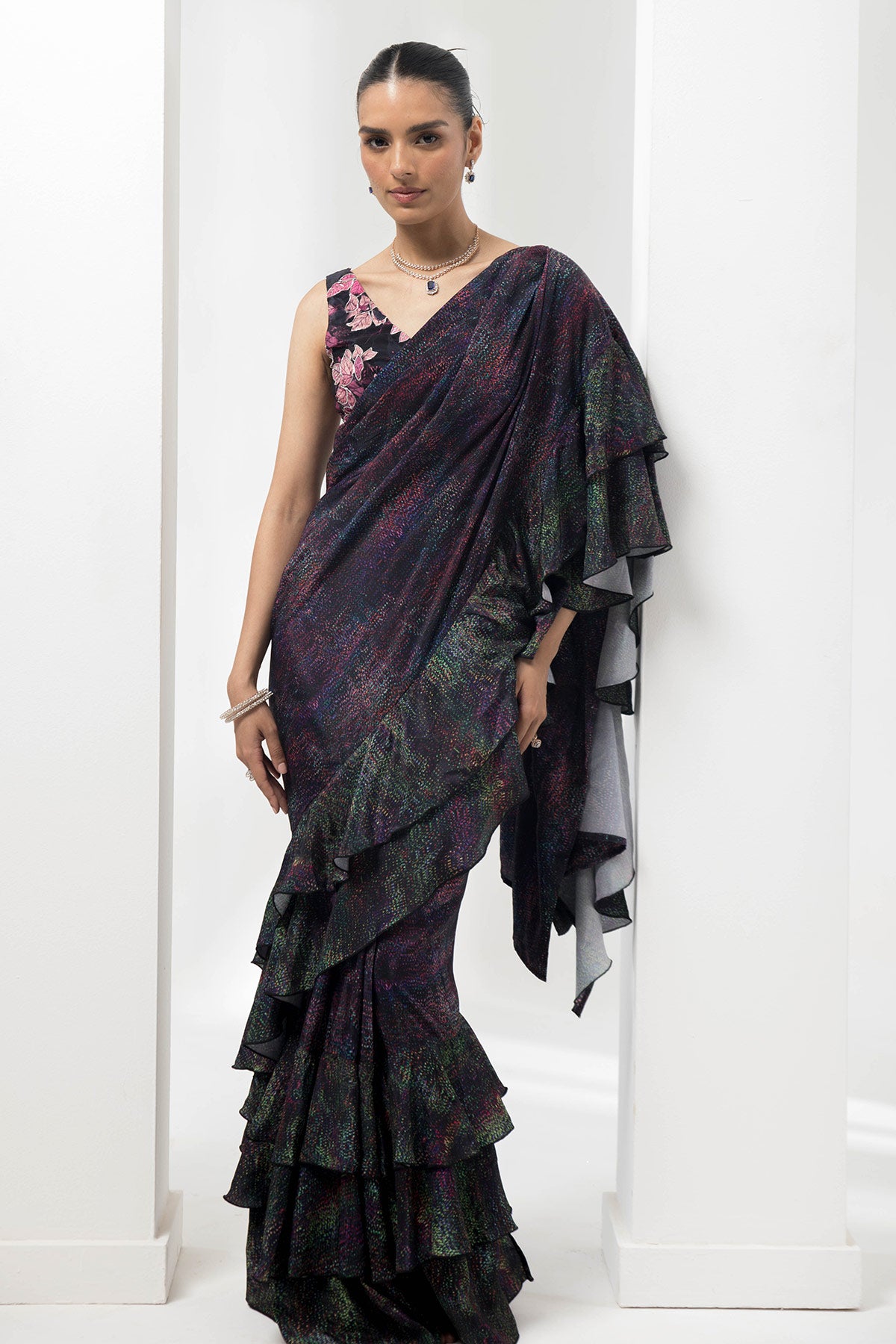 wave-ruffled pre-stiched saree with flauna highlighting blouse