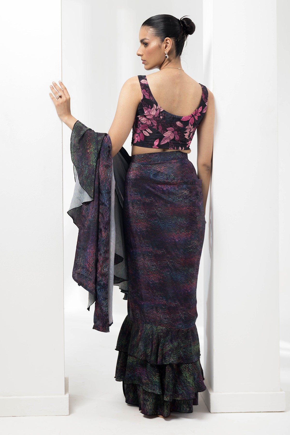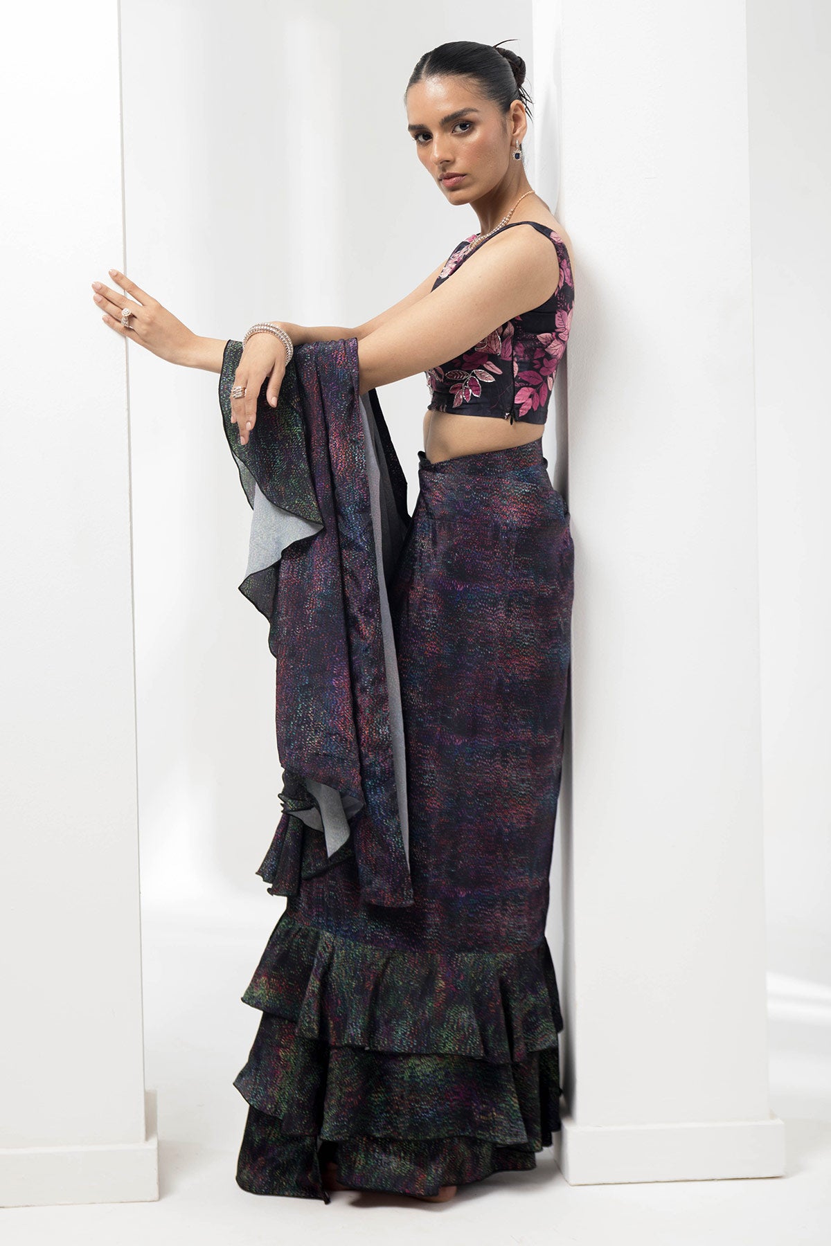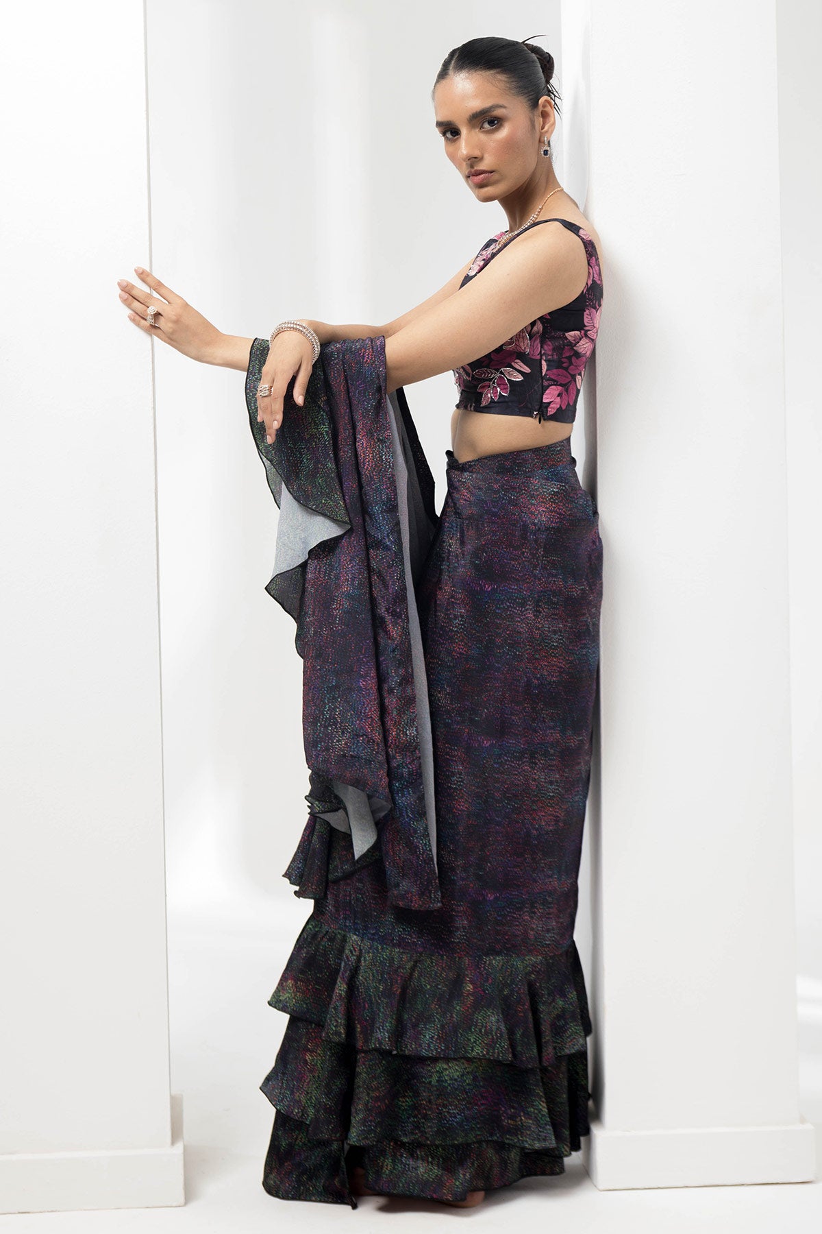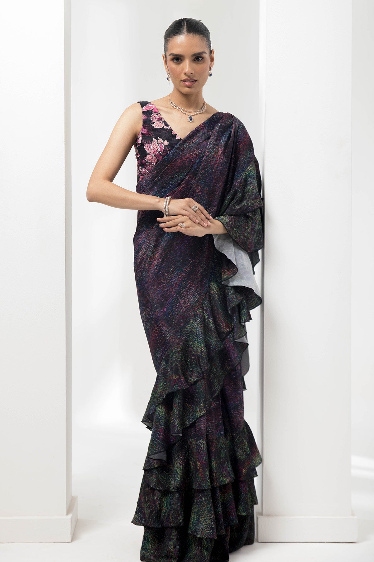 wave-ruffled pre-stiched saree with flauna highlighting blouse
