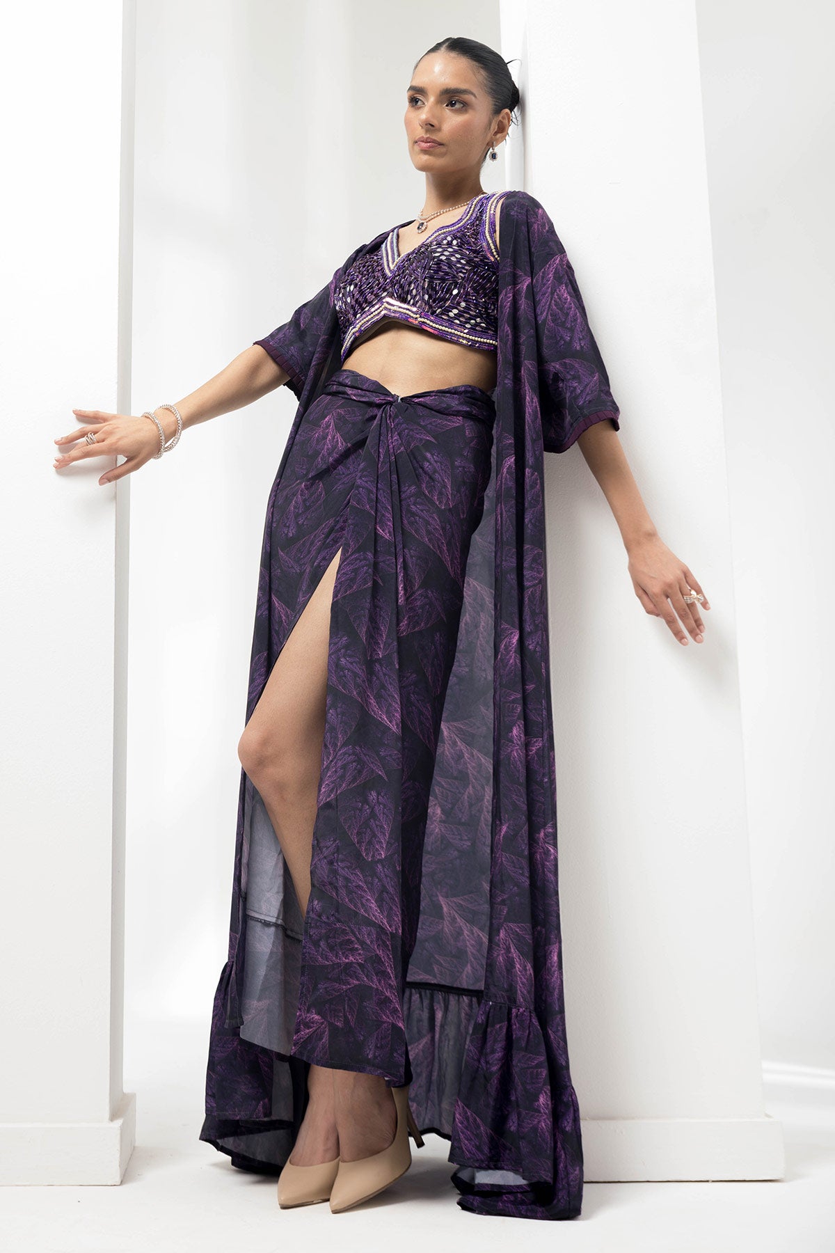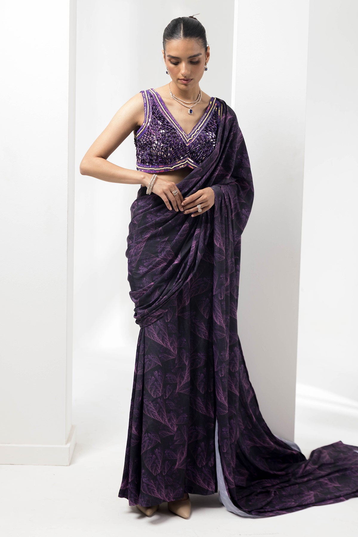 Featuring the wave ruffled pre-stiched saree, paired with printed flauna blouse adding to it the detailing of handwork