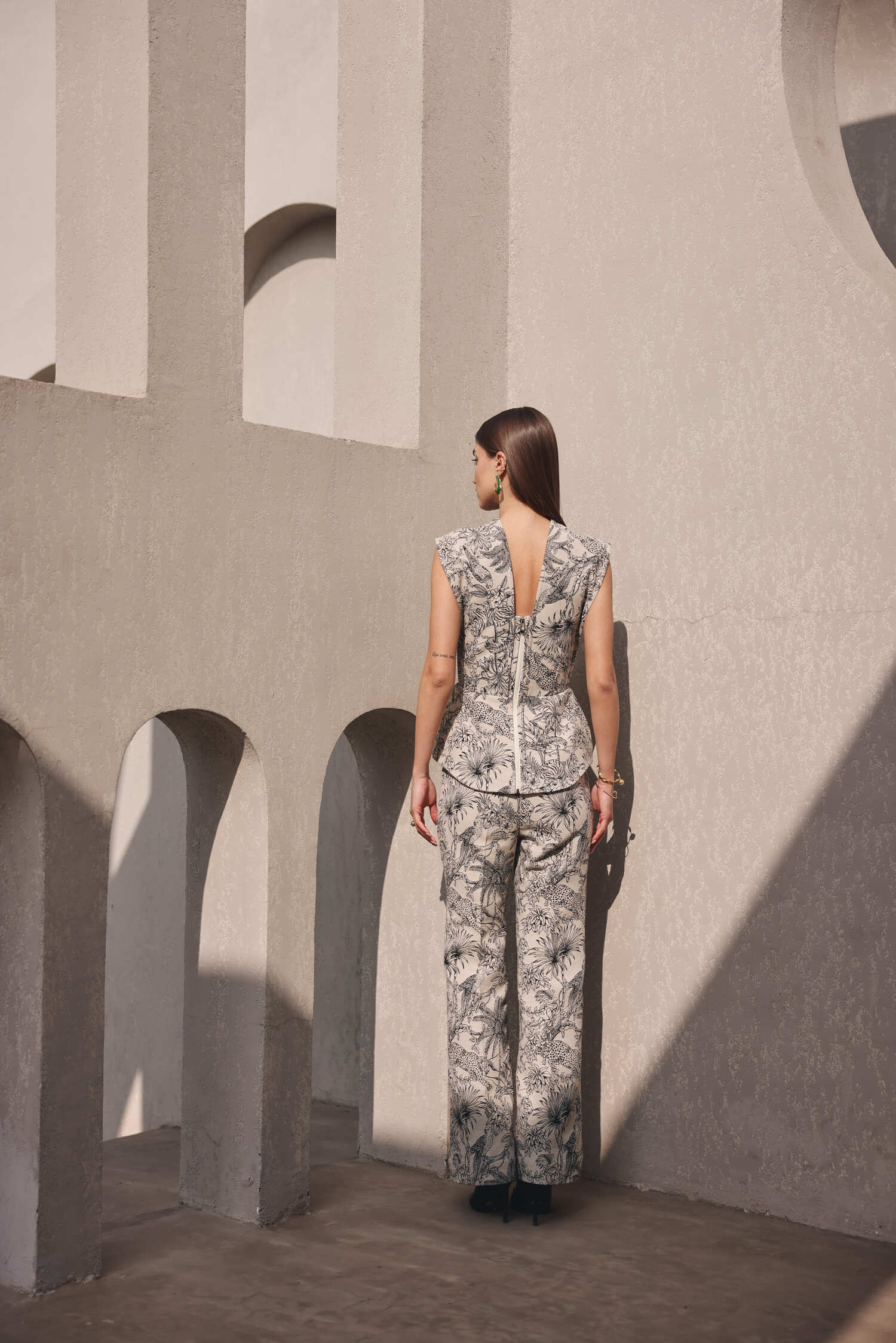 Featuring the archive vintage beige black peplum edgy top with enchanting silver button, paired with flaired leg pants