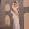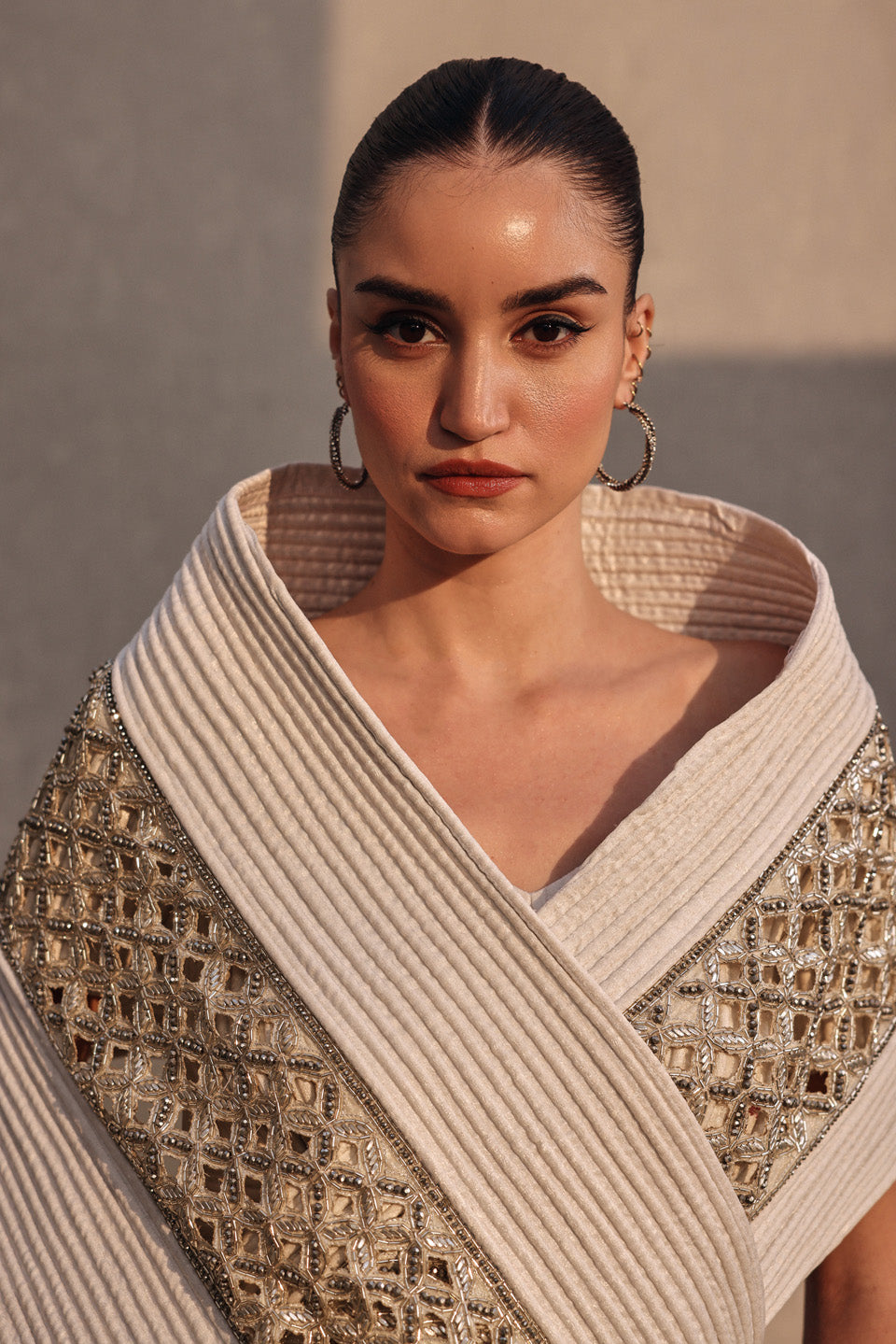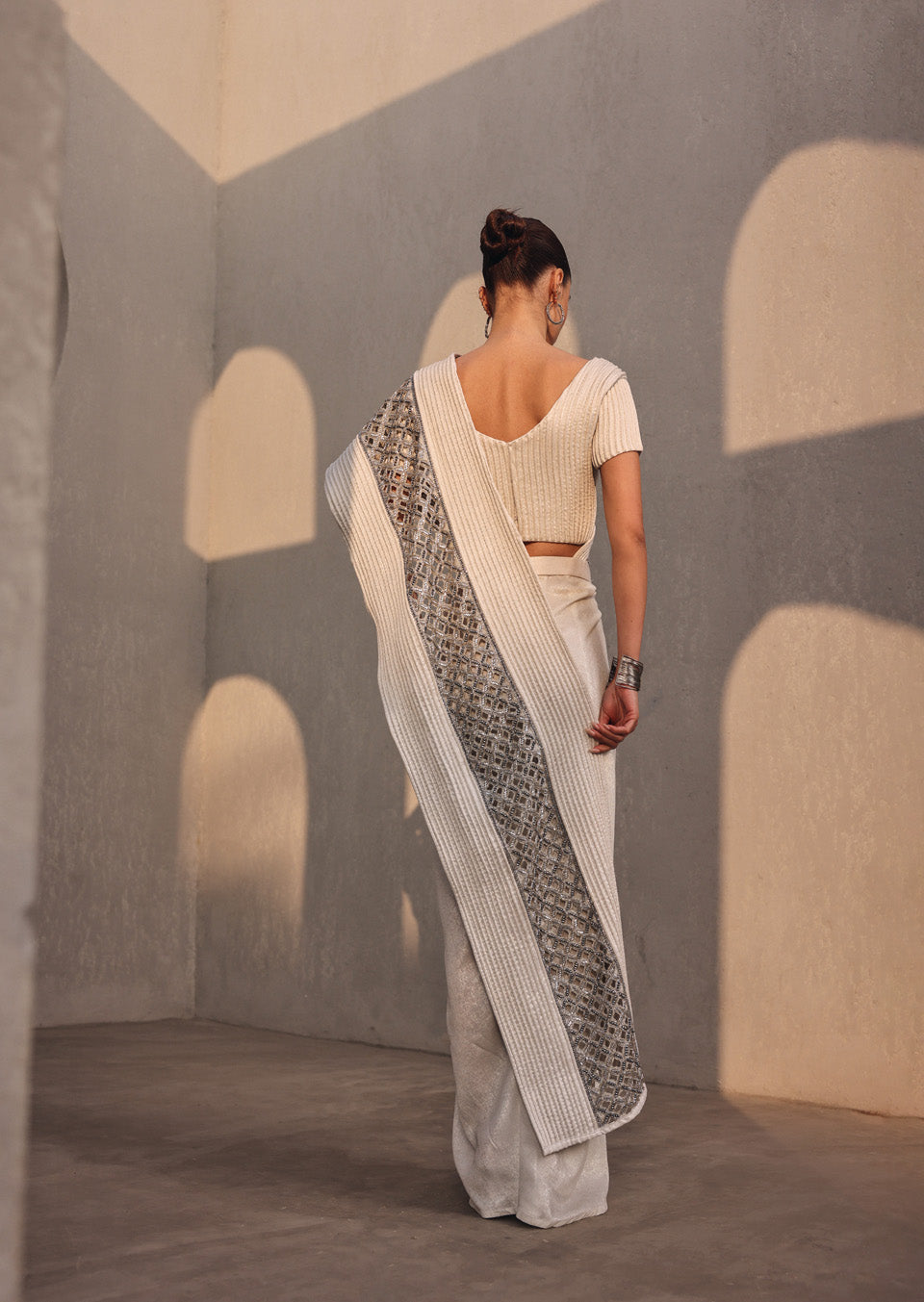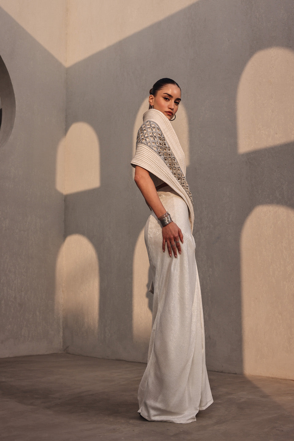 Featuring the signature cocktail drapes , this is a glam red dori embroidered cutwork handwork blended dori work pallu attached with pre-stiched drape and paired with a dori work blouse