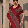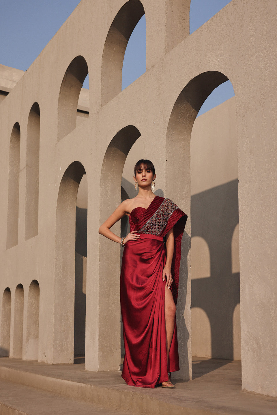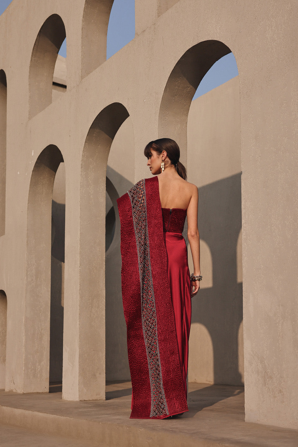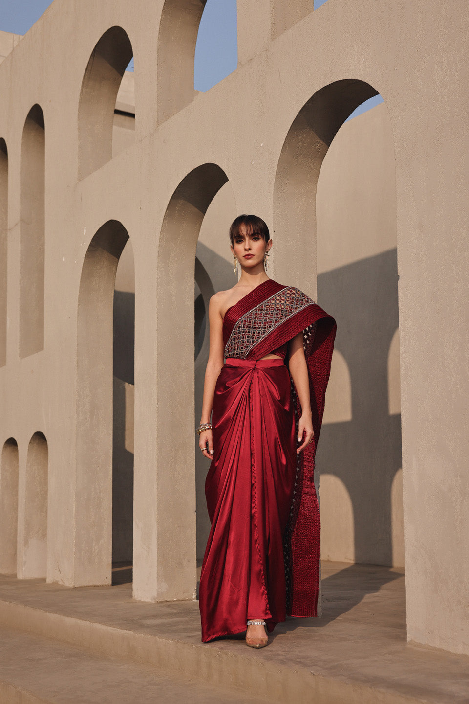 Featuring the signature cocktail drapes , this is a glam red dori embroidered cutwork handwork blended dori work pallu attached with pre-stiched drape and paired with a corset dori work blouse