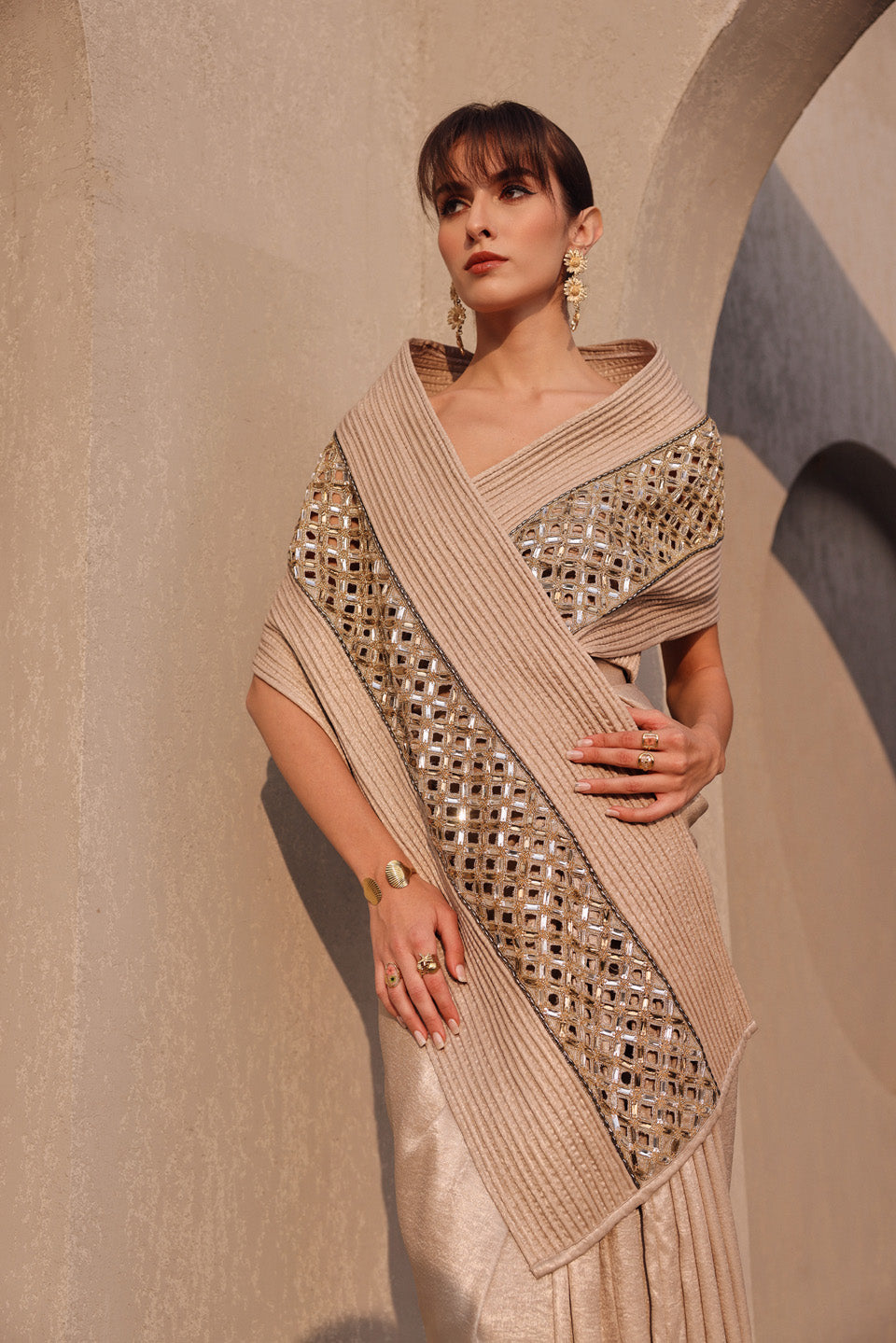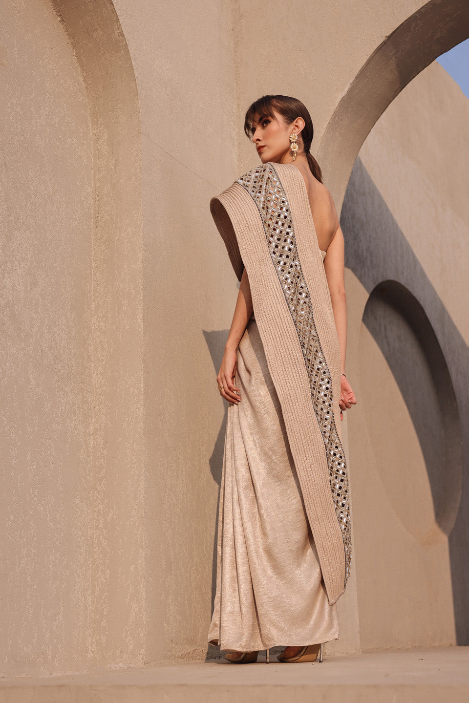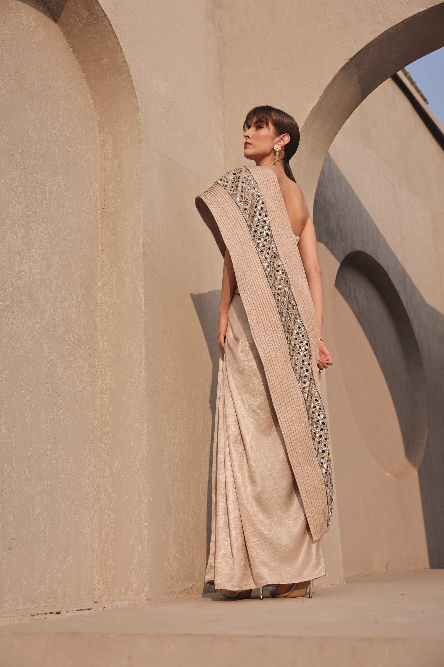 Ethereal metallic light gold dori embroidered pallu drape saree