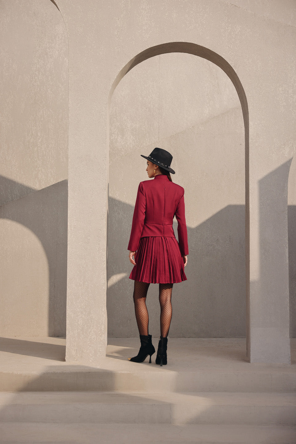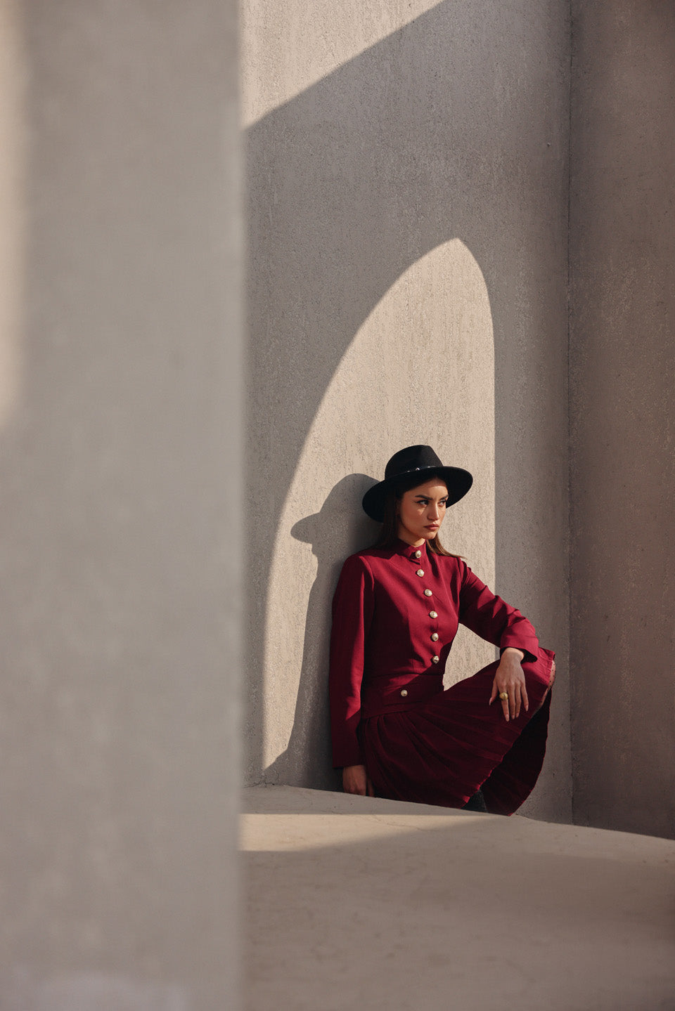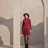 Featuring the fall season maroon red comfort fit dress , detailing with pleating skirt pannel, gold button .