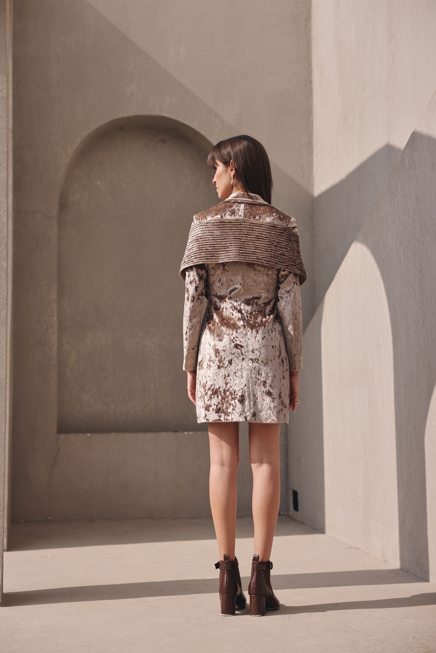 Featuring the champagne gold velvet dori blazer dress