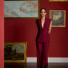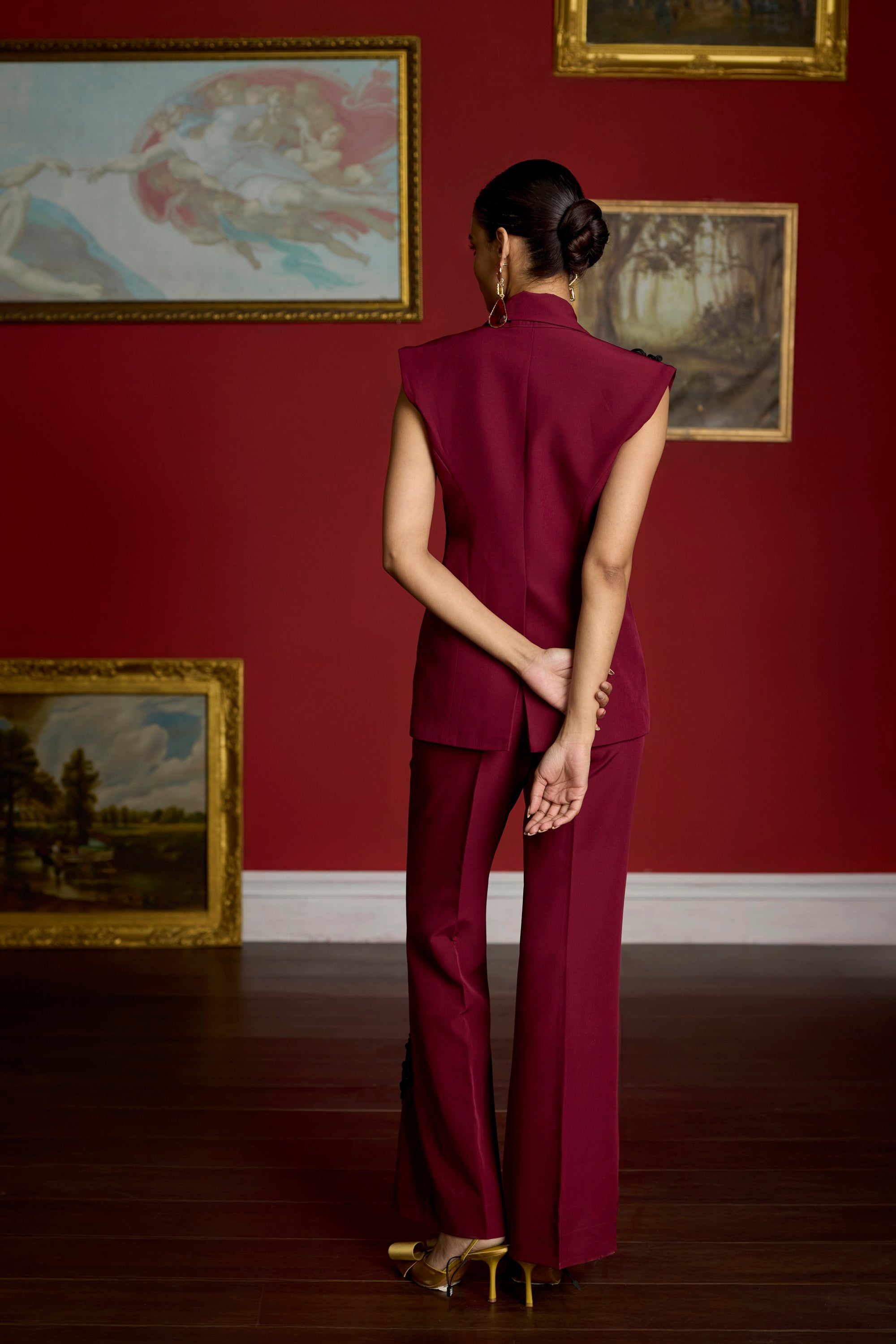 featuring the classic maroon sleeveless blazer set