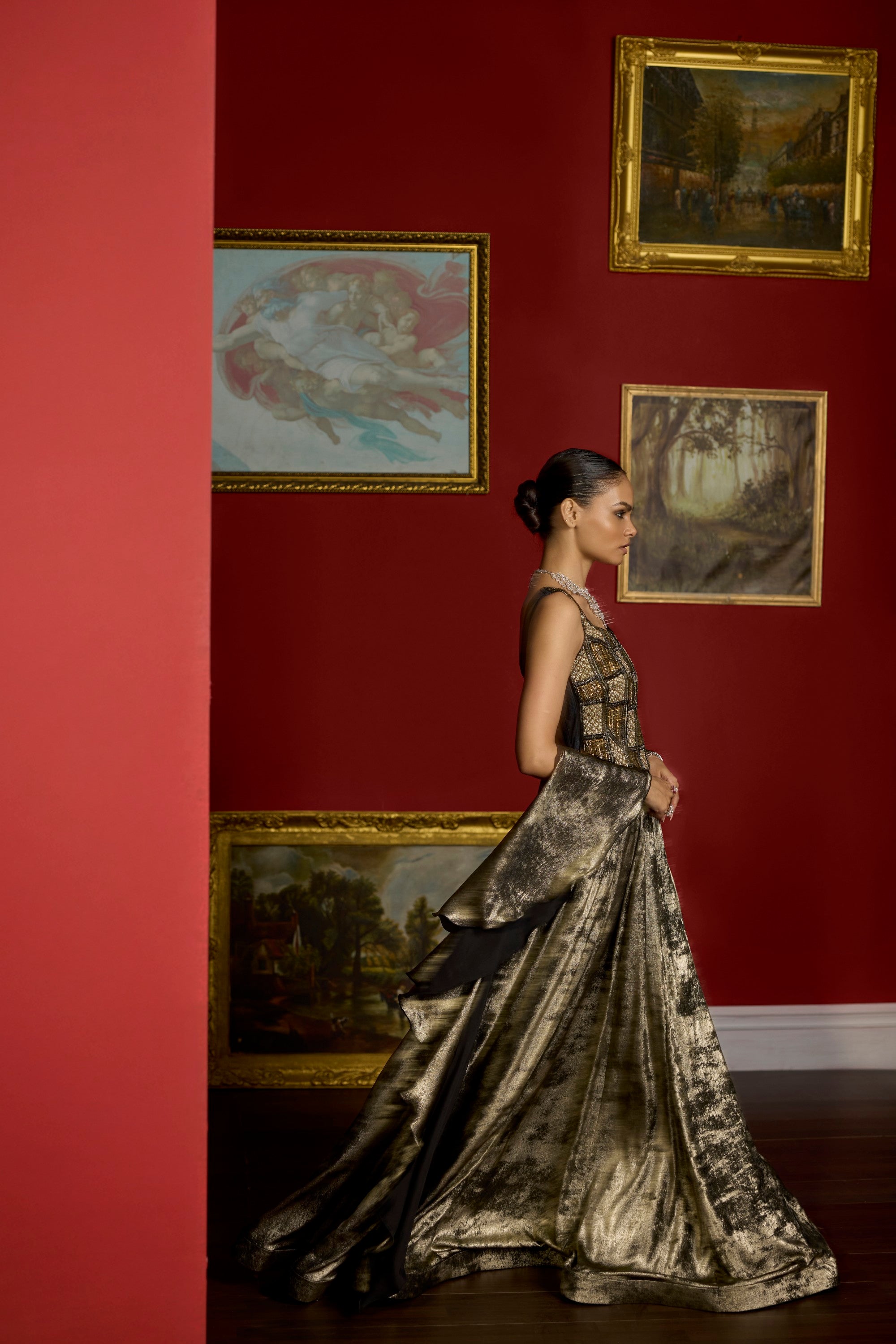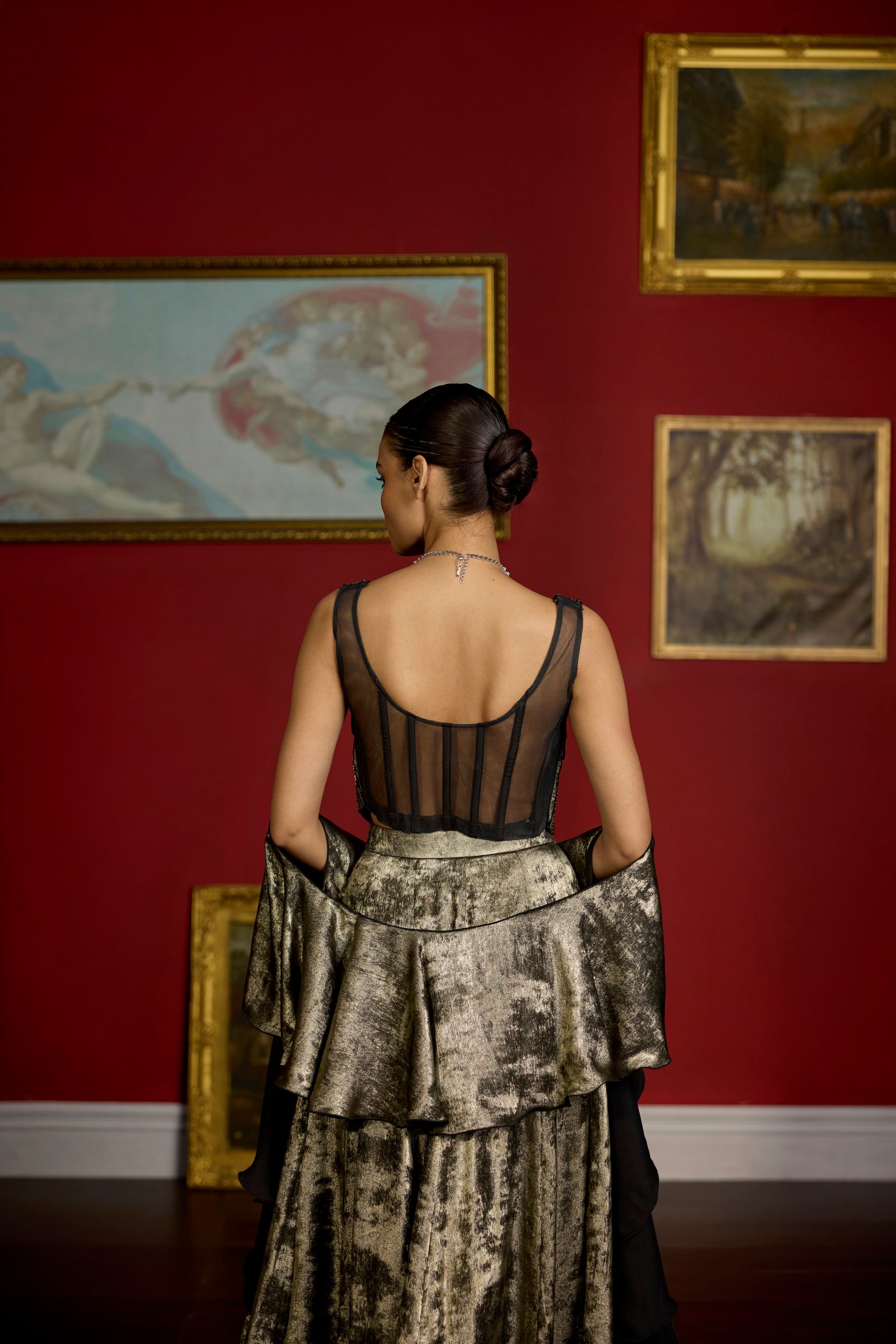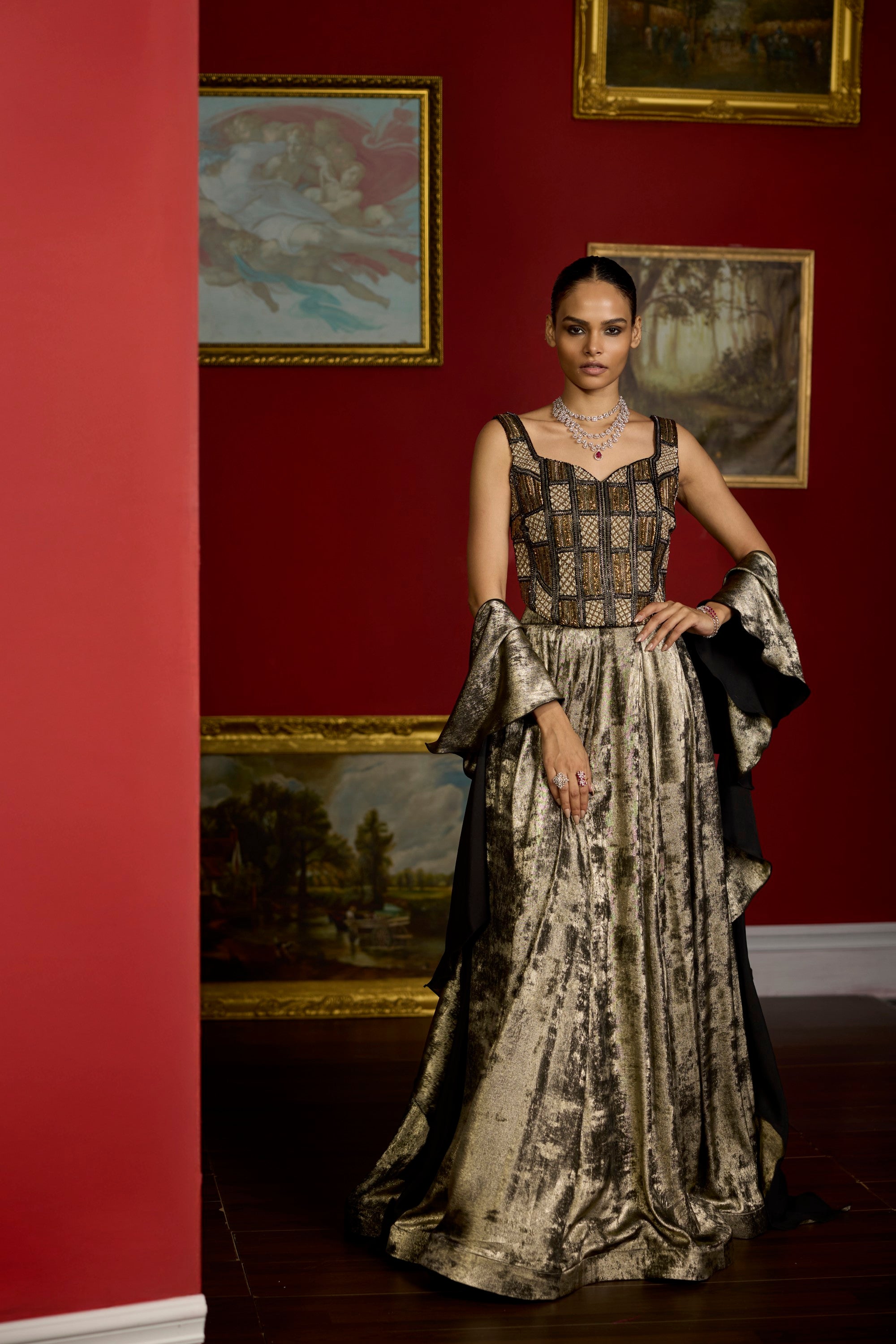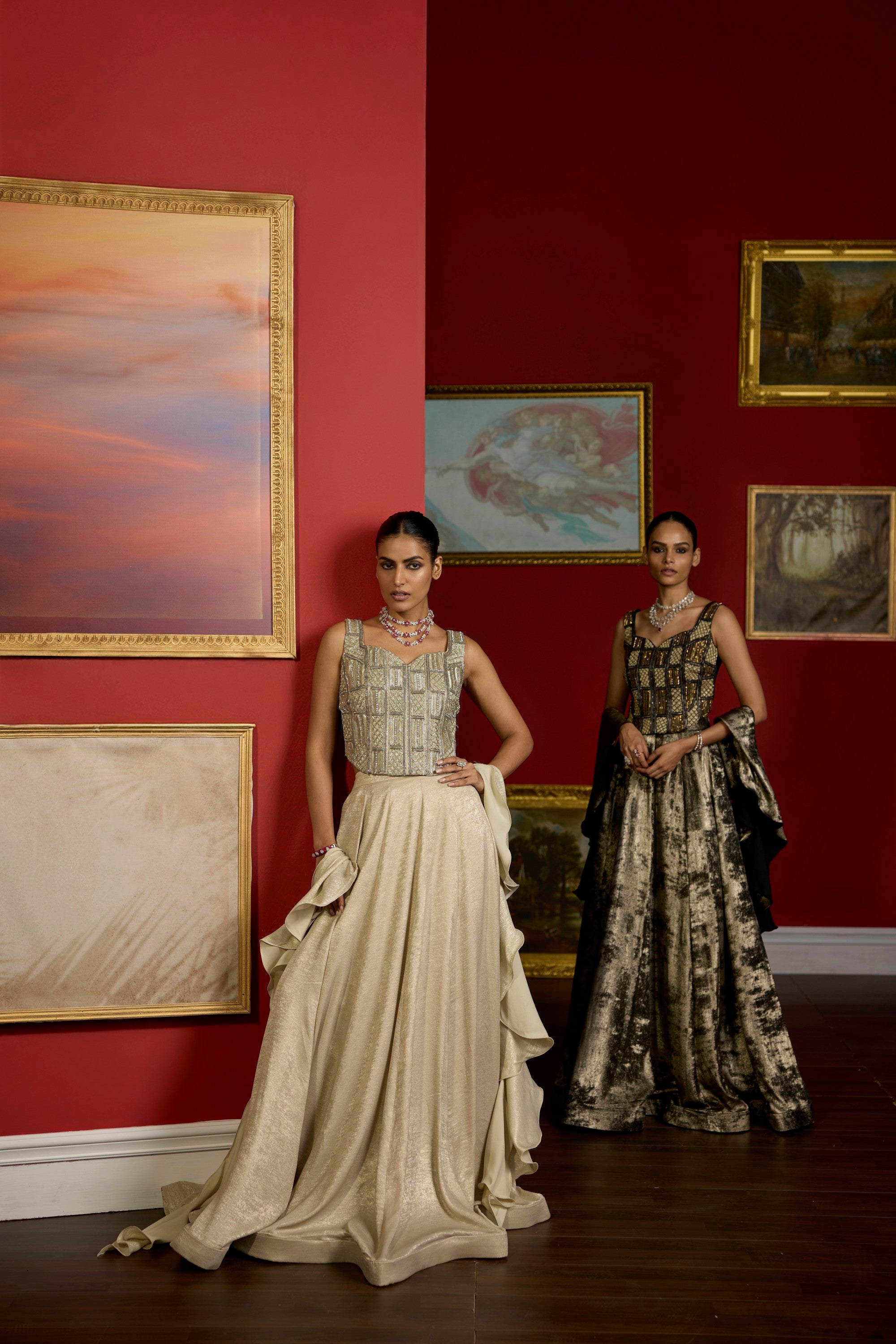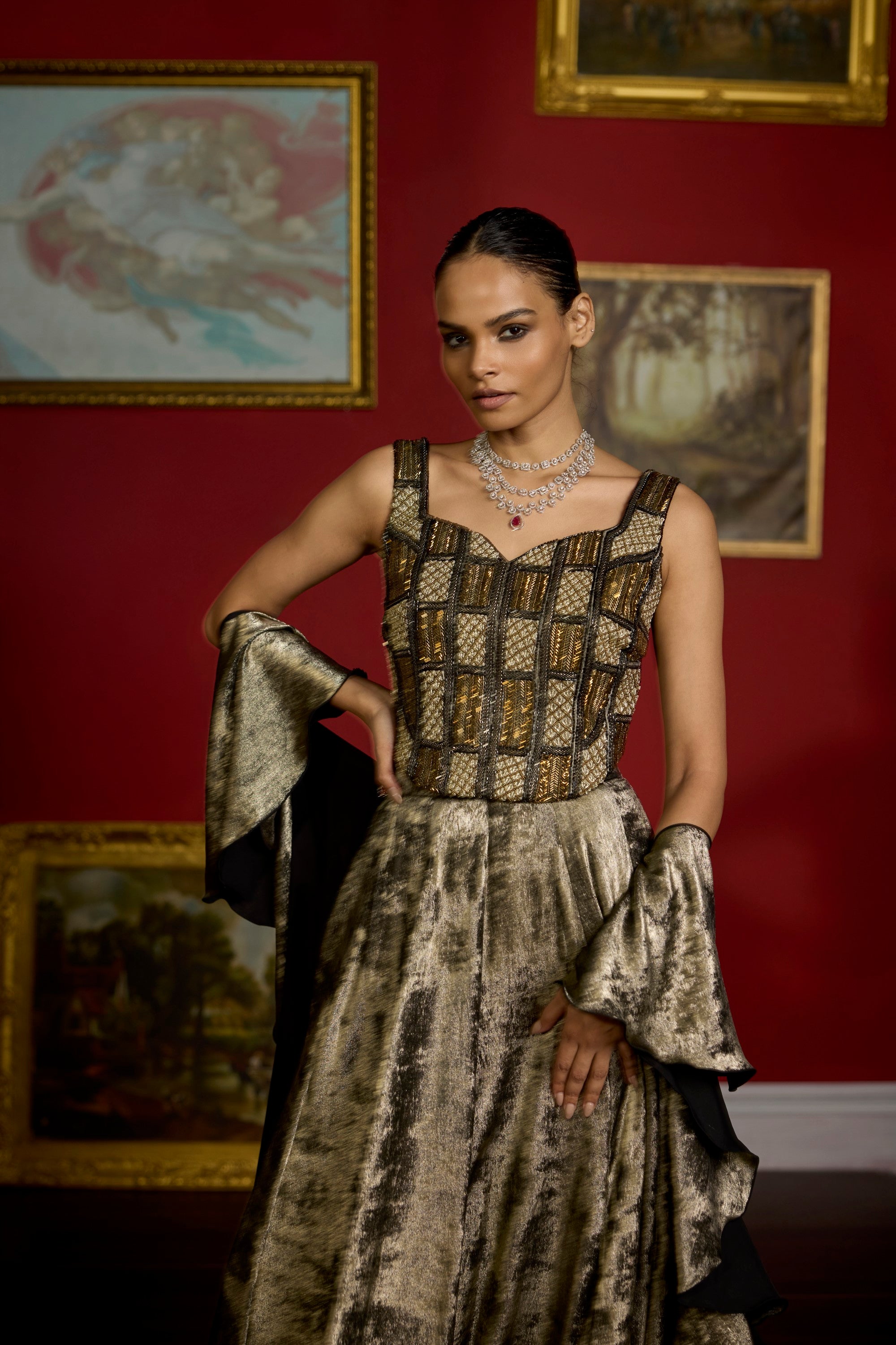 featuring festive exclusive handwork corset , high waisted ruffled lehenga and dupatta set.