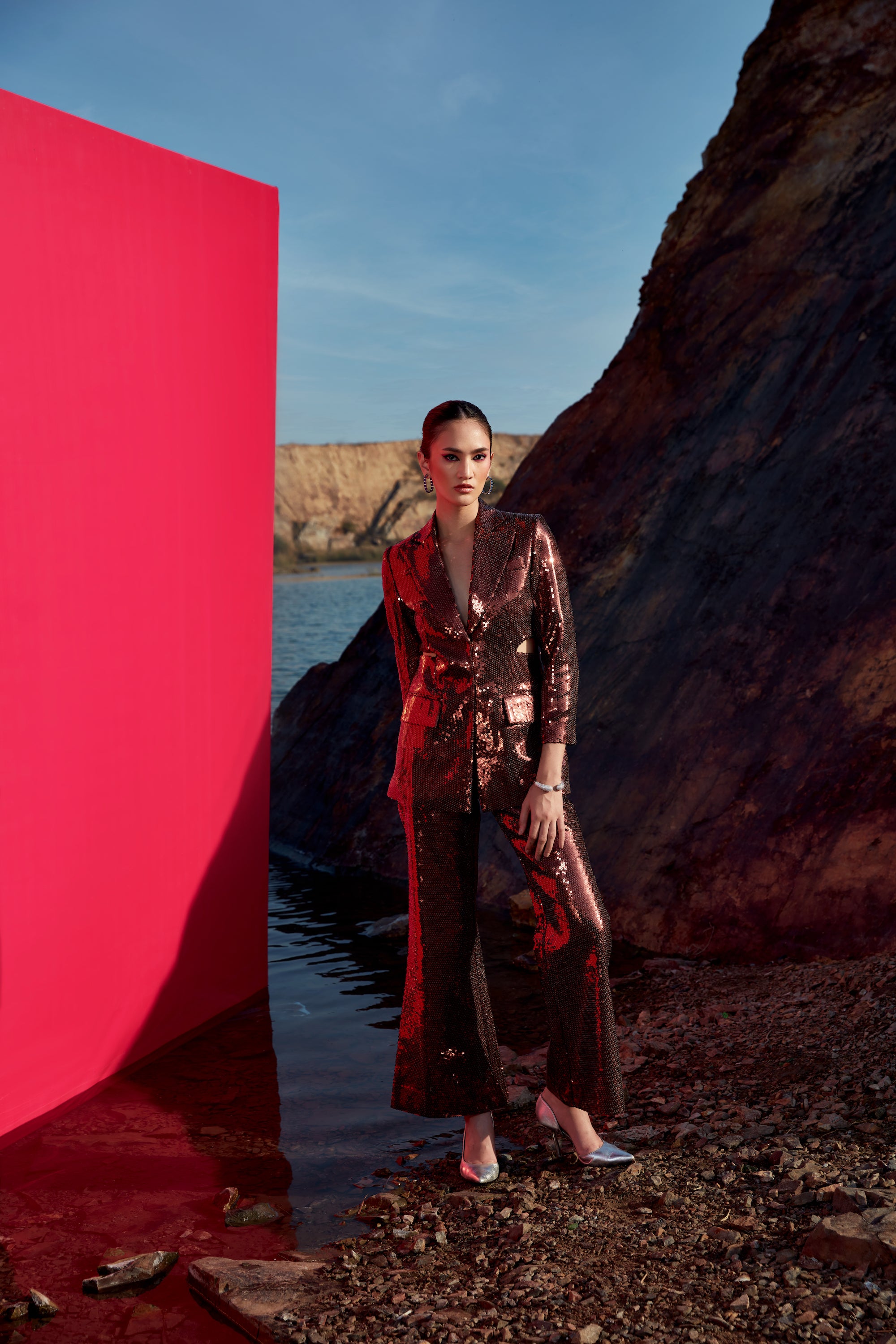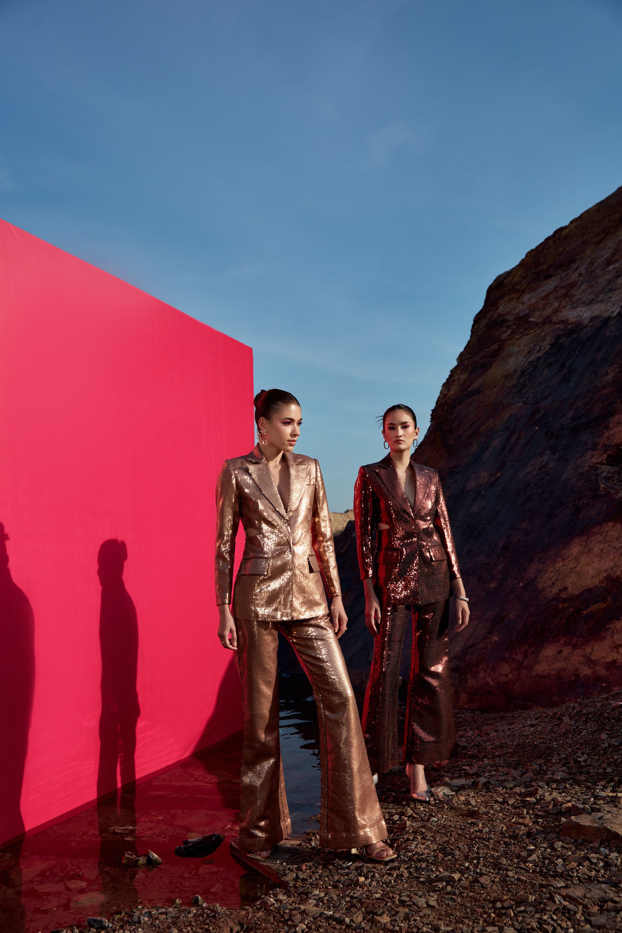 Dark copper-gold sequence side cut out blazer with flaired leg sequence pants
