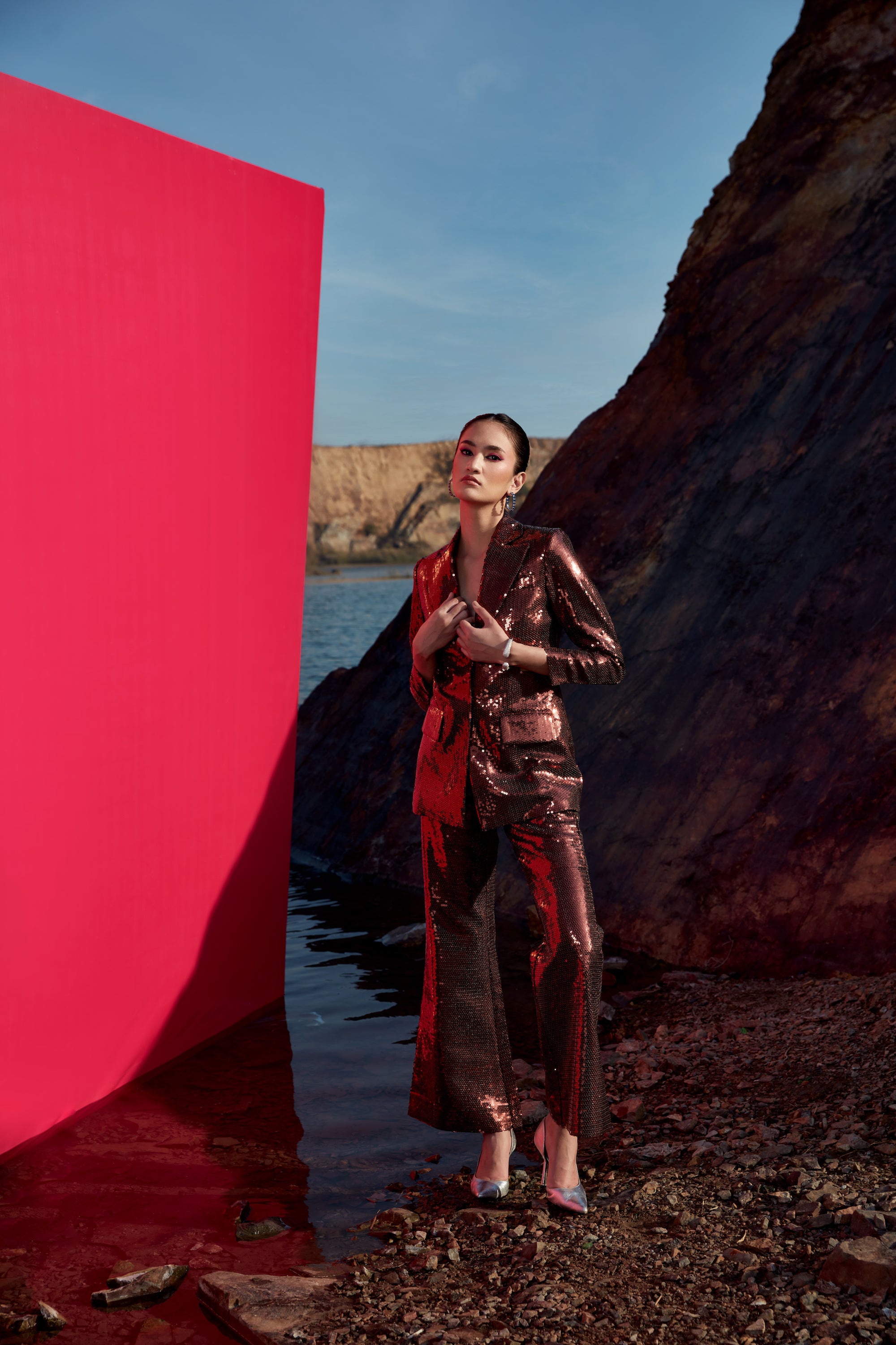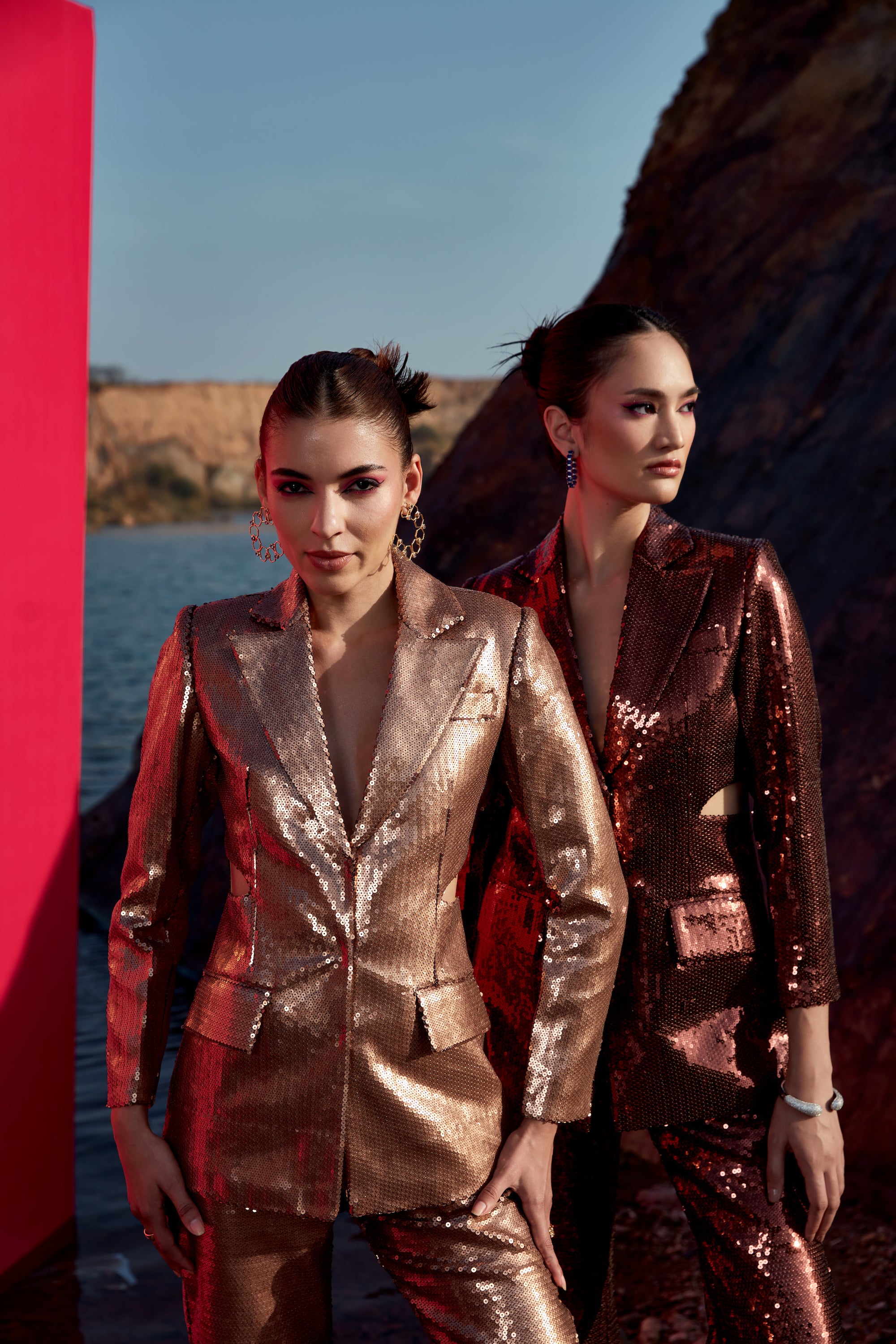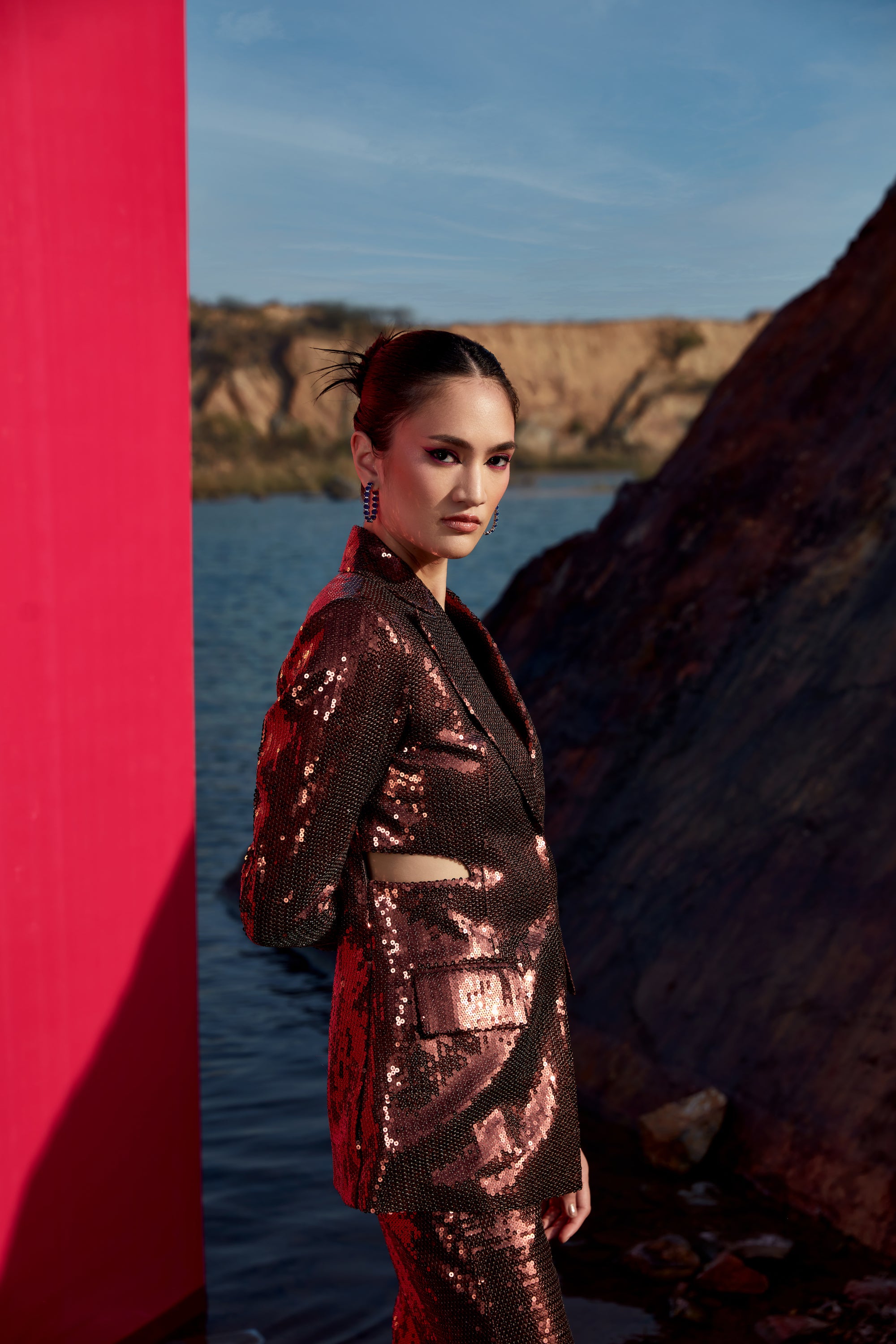 Dark copper -gold sequence cutout blazer set