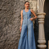 Featuring the buttoned denim flaired leg jumpsuit with handwork diamond stone work detailing.